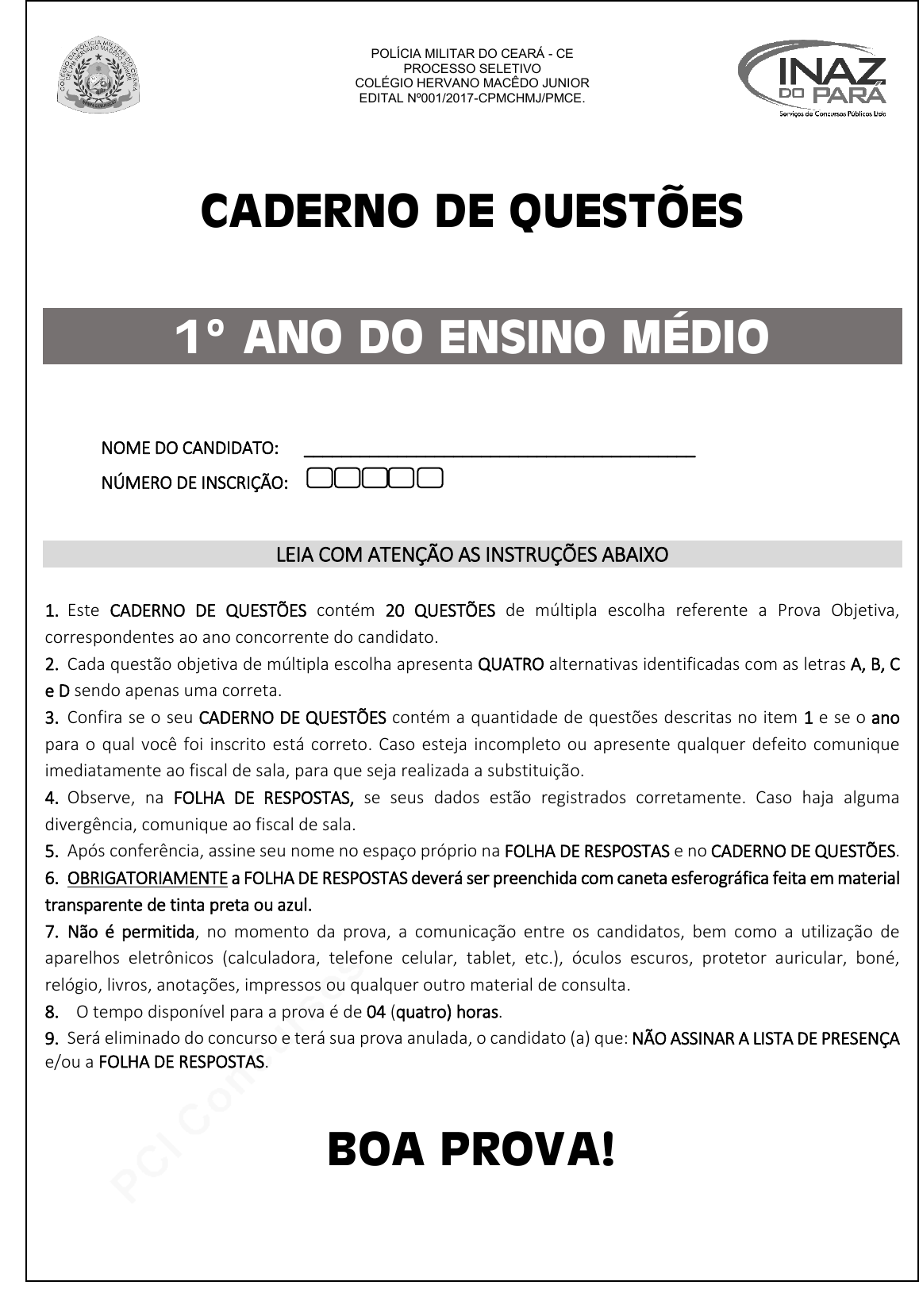 <p>pcimarkpci MjgwNDowMTRkOjQ0ODg6MGI5ZjpjOWM3OjY1MjQ6ZGQ2NDpmMjlh:V2VkLCAxNiBPY3QgMjAyNCAyMTowMTo1NCAtMDMwMA==</p><p>www.pciconcursos.com.br</p><p>POLÍCIA MILITAR DO CEARÁ - CE</p><p>PROCESSO SELETIVO</p><p>COLÉGIO HERVANO MACÊDO JUNIOR</p><p>EDITAL Nº001/2017-CPMCHMJ/PMCE.</p><p>CADERNO DE QUESTÕES</p><p>1º ANO DO ENSINO MÉDIO</p><p>NOME DO CANDIDATO: __________________________________________</p><p>NÚMERO DE INSCRIÇÃO:</p><p>LEIA COM ATENÇÃO AS INSTRUÇÕES ABAIXO</p><p>1. Este CADERNO DE QUESTÕES contém 20 QUESTÕES de múltipla escolha referente a Prova Objetiva,</p><p>correspondentes ao ano concorrente do candidato.</p><p>2. Cada questão objetiva de múltipla escolha apresenta QUATRO alternativas identificadas com as letras A, B, C</p><p>e D sendo apenas uma correta.</p><p>3. Confira se o seu CADERNO DE QUESTÕES contém a quantidade de questões descritas no item 1 e se o ano</p><p>para o qual você foi inscrito está correto. Caso esteja incompleto ou apresente qualquer defeito comunique</p><p>imediatamente ao fiscal de sala, para que seja realizada a substituição.</p><p>4. Observe, na FOLHA DE RESPOSTAS, se seus dados estão registrados corretamente. Caso haja alguma</p><p>divergência, comunique ao fiscal de sala.</p><p>5. Após conferência, assine seu nome no espaço próprio na FOLHA DE RESPOSTAS e no CADERNO DE QUESTÕES.</p><p>6. OBRIGATORIAMENTE a FOLHA DE RESPOSTAS deverá ser preenchida com caneta esferográfica feita em material</p><p>transparente de tinta preta ou azul.</p><p>7. Não é permitida, no momento da prova, a comunicação entre os candidatos, bem como a utilização de</p><p>aparelhos eletrônicos (calculadora, telefone celular, tablet, etc.), óculos escuros, protetor auricular, boné,</p><p>relógio, livros, anotações, impressos ou qualquer outro material de consulta.</p><p>8. O tempo disponível para a prova é de 04 (quatro) horas.</p><p>9. Será eliminado do concurso e terá sua prova anulada, o candidato (a) que: NÃO ASSINAR A LISTA DE PRESENÇA</p><p>e/ou a FOLHA DE RESPOSTAS.</p><p>BOA PROVA!</p><p>pcimarkpci MjgwNDowMTRkOjQ0ODg6MGI5ZjpjOWM3OjY1MjQ6ZGQ2NDpmMjlh:V2VkLCAxNiBPY3QgMjAyNCAyMTowMTo1NCAtMDMwMA==</p><p>www.pciconcursos.com.br</p><p>1 VESTIBULAR EAD 2017 | PEDAGOGIA</p><p>pcimarkpci MjgwNDowMTRkOjQ0ODg6MGI5ZjpjOWM3OjY1MjQ6ZGQ2NDpmMjlh:V2VkLCAxNiBPY3QgMjAyNCAyMTowMTo1NCAtMDMwMA==</p><p>www.pciconcursos.com.br</p><p>POLÍCIA MILITAR DO CEARÁ - CE</p><p>PROCESSO SELETIVO</p><p>COLÉGIO DA POLÍCIA MILITAR CORONEL HERVANO MACÊDO JUNIOR</p><p>EDITAL Nº001/2017-CPMCHMJ/PMCE.</p><p>2 1º Ano do Ensino Médio</p><p>LÍNGUA PORTUGUESA</p><p>TEXTO PARA AS QUESTÕES DE 01 E 02</p><p>Disponível: http://ctpocoes.blogspot.com.br/p/charges.html. Acesso em: 28 de nov. de 2017.</p><p>Na charge, há uma crítica a respeito:</p><p>(A) Do sistema educacional brasileiro.</p><p>(B) Das regras gramaticais.</p><p>(C) Do julgamento injusto que o povo faz dos políticos.</p><p>(D) Da demagogia dos políticos brasileiros.</p><p>Na charge, o menino disse que “O político falou uma mentira” é</p><p>um exemplo de pleonasmo porque essa figura de linguagem:</p><p>(A) É usada para atribuir nome a algo que não tem uma</p><p>nomenclatura própria.</p><p>(B) É usada para expressar redundância.</p><p>(C) É usada quando há contrariedade de ideais em uma mesma</p><p>frase.</p><p>(D) É usada para inverter a ordem natural das palavras na</p><p>oração.</p><p>TEXTO PARA AS QUESTÕES DE 03 E 04</p><p>“A máquina do papai batia tac-tac-tac... tac-tac-tac... O relógio</p><p>acordou em tin-dlen sem poeira. [...] . O guarda-roupa dizia o</p><p>quê? roupa- roupa- roupa. Não não. Entre o relógio, a máquina</p><p>e o silêncio havia uma orelha à escuta, grande, cor-de-rosa e</p><p>morta. Os três sons estavam ligados pela luz do dia e pelo ranger</p><p>das folhinhas da árvore que se esfregavam umas nas outras</p><p>radiantes.”</p><p>LISPECTOR. Clarice. Perto do coração selvagem. Rio de Janeiro: Rocco, 1998.</p><p>Nas palavras em destaque no texto, cuja autora é Clarice</p><p>Lispector, temos a figura de linguagem denominada:</p><p>(A) Elipse.</p><p>(B) Onomatopeia.</p><p>(C) Hipérbole.</p><p>(D) Paradoxo.</p><p>Em “Os três sons estavam ligados pela luz do dia e pelo ranger</p><p>das folhinhas da árvore que se esfregavam umas nas outras</p><p>radiantes.”, no trecho destacado, temos:</p><p>(A) Oração coordenada assindética.</p><p>(B) Oração subordinada adverbial.</p><p>(C) Oração subordinada substantiva.</p><p>(D) Oração subordinada adjetiva.</p><p>Leia o texto:</p><p>“Os direitos, tidos como sociais expostos no texto da</p><p>Constituição de 1988, têm a finalidade de nivelar as</p><p>desigualdades existentes em nossa nação, por isso a doutrina</p><p>afirma que a sua natureza jurídica é o direito a igualdade.”</p><p>Adaptado de ZANETTI, Tânia. Disponível em: http://www.conteudojuridico.com.br/artigo,os-direitos-sociais-garantia-de-</p><p>dignidade-do-ser-humano,45414.html. Acesso em: 30 de nov. de 2017.</p><p>No trecho em destaque, temos uma:</p><p>(A) Oração subordinada substantiva subjetiva.</p><p>(B) Oração subordinada substantiva apositiva.</p><p>(C) Oração subordinada substantiva objetiva direta.</p><p>(D) Oração subordinada substantiva completiva nominal.</p><p>Na frase “As evidências evidenciam o descaso evidente dos</p><p>governantes para com o povo.”, as palavras destacadas são,</p><p>respectivamente, classificadas como:</p><p>(A) Substantivo, verbo e adjetivo.</p><p>(B) Adjetivo, verbo e substantivo.</p><p>(C) Verbo, substantivo e advérbio.</p><p>(D) Adjetivo, verbo e substantivo.</p><p>TEXTO PARA AS QUESTÕES DE 07 E 08</p><p>“A tarde cai, por demais</p><p>Erma, úmida e silente…</p><p>A chuva, em gotas glaciais,</p><p>Chora monotonamente.”</p><p>BANDEIRA, Manuel. Fragmento do poema “Cartas de meu avô”. Disponível em: http://www.revistabula.com/564-os-10-</p><p>melhores-poe
