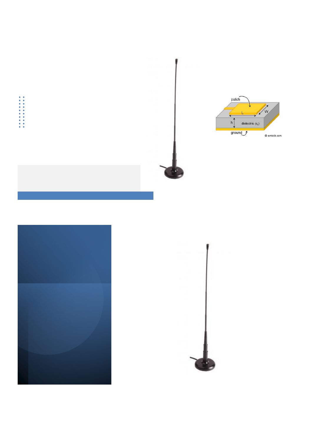 <p>20/04/2021</p><p>1</p><p>ANTENA</p><p>MONOPOLO</p><p>E ANTENA</p><p>MICROFITA</p><p>ANTENA</p><p>MONOPOLO</p><p>1</p><p>2</p><p>20/04/2021</p><p>2</p><p>Antenas lineares em presença de planos</p><p>condutores: o método das imagens</p><p>• Na prática, as antenas estão geralmente colocadas sobre ou a pouca</p><p>distância da terra ou de alguma outra superfície refletora.</p><p>• A presença destas superfícies pode alterar significativamente as propriedades</p><p>de radiação da antena assim como sua impedância de entrada.</p><p>Antenas lineares em presença de planos</p><p>condutores: o método das imagens</p><p>A figura mostra uma antena colocada a uma distância h acima</p><p>da terra. Para simplificar a análise, considera-se a terra como</p><p>um plano condutor perfeito.</p><p>• No ponto P1 chegam duas ondas:</p><p>uma vindo diretamente da antena</p><p>(onda direta) e outra que chega</p><p>após sofrer uma reflexão no ponto</p><p>R1 (onda refletida).</p><p>• A onda refletida pode ser vista</p><p>como uma onda emitida por uma</p><p>fonte virtual colocada a uma</p><p>distância h abaixo do plano de</p><p>terra</p><p>3</p><p>4</p><p>20/04/2021</p><p>3</p><p>Antenas lineares em presença de planos</p><p>condutores: o método das imagens</p><p>A direção das setas indica o sentido da corrente na</p><p>antena real e na antena imagem.</p><p>O Monopolo de Quarto de Onda</p><p>Consiste num fio metálico retilíneo, com comprimento igual</p><p>a λ/4, colocado sobre um plano condutor infinito (plano de</p><p>terra). O campo produzido na região acima do plano de</p><p>terra pelo monopolo e por sua imagem é o mesmo que seria</p><p>produzido por um dipolo de meia onda sem a presença do</p><p>plano de terra.</p><p>5</p><p>6</p><p>20/04/2021</p><p>4</p><p>O Monopolo de Quarto de Onda</p><p>O Monopolo de Quarto de Onda</p><p>7</p><p>8</p><p>20/04/2021</p><p>5</p><p>O Monopolo de Quarto de Onda</p><p>• Antenas do tipo monopolo têm larga aplicação prática, por exemplo, em radiodifusão, telefonia</p><p>móvel, radioamadorismo, etc. Na transmissão de rádio em ondas médias (de 300kHz a 3MHz), o</p><p>monopolo consiste numa torre alta colocada diretamente sobre a terra. Neste caso, para melhor</p><p>simular um plano metálico, geralmente a antena é instalada em regiões de solo úmido, de baixa</p><p>resistividade. Além disso, usa-se uma malha de terra feita com fios de cobre dispostos</p><p>radialmente a partir da base da antena (tipicamente 120 radiais de comprimento em torno de λ/4).</p><p>• Para monopolos instalados num veículo, a própria estrutura metálica deste atua como plano de terra.</p><p>Para obter um diagrama onidirecional, pode-se instalar a antena no teto do veículo. Caso se deseje</p><p>um diagrama direcional, é possível instalá-la nas laterais do veículo ou nos pára-choques.</p><p>• A alimentação do monopolo pode ser feita através de um cabo coaxial tendo seu condutor externo</p><p>conectado ao plano de massa e o condutor interno conectado ao fio metálico.</p><p>O Monopolo de Quarto de Onda</p><p>Em algumas aplicações, as configurações mostradas abaixo podem ser utilizadas.</p><p>O plano de terra circular tem diâmetro de cerca de meio comprimento de onda.</p><p>Na figura do centro, o plano circular foi substituído por quatro condutores radiais.</p><p>A inclinação destes condutores permite alterar os níveis de impedância e o</p><p>ângulo de cobertura dos diagramas verticais.</p><p>9</p><p>10</p><p>20/04/2021</p><p>6</p><p>ANTENA EM MICROSTRIP</p><p>ou</p><p>ANTENA EM MICROFITA</p><p>ou</p><p>ANTENA PLANAR</p><p>Sumário</p><p>• Descrição geral</p><p>• Configurações</p><p>• Vantagens e Desvantagens</p><p>• Aplicações</p><p>• Mecanismo de Radiação</p><p>• Alimentação</p><p>• Parâmetros</p><p>• Projeto Prático</p><p>11</p><p>12</p><p>20/04/2021</p><p>7</p><p>Descrição geral</p><p>• As primeiras ideias sobre antenas em microfita datam da década de 50, mas</p><p>foi a partir da década de 70 que os primeiros protótipos foram</p><p>efetivamente fabricados e utilizados.</p><p>• Em sua forma mais</p><p>simples, a antena em</p><p>microfita consiste de</p><p>uma placa condutora</p><p>sobre um plano de terra,</p><p>separados por um</p><p>substrato dielétrico.</p><p>Descrição geral</p><p>• A permissividade elétrica relativa do dielétrico deve ser baixa,</p><p>tipicamente menor que 2,5, para garantir que o dielétrico não interfira</p><p>muito na radiação do campo eletromagnético.</p><p>13</p><p>14</p><p>20/04/2021</p><p>8</p><p>Configurações de Antenas em Microfita</p><p>• Antenas em microfita podem ser fabricadas em muitas geometrias diferentes.</p><p>Pode-se dividi-las em três categorias básicas: patch, dipolos e fendas.</p><p>Tipo Patch (MPA – Microstrip Patch Antennas)</p><p>Configurações de Antenas em Microfita</p><p>Tipo Patch</p><p>15</p><p>16</p><p>20/04/2021</p><p>9</p><p>Configurações de Antenas em Microfita</p><p>Tipo Dipolo</p><p>O dipolo é impresso nos dois lados de uma placa dielétrica e alimentado por</p><p>uma linha de transmissão impressa.</p><p>Configurações de Antenas em Microfita</p><p>Tipo Fenda</p><p>Essa antena não possui plano de terra.</p><p>17</p><p>18</p><p>20/04/2021</p><p>10</p><p>Vantagens e Desvantagens</p><p>Vantagens:</p><p>• Antenas em microfita podem ser projetadas para uma faixa de frequências</p><p>de 100 MHz a 100 GHz, aproximadamente, o que significa uma grande</p><p>faixa de aplicação.</p><p>• Leve, fina, ajustável a superfícies diversas, barata, permite diferentes</p><p>polarizações, é compatível com circuitos integrados e o casamento de</p><p>impedância pode ser obtido durante o processo de fabricação.</p><p>Desvantagens:</p><p>• Largura de banda estreita, baixo ganho e baixa potência.</p><p>• No caso de conjuntos, a alimentação, para um bom desempenho, é</p><p>complexa, pois pode apresentar grande radiação, 
