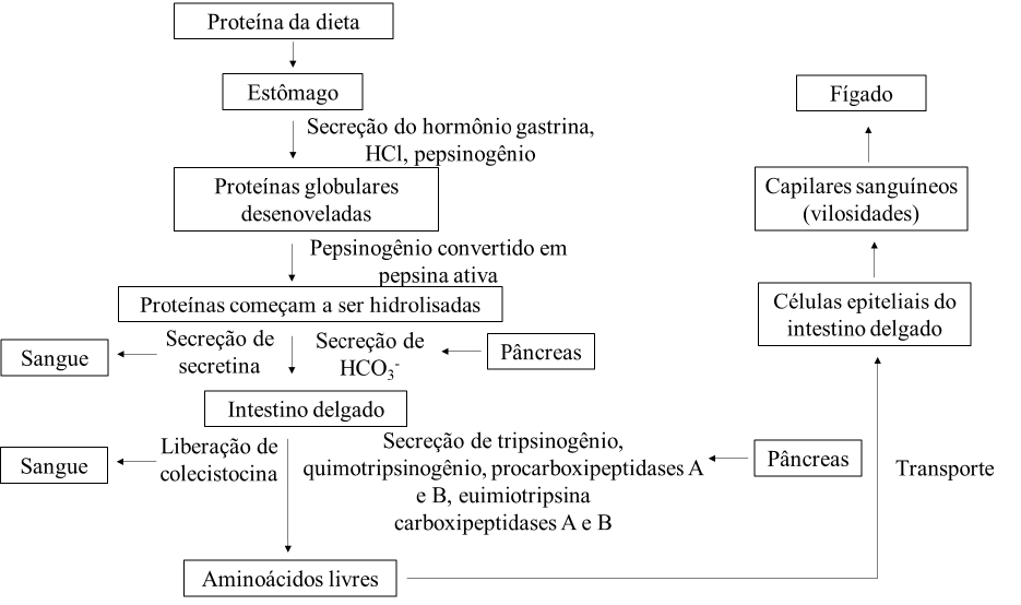 <p>1) Esquematize as etapas que ocorrem no processo de digestão de proteínas e absorção de aminoácidos, elencando de forma sistemática os compartimentos anatômicos/celulares, enzimas, hormônios e secreções, bem como os produtos dos processos.</p><p>2) O que justifica grande parte dos transportadores de aminoácidos, di e tripeptídeos serem ativos e codependentes de sódio?</p><p>Os transportadores de aminoácidos são ativos e codependentes de sódio pois acontecem contra o gradiente eletroquímico, com gasto de ATP, sendo conduzido pelo movimento do sódio a favor de seu gradiente.</p><p>3) Os transportadores de aminoácidos estão presentes apenas nos enterócitos? Justifique sua resposta.</p><p>Não. Existem transportadores de aminoácidos nos enterócitos, mas, como a maior partes dos aminoácidos é metabolizada no fígado, existem transportares de aminoácidos no fígado.</p><p>4) Porque o trato digestivo é altamente eficiente no processo absortivo de aminoácidos, di e tripeptídeos provenientes das proteínas ingeridas na dieta?</p><p>A Secreção de tripsinogênio, quimotripsinogênio, procarboxipeptidases A e B, euimiotripsina, carboxipeptidases A e B e outras enzimas pancreáticas como precursores inativos protege as células exócrinas da ação de proteínas que as destruiria. Assim, as enzimas produzidas são menos hidrolisadas, estando mais disponíveis para a hidrólise de proteínas da dieta. O pâncreas ainda se protege da autodigestão pela produção de um inibidor pancreático de tripsina, prevenindo a produção prematura de enzimas proteolíticas.</p><p>5) Como pode ser definido o turnover proteico?</p><p>Turnover proteico ou renovação proteica são os processos de síntese e a degradação normais de proteínas celulares.</p><p>6) Explique de forma sucinta como ocorre a síntese endógena de aminoácidos.</p><p>· Ciclo do Nitrogênio: Fixação de Nitrogênio atmosférico por bactérias fixadoras de nitrogênio, e conversão em amônia;</p><p>· A amônia é incorporada ao glutamato ou glutamina;</p><p>· Glutamato e glutamina doam nitrogênio para outras biomoléculas, intermediários da glicólise, do ciclo do ácido cítrico ou via das pentoses-fosfatos.</p><p>7) O que acontece nas reações de transaminação? Em que contexto estas reações ocorrem e, clinicamente, como a atividade das transaminases pode ser interpretada?</p><p>A reação de transaminação é a primeira etapa do catabolismo de L-aminoácidos, na qual os grupos α-amino são removidos por catálise enzimática das transaminases. Ela ocorre quando os L-aminoácidos chegam ao fígado. As transaminases são responsáveis por transferir o grupo amino do L-aminoácido para α-cetoglutarato. O aminoácido liga-se ao sítio ativo, doa seu grupo amino ao cofator enzimático e sai do sítio ativo da forma de α-cetoácido. O outro α-cetoácido, substrato, entra no sítio ativo, recebe o grupo amino do cofator e sai do sítio ativo na forma de outro aminoácido (L-glutamato).</p><p>8) O esqueleto carbônico dos aminoácidos pode ser utilizado de várias maneiras, mas chama atenção sua capacidade de contribuir para a produção de energia. Por que isso é possível?</p><p>A transaminação de L-glutamato gera α-cetoácidos, que são precursores das vias metabólicas centrais. α-cetoácidos são capazes fornecem unidades de três e quatro carbonos que podem ser convertidas, pela gliconeogênese, em glicose, o combustível para o cérebro, para o músculo esqueléBco e para outros tecidos. Os esqueletos de carbono da maioria dos aminoácidos encontrando uma via para o ciclo do ácido cítrico.</p><p>9) Por que é preferível excretar o nitrogênio na forma de ureia? Como ela é formada e qual é a via de eliminação principal?</p><p>A amônia é tóxica e, portanto, é convertida em uréia, não tóxica, antes de ser exportada dos tecidos extra-hepáticos para o sangue e transportada para o fígado e para os rins. A ureia é formada no ciclo da ureia, que inicia-se nas mitocôndrias hepáticas pela produção de carbamoil-fosfato. Outras quatro etapas ocorrem no citosol, até a formação uréia. A ureia passa para a circulação sanguínea e chega aos rins, sendo excretada na urina.</p><p>10) Inúmeros processos patológicos estão associados a distúrbios em uma ou mais etapas do processo de digestão, absorção e metabolização de aminoácidos. Pesquise na literatura um de sua preferência e descreva suas características, principalmente no que diz respeito aos marcadores bioquímicos que evidenciam e contribuem para o diagnóstico deste distúrbio.</p><p>Fenilcetonúria. Defeito genético na enzima fenilalanina-hidroxilase, umas das enzimas responsáveis pela conversão de fenilalanina em tirosina, causa aumento da quantidade de fenilalanina no sangue. A fenilalanina é convertida a fenilpiruvato e ambos são excretados na urina. Parte do fenolpiruvato é convertido em fenilacetato, causando odor na urina característico da doença, sendo utilizado para detectar a doença em bebês. O acúmulo de fenilalanina causa mal desenvolvimento do encéfalo, causando retardo mental. O excesso de fenilalanina compete com outros aminoácidos pelo transporte na barreira hemato-encefálica, causando déficit de metabólitos.</p><p>image1.png</p>
