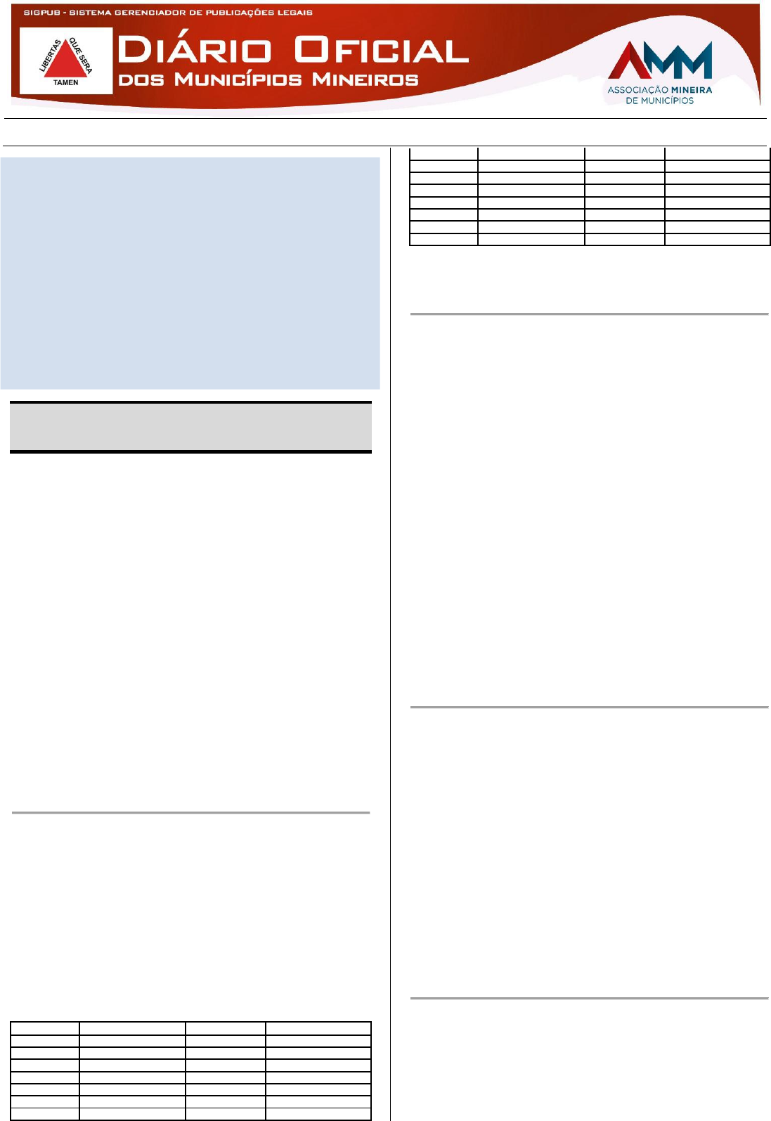 <p>Minas Gerais , 16 de Outubro de 2024 • Diário Oficial dos Municípios Mineiros • ANO XVI | Nº 3877</p><p>www.diariomunicipal.com.br/amm-mg 1</p><p>Expediente:</p><p>Associação Mineira de Municípios – AMM - MG</p><p>Presidente – Marcos Vinicius Da Silva Bizarro - Coronel Fabriciano</p><p>1º Vice-Presidente – Hideraldo Henrique Silva - Boa Esperança</p><p>2º Vice-Presidente –Luís Eduardo Falcão Ferreira - Patos de Minas</p><p>3º Vice-Presidente – Luiz Fernando Alves – Itamarandiba</p><p>4º Vice-Presidente – Edson De Souza Vilela – Carmo do Cajuru</p><p>1º Secretário - Wirley Rodrigues Reis - Itapecerica</p><p>2º Secretário - Célio Santana - Buenópolis</p><p>1º Tesoureira - Luiza Maria Lima Menezes - Nepomuceno</p><p>2º Tesoureiro - John Wercolis De Morais – Pratinha</p><p>O Diário Oficial dos Municípios do Estado de Minas Gerais é uma solução</p><p>voltada à modernização e transparência da gestão municipal.</p><p>ESTADO DE MINAS GERAIS</p><p>ASSOCIAÇÃO DOS MUNICÍPIOS DA MICRORREGIÃO DO</p><p>VALE DO PARANAÍBA AMVAP</p><p>SETOR ADMINISTRATIVO, CONTRATOS E CONVÊNIOS</p><p>CIDES – AVISO DE PUBLICAÇÃO DE GABARITO</p><p>PRELIMINAR E CADERNO DE QUESTÕES – EDITAL DE</p><p>PROCESSO SELETIVO SIMPLIFICADO 004/2024</p><p>O Consórcio Público Intermunicipal de Desenvolvimento Sustentável</p><p>do Triângulo Mineiro e Alto Paranaíba-CIDES, em cumprimento do</p><p>princípio da publicidade, torna público para conhecimento dos</p><p>interessados os gabaritos preliminares, bem como os cadernos de</p><p>questões das provas objetivas do Processo Seletivo Simplificado</p><p>004/2024, para os cargos de Analista Ambiental e Geógrafo já estão</p><p>disponíveis no site do CIDES. A solicitação dos espelhos de prova</p><p>pode ser realizada pelo e-mail psscides@gmail.com até o dia</p><p>20/10/2024. Mais informações podem ser obtidas junto ao Setor de</p><p>Recursos Humanos pelo telefone (34)3254-9617.</p><p>Uberlândia/MG, 15 de outubro de 2024</p><p>ALEANDRO FRANCISCO DA SILVA</p><p>Presidente do CIDES</p><p>Publicado por:</p><p>Darciane Medeiros Oliveira</p><p>Código Identificador:8B2CD77D</p><p>SETOR ADMINISTRATIVO, CONTRATOS E CONVÊNIOS</p><p>CIDES – GABARITO PRELIMINAR DA PROVA OBJETIVA –</p><p>GEÓGRAFO – PSS 04/2024</p><p>EDITAL Nº 004/2024 - PROCESSO SELETIVO PÚBLICO</p><p>SIMPLIFICADO DESTINADO À CONTRATAÇÃO PARA</p><p>VAGA E FORMAÇÃO DE CADASTRO DE RESERVA, POR</p><p>EXCEPCIONAL INTERESSE PÚBLICO, NO CONSÓRCIO</p><p>PUBLICO INTERMUNICIPAL DE DESENVOLVIMENTO</p><p>SUSTENTÁVEL DO TRIÂNGULO MINEIRO E ALTO</p><p>PARANAÍBA - CIDES.</p><p>CARGO: GEÓGRAFO</p><p>Questão Resposta Correta Questão Resposta Correta</p><p>1 A 16 B</p><p>2 C 17 B</p><p>3 A 18 B</p><p>4 B 19 C</p><p>5 B 20 E</p><p>6 D 21 E</p><p>7 D 22 A</p><p>8 E 23 A</p><p>9 C 24 A</p><p>10 D 25 E</p><p>11 E 26 B</p><p>12 A 27 D</p><p>13 C 28 D</p><p>14 E 29 E</p><p>15 D 30 C</p><p>Publicado por:</p><p>Darciane Medeiros Oliveira</p><p>Código Identificador:0DBC15AE</p><p>SETOR DE LICITAÇÕES</p><p>AMVAP – EXTRATO DO CONTRATO 020/2024.</p><p>Extrato do Contrato 020/2024. Contratante: Associação dos</p><p>Municípios da Microrregião do Vale do Paranaíba - AMVAP, CNPJ</p><p>nº 21.236.948/0001-10. Contratada: Mapdata Tecnologia,</p><p>Informática e Comércio Ltda, CNPJ 66.582.784/0001-11, para</p><p>contratação de licenças de assinatura do software Autodesk</p><p>Architecture, Engineering & Construction Collection, incluso</p><p>Autodesk Autocad, versão completa pelo período de 12 meses e</p><p>serviço de capacitação e implantação (instalação) de solução para a</p><p>prática do BIM (Building Information Modeling) para os softwares</p><p>contratados.. Com suporte da empresa para esclarecimentos de</p><p>dúvidas, não configurando consultoria, enquanto durar a contratação.</p><p>Valor do contrato: R$ 88.850,00 (oitenta e oito mil, oitocentos e</p><p>cinquenta reais). Fundamento: Processo Licitatório nº 016/2024 –</p><p>Pregão Eletrônico nº 001/2024. Vigência: de 01/10/2024 a</p><p>01/10/2025.</p><p>Uberlândia-MG, 01 de Outubro de 2024.</p><p>RENATA CRISTINA SILVA BORGES -</p><p>Presidente da AMVAP.</p><p>Publicado por:</p><p>Darciane Medeiros Oliveira</p><p>Código Identificador:1C5A87E4</p><p>SETOR DE LICITAÇÕES</p><p>AMVAP – EXTRATO DO DÉCIMO TERMO ADITIVO AO</p><p>CONTRATO 004/2019.</p><p>Extrato do Décimo termo aditivo ao contrato 004/2019. Contratante:</p><p>Associação dos Municípios da Microrregião do Vale do Paranaíba -</p><p>AMVAP, CNPJ nº 21.236.948/0001-10. Contratada: 3A Tecnologia</p><p>e Soluções em Segurança Ltda, CNPJ nº 18.441.471/0001-09. Objeto:</p><p>prorrogação da vigência do contrato nº 04/2019, datado de 26 de</p><p>março de 2019, que passará a ter pleno vigor de 29/09/2024 a</p><p>30/12/2024.</p><p>Uberlândia, 24 de Setembro de 2024.</p><p>RENATA CRISTINA SILVA BORGES -</p><p>Presidente da AMVAP.</p><p>Publicado por:</p><p>Darciane Medeiros Oliveira</p><p>Código Identificador:899E129F</p><p>SETOR DE LICITAÇÕES</p><p>DESPACHO DE AUTORIZAÇÃO DE CONTRATAÇÃO</p><p>DIRETA</p><p>Considerando os atos até aqui praticados e as justificativas anexas,</p><p>AUTORIZO o ato de dispensa de licitação do Processo de Despesa</p><p>de Pequeno Valor nº 93/2024, nos termos do art. 95, § 2º da Lei</p><p>Federal nº 14.133/2.021. O Consórcio Público Intermunicipal de</p><p>Minas Gerais , 16 de Outubro de 2024 • Diário Oficial dos Municípios Mineiros • ANO XVI | Nº 3877</p><p>www.diariomunicipal.com.br/amm-mg 2</p><p>Saúde do Triângulo Mineiro – Amvap Saúde, inscrito no CNPJ</p><p>18.151.467/0001-06, representado neste ato pelo seu Presidente, torna</p><p>público que será contratado o fornecedor LPG Tecnologia em Saúde</p><p>para aquisição de um cabo ECG do desfibrilador 3 vias , conforme</p><p>informações seguintes:</p><p>A empresa a ser contratada LPG Tecnolog