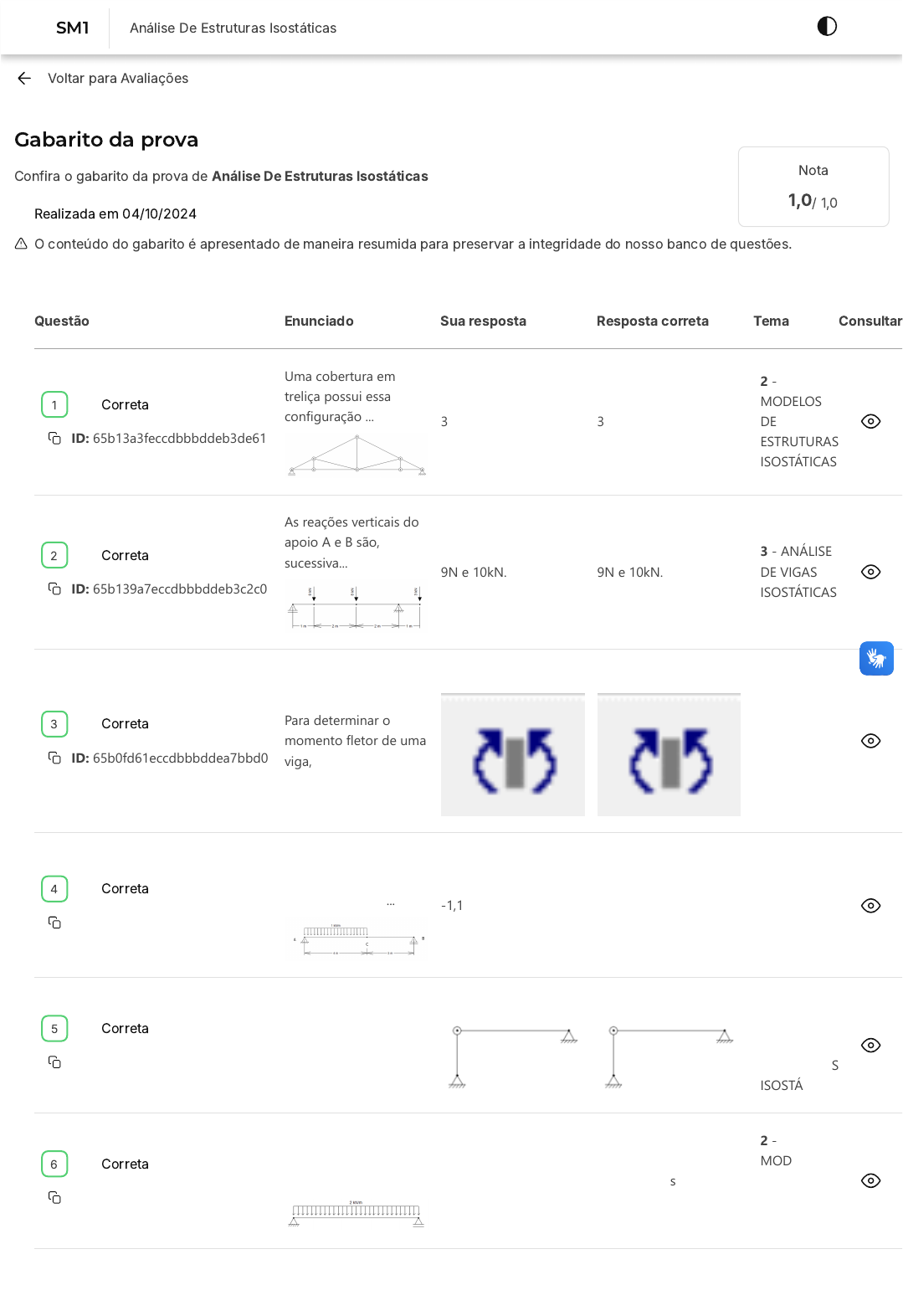 <p>Voltar para Avaliações</p><p>Gabarito da prova</p><p>Confira o gabarito da prova de Análise De Estruturas Isostáticas</p><p>Realizada em 04/10/2024</p><p>Nota</p><p>1,0/ 1,0</p><p>O conteúdo do gabarito é apresentado de maneira resumida para preservar a integridade do nosso banco de questões.</p><p>Questão Enunciado Sua resposta Resposta correta Tema Consultar</p><p>Correta</p><p>ID: 65b13a3feccdbbbddeb3de61</p><p>Uma cobertura em</p><p>treliça possui essa</p><p>configuração ... 3 3</p><p>2 -</p><p>MODELOS</p><p>DE</p><p>ESTRUTURAS</p><p>ISOSTÁTICAS</p><p>Correta</p><p>ID: 65b139a7eccdbbbddeb3c2c0</p><p>As reações verticais do</p><p>apoio A e B são,</p><p>sucessiva... 9N e 10kN. 9N e 10kN.</p><p>3 - ANÁLISE</p><p>DE VIGAS</p><p>ISOSTÁTICAS</p><p>Correta</p><p>ID: 65b0fd61eccdbbbddea7bbd0</p><p>Para determinar o</p><p>momento fletor de uma</p><p>viga, o bo...</p><p>3 - ANÁLISE</p><p>DE VIGAS</p><p>ISOSTÁTICAS</p><p>Correta</p><p>ID: 65b12d26eccdbbbddeb15d38</p><p>Observe a viga bi</p><p>apoiada abaixo.</p><p>Determine o valo... -1,14 kN -1,14 kN</p><p>3 - ANÁLISE</p><p>DE VIGAS</p><p>ISOSTÁTICAS</p><p>Correta</p><p>ID: 66510f208e118b25cc608a57</p><p>Quanto à estaticidade,</p><p>os pórticos p...</p><p>2 -</p><p>MODELOS</p><p>DE</p><p>ESTRUTURAS</p><p>ISOSTÁTICAS</p><p>Correta</p><p>ID: 65b1254ceccdbbbddeafb461</p><p>O apoio de 2° gênero,</p><p>conforme apresentado</p><p>como ap... 2 Translações 2 Translações</p><p>2 -</p><p>MODELOS</p><p>DE</p><p>ESTRUTURAS</p><p>ISOSTÁTICAS</p><p>1</p><p>2</p><p>3</p><p>4</p><p>5</p><p>6</p><p>Feedback</p><p>SM1 Análise De Estruturas Isostáticas</p><p>https://estacio.saladeavaliacoes.com.br/avaliacoes/</p><p>Correta</p><p>ID: 65b13beeeccdbbbddeb42d32</p><p>Das opções abaixo,</p><p>seleciona a que</p><p>representa o di... 3 - ANÁLISE</p><p>DE VIGAS</p><p>ISOSTÁTICAS</p><p>Correta</p><p>ID: 65b10c90eccdbbbddeaa5a30</p><p>Das vigas abaixo,</p><p>assinale a que</p><p>representa uma vi...</p><p>3 - ANÁLISE</p><p>DE VIGAS</p><p>ISOSTÁTICAS</p><p>Correta</p><p>ID: 65b1219aeccdbbbddeaf05ce</p><p>Considerando uma viga</p><p>engastada e apoiada,</p><p>determi... 1 1</p><p>2 -</p><p>MODELOS</p><p>DE</p><p>ESTRUTURAS</p><p>ISOSTÁTICAS</p><p>Correta</p><p>ID: 65b10b0feccdbbbddeaa20e8</p><p>Assinale quais dos</p><p>pórticos relacionados</p><p>abaixo po...</p><p>2 -</p><p>MODELOS</p><p>DE</p><p>ESTRUTURAS</p><p>ISOSTÁTICAS</p><p>7</p><p>8</p><p>9</p><p>10</p><p>Encontrou algum problema?</p><p>Você pode copiar o ID da questão e abrir um requerimento. Na tela inicial do Campus Virtual �SIA�, acesse</p><p>"Atendimento > Requerimento > Novo > Currículo/Aula/horário > Analisar ambiente de avaliação/exercícios"</p>