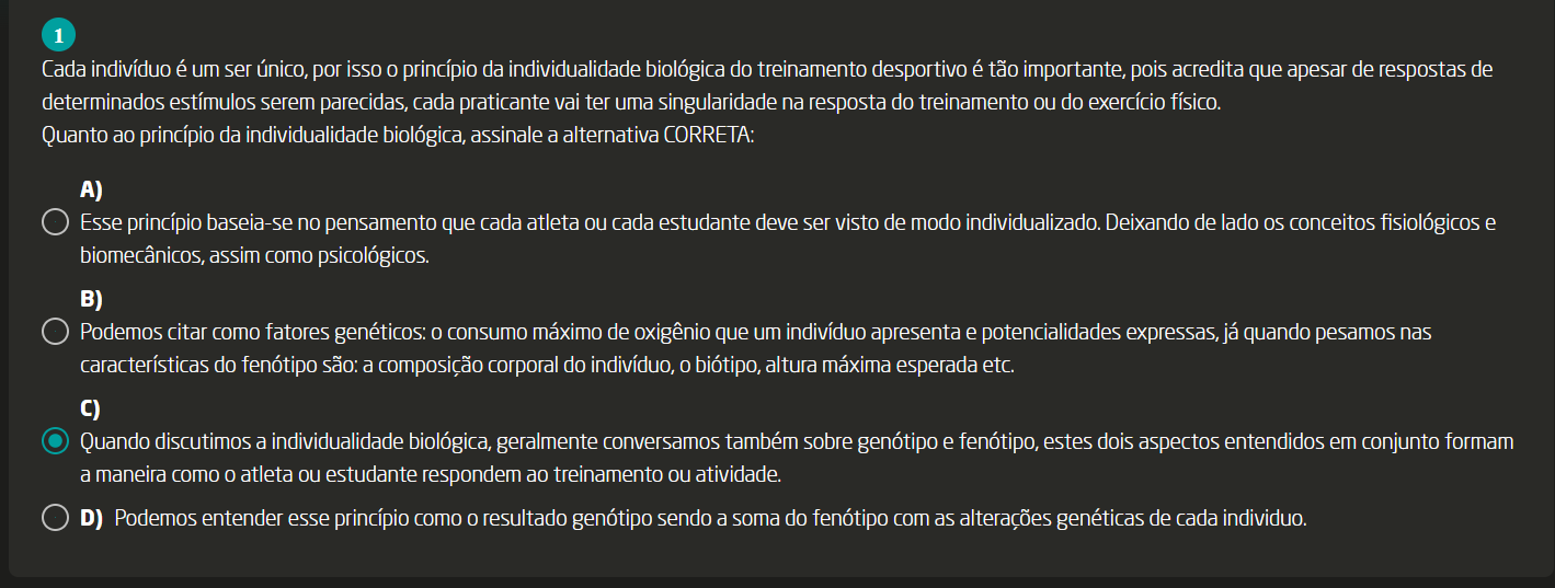 1 Cada indivíduo é um ser único, por isso princípio da individualidade biológica do treinamento desportivo é tão importante, pois acredita que apesar de respostas de determinados estímulos serem parecidas, cada praticante vai ter uma singularidade na resposta do treinamento do exercício físico. Quanto ao princípio da individualidade biológica, assinale a alternativa CORRETA: A) Esse princípio baseia-se no pensamento que cada atleta ou cada estudante deve ser visto de modo individualizado. Deixando de lado os conceitos fisiológicos e biomecânicos, assim como psicológicos. B) Podemos citar como fatores genéticos: consumo máximo de oxigênio que um indivíduo apresenta e potencialidades expressas, já quando pesamos nas características do fenótipo são: a composição corporal do indivíduo, biótipo, altura máxima esperada etc. C) Quando discutimos a individualidade biológica, geralmente conversamos também sobre genótipo e fenótipo, estes dois aspectos entendidos em conjunto formam a maneira como atleta ou estudante respondem ao treinamento ou atividade. D) Podemos entender esse princípio como resultado genótipo sendo a soma do fenótipo com as alterações genéticas de cada individuo.