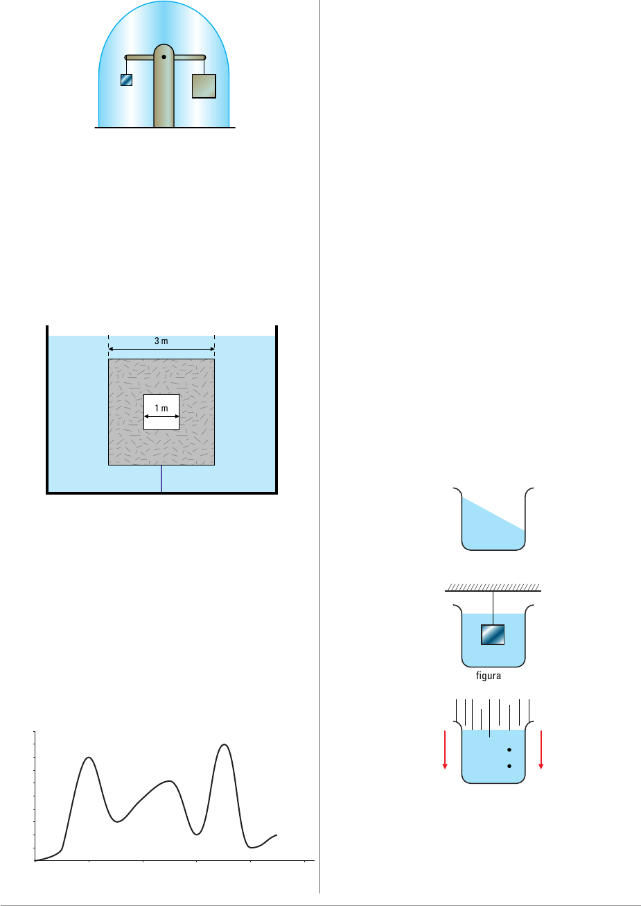 <p>67</p><p>O que aconteceria com a balança se o ar retornasse para o inte-</p><p>rior da campânula?</p><p>a) Ela permaneceria na posição horizontal.</p><p>b) Ela oscilaria algumas vezes e voltaria à posição horizontal.</p><p>c) Ela oscilaria indefinidamente em torno da posição horizontal.</p><p>d) Ela acabaria inclinada para a direita.</p><p>e) Ela acabaria inclinada para a esquerda.</p><p>497. (UFG-GO) Um bloco cúbico oco foi construído, retirando-se da</p><p>parte central de um cubo, de aresta igual a 3 m, uma parte tam-</p><p>bém cúbica, de aresta igual a 1 m. O bloco está preso por um</p><p>cabo ideal, ao fundo de um tanque com água, conforme mostra-</p><p>do na figura abaixo:</p><p>Considerando a densidade do material do bloco igual a 800</p><p>kg/m3, a densidade da água igual a 1 000 kg/m3, e a aceleração</p><p>gravitacional igual a 10 m/s2:</p><p>a) a massa do bloco é igual a 2,08 · 103 kg.</p><p>b) o empuxo que atua no bloco é igual a 2,7 · 105 N.</p><p>c) a tensão no cabo é igual a 6,2 · 104 N.</p><p>d) a tensão no cabo torna-se nula, adicionando-se, no interior do</p><p>cubo, uma massa de 6,2 · 103 kg.</p><p>498. (UFMT) Uma esfera homogênea, feita com um material flexível</p><p>mais denso que a água, é utilizada por um cientista para estudar</p><p>as correntes marinhas. Ao jogar uma dessas esferas no mar, o</p><p>cientista observa que ela inicialmente afunda, mas depois a sua</p><p>profundidade varia de acordo com o gráfico.</p><p>Em relação ao movimento da esfera, analise as afirmações.</p><p>a) O movimento somente pode ser compreendido se a força re-</p><p>sultante que atua sobre a esfera não for constante em relação</p><p>ao tempo.</p><p>b) À proporção que a esfera afunda, aumenta a pressão exercida</p><p>pela própria água do mar. Em consequência a esfera fica acha-</p><p>tada, pois a pressão atua de cima para baixo.</p><p>c) À proporção que a esfera afunda, o aumento de pressão pro-</p><p>voca a diminuição do volume da esfera, diminuindo, conse-</p><p>quentemente, a força de empuxo. Dessa forma, a esfera pas-</p><p>sa a afundar cada vez mais rápido. Trata-se de um movimento</p><p>não uniforme.</p><p>d) De acordo com o gráfico, entre 2 e 3min, a esfera afunda.</p><p>e) Quanto maior for a massa da esfera, maior deve ser a influên-</p><p>cia dos efeitos perturbatórios.</p><p>499. (UnB-DF) Os princípios estudados em hidrostática são funda-</p><p>mentais para a compreensão de fenômenos como a determina-</p><p>ção das pressões sanguínea e intraocular, o comportamento dos</p><p>animais subaquáticos e até mesmo o funcionamento de um sub-</p><p>marino. Com base nos princípios da hidrostática, julgue os itens</p><p>a seguir.</p><p>a) Se o líquido contido em um recipiente tem a sua superfície</p><p>inclinada, conforme mostra a figura I, pode-se assegurar que</p><p>o recipiente está em movimento retilíneo e uniforme.</p><p>b) A figura II mostra uma peça metálica suspensa por um fio e</p><p>imersa em água. Ao se dissolver açúcar no meio líquido, a</p><p>tensão no fio diminuirá.</p><p>c) Na figura III, é mostrado num recipiente em queda livre vertical,</p><p>contendo determinado líquido. Nessa circunstância, a pressão</p><p>no ponto A é igual à pressão no ponto B.</p><p>d) Para que um peixe se mantenha imóvel, quando imerso na</p><p>água, a sua densidade média deve ser igual à do meio (em</p><p>que ele está imerso).</p><p>500. (ITA-SP) Na extremidade inferior de uma vela cilíndrica de 10 cm</p><p>de comprimento (massa específica 0,7 g · cm–3) é fixado um cilin-</p><p>dro maciço de alumínio (massa específica 2,7 g · cm–3) que tem o</p><p>mesmo raio que a vela e comprimento de 1,5 cm. A vela é acesa</p><p>e imersa na água, onde flutua de pé com estabilidade, como</p><p>mostra a figura a seguir.</p><p>vácuo</p><p>����</p><p>����</p><p>����</p><p>3 m</p><p>1 m</p><p>figura II</p><p>figura III</p><p>A</p><p>B</p><p>figura I</p><p>0</p><p>10</p><p>20</p><p>20</p><p>30</p><p>40</p><p>50</p><p>60</p><p>70</p><p>80</p><p>90</p><p>100</p><p>4 6 8 10</p><p>Tempo (min)</p><p>Profundidade (m)</p><p>68</p><p>Supondo que a vela queime a uma taxa de 3 cm por hora e que a</p><p>cera fundida não escorra enquanto a vela queima, conclui-se</p><p>que a vela vai apagar-se:</p><p>a) imediatamente, pois não vai flutuar.</p><p>b) em 30min.</p><p>c) em 50min.</p><p>d) em 1h 50min.</p><p>e) em 3h 20min.</p><p>Oscilações e Ondas</p><p>501. (Mack-SP) Um corpo efetua um movimento harmônico simples.</p><p>Com relação a esse movimento, podemos afirmar que:</p><p>a) a trajetória descrita pelo corpo é uma senoide.</p><p>b) o módulo da velocidade do corpo varia senoidalmente com o</p><p>tempo.</p><p>c) o sentido da velocidade do corpo varia quatro vezes em cada</p><p>período.</p><p>d) a aceleração do corpo tem módulo invariável.</p><p>e) o módulo da aceleração do corpo varia linearmente com o</p><p>tempo.</p><p>502. (UFRGS-RS) Uma massa M executa um movimento harmônico</p><p>simples entre as posições x = –A e x = A, conforme representa a</p><p>figura:</p><p>Qual das alternativas refere-se corretamente aos módulos e aos</p><p>sentidos das grandezas velocidade e aceleração da massa M na</p><p>posição x = –A?</p><p>a) A velocidade é nula; a aceleração é nula.</p><p>b) A velocidade é máxima e aponta para a direita; a aceleração é</p><p>nula.</p><p>c) A velocidade é nula; a aceleração é máxima e aponta para a</p><p>direita.</p><p>d) A velocidade é nula; a aceleração é máxima e aponta para a</p><p>esquerda.</p><p>e) A velocidade é máxima e aponta para a esquerda; a acelera-</p><p>ção é máxima e aponta para a direita.</p><p>503. (UEL-PR) Um movimento harmônico simples é descrito pela fun-</p><p>ção x = 0,050 · cos (2πt + π), em unidades do Sistema Interna-</p><p>cional. Nesse movimento, a amplitude e o período, em unidades</p><p>do
