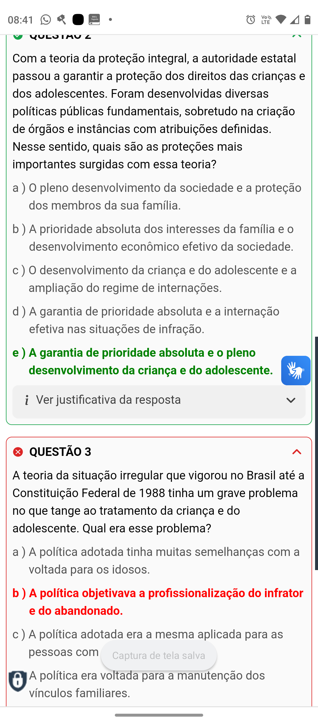 08:41 LTE Com a teoria da proteção integral, a autoridade estatal passou a garantir a proteção dos direitos das crianças e dos adolescentes. Foram desenvolvidas diversas políticas públicas fundamentais, sobretudo na criação de órgãos e instâncias com atribuições definidas. Nesse sentido, quais são as proteções mais importantes surgidas com essa teoria? a ) pleno desenvolvimento da sociedade e a proteção dos membros da sua família. b) A prioridade absoluta dos interesses da família e o desenvolvimento econômico efetivo da sociedade. c) desenvolvimento da criança e do adolescente e a ampliação do regime de internações. d A garantia de prioridade absoluta e a internação efetiva nas situações de infração. e) A garantia de prioridade absoluta e o pleno desenvolvimento da criança e do adolescente. i Ver justificativa da resposta QUESTÃO 3 A teoria da situação irregular que vigorou no Brasil até a Constituição Federal de 1988 tinha um grave problema no que tange ao tratamento da criança e do adolescente. Qual era esse problema? a) A política adotada tinha muitas semelhanças com a voltada para os idosos. b) A política objetivava a profissionalização do infrator e do abandonado. c) A política adotada era a mesma aplicada para as pessoas com Captura de tela salva A política era voltada para a manutenção dos vínculos familiares.