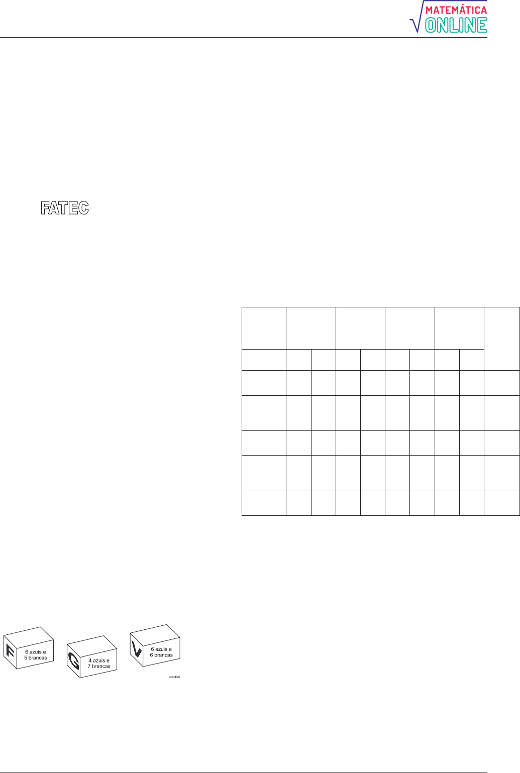<p>Alisson Marques -online</p><p>5</p><p>29. (Fgv 2015) O total de números pares não</p><p>negativos de até quatro algarismos que podem ser</p><p>formados com os algarismos 0, 1, 2 e 3, sem</p><p>repetir algarismos, é igual a</p><p>a) 26.</p><p>b) 27.</p><p>c) 28.</p><p>d) 29.</p><p>e) 30.</p><p>30. (Fatec 2015) Dispondo de cinco cores</p><p>distintas, uma pessoa pretende pintar as letras da</p><p>palavra de acordo com os seguintes</p><p>critérios:</p><p>- na palavra, letras que são equidistantes da letra</p><p>T terão a mesma cor;</p><p>- letras adjacentes serão pintadas de cores</p><p>distintas, e</p><p>- cada letra será pintada com uma única cor.</p><p>O número de modos distintos de se realizar essa</p><p>pintura é</p><p>a) 120.</p><p>b) 90.</p><p>c) 80.</p><p>d) 50.</p><p>e) 40.</p><p>31. (Ufjf-pism 3 2015) Quantos são os números de</p><p>7 algarismos distintos divisíveis por 5, começando</p><p>com um número ímpar, e tal que dois algarismos</p><p>adjacentes não tenham a mesma paridade, isto é,</p><p>não sejam simultaneamente pares ou</p><p>simultaneamente ímpares?</p><p>a) 20.160</p><p>b) 3.600</p><p>c) 2.880</p><p>d) 1.440</p><p>e) 1.200</p><p>32. (Fgv 2015) Conforme indica a figura, uma</p><p>caixa contém 6 letras F azuis e 5 brancas, a</p><p>outra contém 4 letras G azuis e 7 brancas, e a</p><p>última caixa contém 6 letras V azuis e 6 brancas.</p><p>Em um jogo, uma pessoa vai retirando letras das</p><p>caixas, uma a uma, até que forme a sigla FGV com</p><p>todas as letras da mesma cor. A pessoa pode</p><p>escolher a caixa da qual fará cada retirada, mas só</p><p>identifica a cor da letra após a retirada. Usando</p><p>uma estratégia conveniente, o número mínimo de</p><p>letras que ela deverá retirar para que possa</p><p>cumprir a tarefa com toda certeza é</p><p>a) 14.</p><p>b) 15.</p><p>c) 16.</p><p>d) 17.</p><p>e) 18.</p><p>33. (Enem 2015) Numa cidade, cinco escolas de</p><p>samba (I, II, III, IV e V) participaram do desfile de</p><p>Carnaval. Quatro quesitos são julgados, cada um</p><p>por dois jurados, que podem atribuir somente uma</p><p>dentre as notas 6, 7, 8, 9 ou 10. A campeã será a</p><p>escola que obtiver mais pontuação na soma de</p><p>todas as notas emitidas. Em caso de empate, a</p><p>campeã será a que alcançar a maior soma das</p><p>notas atribuídas pelos jurados no quesito Enredo e</p><p>Harmonia. A tabela mostra as notas do desfile</p><p>desse ano no momento em que faltava somente a</p><p>divulgação das notas do jurado B no quesito</p><p>Bateria.</p><p>Quantas configurações distintas das notas a serem</p><p>atribuídas pelo jurado B no quesito Bateria</p><p>tornariam campeã a Escola II?</p><p>a) 21</p><p>b) 90</p><p>c) 750</p><p>d) 1.250</p><p>e) 3.125</p><p>34. (Ueg 2015) Érika resolve passear com a</p><p>cachorrinha Kika e, antes de sair do apartamento,</p><p>escolhe colocar uma roupa e uma coleira na</p><p>cachorrinha. Se Kika tem 7 roupas e 3 coleiras,</p><p>todas distintas, de quantas maneiras Érika pode</p><p>escolher uma roupa e uma coleira para passear</p><p>com a Kika?</p><p>a) 10</p><p>b) 21</p><p>c) 35</p><p>d) 42</p><p>Quesitos</p><p>1.</p><p>Fantasia e</p><p>Alegoria</p><p>2.</p><p>Evolução</p><p>e Conjunto</p><p>3. Enredo</p><p>e</p><p>Harmonia</p><p>4. Bateria</p><p>Total</p><p>Jurado A B A B A B A B</p><p>Escola I 6 7 8 8 9 9 8 55</p><p>Escola II 9 8 10</p><p>9 10</p><p>10</p><p>10</p><p>66</p><p>Escola III 8 8 7 8 6 7 6 50</p><p>Escola</p><p>IV</p><p>9 10</p><p>10</p><p>10</p><p>9 10</p><p>10</p><p>68</p><p>Escola V 8 7 9 8 6 8 8 54</p>