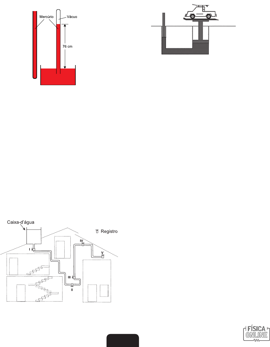 <p>103</p><p>Fí</p><p>si</p><p>ca</p><p>-</p><p>1.</p><p>00</p><p>0</p><p>Q</p><p>ue</p><p>st</p><p>õe</p><p>s</p><p>4. Em 1643, Evangelista Torricelli realizou um experimento</p><p>com o qual mediu a pressão atmosférica terrestre ao</p><p>nível do mar. Encheu com mercúrio um tubo de aproxi-</p><p>madamente 1 m de comprimento, fechou-o e, invertendo</p><p>o tubo, mergulhou sua extremidade em outro recipiente</p><p>também contendo mercúrio. Após a abertura da extre-</p><p>midade do tubo, o mercúrio desceu até estabilizar-se à</p><p>altura de 76 cm.</p><p>http://seara.ufc.br. (Adaptado).</p><p>Anos depois, por iniciativa de Blaise Pascal, o mesmo</p><p>experimento foi realizado na França, no alto de uma</p><p>montanha, e a coluna de mercúrio se estabilizou a uma</p><p>altura de 60,8 cm.</p><p>Considerando a pressão atmosférica ao nível do mar</p><p>igual a 1,0 × 105 Pa e que a aceleração da gravidade</p><p>tem o mesmo valor no alto da montanha e ao nível do</p><p>mar, a pressão atmosférica no alto da montanha onde</p><p>foi realizado o experimento era</p><p>A) 8,0 × 103 Pa. B) 6,6 × 104 Pa.</p><p>C) 1,25 × 104 Pa. D) 8,0 × 104 Pa.</p><p>E) 6,6 × 103 Pa.</p><p>5. A figura apresenta o esquema do encanamento de uma</p><p>casa onde se detectou a presença de vazamento de água</p><p>em um dos registros. Ao estudar o problema, o morador</p><p>concluiu que o vazamento está ocorrendo no registro</p><p>submetido á maior pressão hidrostática.</p><p>Em qual registro ocorria o vazamento?</p><p>A) I B) II C) llI D) IV E) V</p><p>6. A ferramenta usada em oficinas mecânicas para levantar</p><p>carros chama-se macaco hidráulico. Em uma situação é</p><p>preciso levantar um carro de massa 1.000 kg. A superfície</p><p>usada para levantar o carro tem área 4 m², e a área na</p><p>aplicação da força é igual a 0,002 5m². Dado o desenho</p><p>ao lado, qual a força aplicada para levantar o carro?</p><p>Considere: g = 10 m/s2</p><p>Êmbolo maiorß</p><p>Êmbolo</p><p>menor</p><p>ß</p><p>Reservatório</p><p>com Óleo</p><p>ß</p><p>MACACO</p><p>HIDRÁULICO</p><p>A) 6,25 N B) 7,75 N C) 8,2 N D) 8,25 N</p><p>7. O sistema de freios constitui uma das partes mais impor-</p><p>tantes e vitais de um veículo, sendo projetado para dar o</p><p>máximo de rendimento com um mínimo de manutenção.</p><p>Corretamente conservado e ajustado, o sistema de freios</p><p>proporciona ao motorista a garantia de uma frenagem</p><p>segura, sob as mais diversas condições de tráfego. O</p><p>sistema de freio hidráulico está baseado no princípio:</p><p>A) “Todo corpo permanece em seu estado de repouso,</p><p>ou de movimento uniforme em linha reta, a menos</p><p>que seja obrigado a mudar seu estado por forças</p><p>impressas nele.”</p><p>B) “O aumento de pressão em um ponto do líquido em</p><p>equilíbrio é transmitido integralmente para todos os</p><p>outros pontos desse líquido e das paredes do reci-</p><p>piente onde ele está contido.”</p><p>C) “Quando um corpo exerce uma força sobre outro,</p><p>simultaneamente este outro reage sobre o primeiro</p><p>aplicando-lhe uma força de mesma intensidade,</p><p>mesma direção, mas sentido contrário.”</p><p>D) “Um uido em equilíbrio age sobre um corpo nele</p><p>imerso (parcial ou totalmente), com uma força vertical</p><p>orientada de baixo para cima, denominada empuxo,</p><p>aplicada no centro de gravidade do volume de fluido</p><p>deslocado, cuja intensidade é igual ao peso do volume</p><p>de uido deslocado.”</p><p>8. A atmosfera de Vênus compreende a camada de gases</p><p>que recobre a superfície do segundo planeta do Sistema</p><p>Solar. É muito mais densa e quente do que a terrestre:</p><p>a temperatura na superfície é de 740 K (467 oC, 872 oF),</p><p>enquanto a pressão é de 93 vezes a pressão atmosférica</p><p>na Terra ao nível do mar.</p><p>Considerando a densidade da água do mar aproximada-</p><p>mente 1 g/cm3 e g = 10 m/s2, a que profundidade oceânica</p><p>(contada a partir do nível do mar) no planeta Terra cor-</p><p>responde a pressão atmosférica da superfície de Vênus?</p><p>Obs.: Pressão atmosférica na Terra ao nível do mar</p><p>igual a 1 atm.</p><p>A) 890 m. B) 900 m. C) 910 m.</p><p>D) 920 m. E) 930 m.</p>