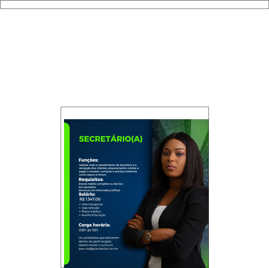 Atividade 1 UC 2 – Recrutamento, seleção e ambientação Nome do estudante: Brenno Menezes 1. Anúncio da vaga (post) Analise a requisição de pessoal enviada pelo escritório Silveira Advogados e, com base nas informações do documento, elabore um post (anúncio) para que possa ser divulgado nas redes sociais, como LinkedIn, Instagram e Facebook, para a vaga em aberto. Use sua criatividade (PowerPoint, Canva ou outro aplicativo de sua preferência). Exemplo: 2. Etapas do processo seletivo Cite e descreva as etapas do processo seletivo específicas para a vaga do anúncio (por exemplo: tipo de entrevista, testes, dinâmicas etc.) e explique detalhadamente os objetivos de cada uma das etapas escolhidas. 1. Análise de currículo: O primeiro passo é a triagem dos currículos enviados pelos candidatos. O recrutador verifica se as qualificações e experiências estão alinhadas com o perfil da vaga. 2. Entrevista por telefone ou vídeo: Para fazer uma pré-seleção, a empresa pode realizar uma breve entrevista por telefone ou vídeo para confirmar informações básicas e conhecer um pouco do perfil do candidato. 3. Teste prático ou avaliação de habilidades: Muitas vezes, para vagas de secretária, pode ser aplicado um teste prático, como o uso de ferramentas de escritório (Word, Excel, PowerPoint), ou um teste de digitação, além de verificar a capacidade de organização e comunicação. 4. Entrevista presencial: Os candidatos selecionados na etapa anterior são chamados para uma entrevista presencial, que pode envolver o gestor da área e/ou o responsável pelo recrutamento. Essa entrevista é mais aprofundada, onde são discutidas as experiências anteriores, habilidades interpessoais e comportamentais. 5. Dinâmicas de grupo: Em alguns processos, principalmente em empresas maiores, podem ser realizadas dinâmicas de grupo para avaliar a capacidade de trabalhar em equipe, resolver problemas e tomar decisões sob pressão. 6. Avaliação psicológica ou de perfil comportamental: Dependendo do nível da vaga, pode ser solicitado ao candidato que faça testes de perfil psicológico ou comportamental para avaliar a adequação à cultura da empresa. 7. Proposta de emprego e documentação: Após as etapas de seleção, o candidato aprovado recebe a proposta de emprego e é solicitado que apresente a documentação necessária para formalizar a contratação. image1.png