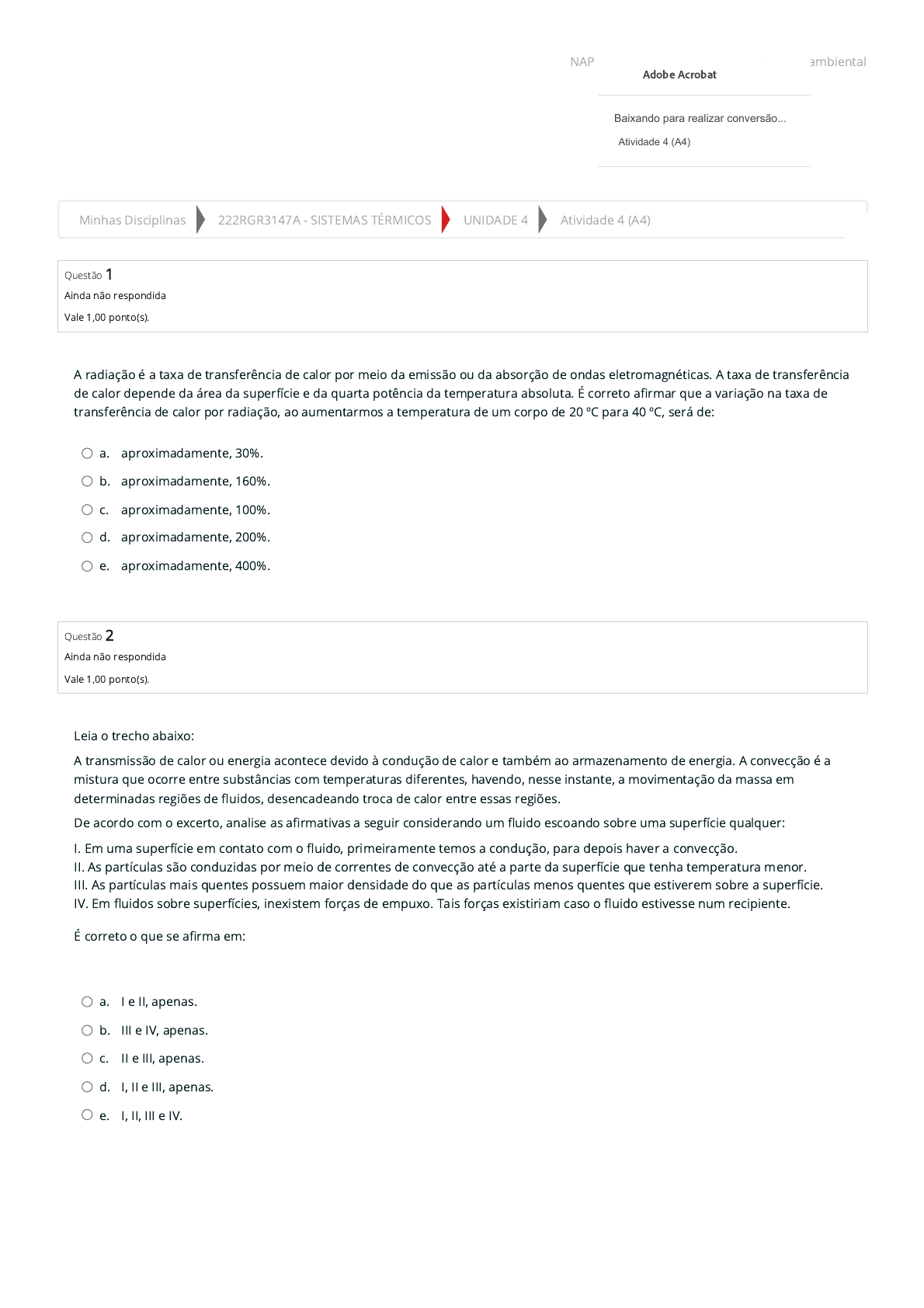 <p>06/09/2022 10:50 Atividade 4 (A4)</p><p>https://ambienteacademico.com.br/mod/quiz/attempt.php?attempt=1044361&cmid=499337 1/6</p><p>Minhas Disciplinas 222RGR3147A - SISTEMAS TÉRMICOS UNIDADE 4 Atividade 4 (A4)</p><p>Questão 1</p><p>Ainda não respondida</p><p>Vale 1,00 ponto(s).</p><p>Questão 2</p><p>Ainda não respondida</p><p>Vale 1,00 ponto(s).</p><p>A radiação é a taxa de transferência de calor por meio da emissão ou da absorção de ondas eletromagnéticas. A taxa de transferência</p><p>de calor depende da área da superfície e da quarta potência da temperatura absoluta. É correto a�rmar que a variação na taxa de</p><p>transferência de calor por radiação, ao aumentarmos a temperatura de um corpo de 20 ºC para 40 ºC, será de:</p><p>a. aproximadamente, 30%.</p><p>b. aproximadamente, 160%.</p><p>c. aproximadamente, 100%.</p><p>d. aproximadamente, 200%.</p><p>e. aproximadamente, 400%.</p><p>Leia o trecho abaixo:</p><p>A transmissão de calor ou energia acontece devido à condução de calor e também ao armazenamento de energia. A convecção é a</p><p>mistura que ocorre entre substâncias com temperaturas diferentes, havendo, nesse instante, a movimentação da massa em</p><p>determinadas regiões de �uidos, desencadeando troca de calor entre essas regiões.</p><p>De acordo com o excerto, analise as a�rmativas a seguir considerando um �uido escoando sobre uma superfície qualquer:</p><p>I. Em uma superfície em contato com o �uido, primeiramente temos a condução, para depois haver a convecção.</p><p>II. As partículas são conduzidas por meio de correntes de convecção até a parte da superfície que tenha temperatura menor.</p><p>III. As partículas mais quentes possuem maior densidade do que as partículas menos quentes que estiverem sobre a superfície.</p><p>IV. Em �uidos sobre superfícies, inexistem forças de empuxo. Tais forças existiriam caso o �uido estivesse num recipiente.</p><p>É correto o que se a�rma em:</p><p>a. I e II, apenas.</p><p>b. III e IV, apenas.</p><p>c. II e III, apenas.</p><p>d. I, II e III, apenas.</p><p>e. I, II, III e IV.</p><p>NAP CPA Responsabilidade Socioambiental</p><p>Adobe Acrobat</p><p>Baixando para realizar conversão...</p><p>Atividade 4 (A4)</p><p>https://ambienteacademico.com.br/my/</p><p>https://ambienteacademico.com.br/course/view.php?id=18127</p><p>https://ambienteacademico.com.br/course/view.php?id=18127§ion=5</p><p>https://ambienteacademico.com.br/mod/quiz/view.php?id=499337</p><p>https://codely-fmu-content.s3.amazonaws.com/Moodle/NAP/inicial/nap/fmu/index.html</p><p>https://codely-fmu-content.s3.amazonaws.com/Moodle/CPA/landing_CPA/index.html</p><p>https://portal.fmu.br/sustentabilidade</p><p>06/09/2022 10:50 Atividade 4 (A4)</p><p>https://ambienteacademico.com.br/mod/quiz/attempt.php?attempt=1044361&cmid=499337 2/6</p><p>Questão 3</p><p>Ainda não respondida</p><p>Vale 1,00 ponto(s).</p><p>Questão 4</p><p>Ainda não respondida</p><p>Vale 1,00 ponto(s).</p><p>Leia o trecho abaixo:</p><p>O escoamento laminar ocorre quando o �uxo do �uido possui uma ocorrência ordenada, sendo possível veri�car que as partículas do</p><p>�uido se locomovem de forma calma. Caso a temperatura da superfície plana em que está o �uido esteja diferente da temperatura</p><p>do �uido, haverá troca de calor ou energia no interior por condução molecular, havendo também o processo de condução entre a</p><p>superfície plana e o �uido.</p><p>Com base nisso, analise as asserções a seguir e a relação proposta entre elas:</p><p>I. Durante o processo de convecção, o gradiente de temperatura inicia um processo de mistura de massa.</p><p>POIS</p><p>II. Alavanca uma série de alterações de densidade dentro do �uido.</p><p>Assinale a alternativa correta.</p><p>a. A asserção I é uma proposição falsa, e a II é uma proposição verdadeira.</p><p>b. As asserções I e II são proposições falsas.</p><p>c. As asserções I e II são proposições verdadeiras, mas a II não é uma justi�cativa da I.</p><p>d. As asserções I e II são proposições verdadeiras, e a II é uma justi�cativa correta da I.</p><p>e. A asserção I é uma proposição verdadeira, e a II é uma proposição falsa.</p><p>Leia o trecho abaixo:</p><p>De acordo com DE SOUZA (2015, p.15), "o mecanismo de transferência de calor por convecção envolve escoamento de �uido</p><p>combinado com difusão térmica, e é geralmente dividido em dois tipos básicos. Se o movimento do �uido surge a partir de um</p><p>agente externo, por exemplo, uma ventoinha, o vento atmosférico, ou a movimentação do próprio objeto em relação ao �uido, o</p><p>processo é chamado de convecção forçada. "</p><p>DE SOUZA, A. L. Convecção natural e radiação em cavidade aberta preenchida com meio poroso heterogêneo. 2014. 168 f.</p><p>Monogra�a (Graduação em Engenharia Industrial Mecânica) — Universidade Tecnológica Federal do Paraná, Curitiba, 2014.</p><p>Disponível em: https://repositorio.utfpr.edu.br/jspui/bitstream/1/10282/3/CT_COEME_2014-1_27.pdf. Acesso em: 15 jun. 2022.</p><p>Com base nisso, analise as alternativas a seguir e marque a correta.</p><p>a. A vibração sobre um recipiente pode causar a convecção gravitacional.</p><p>b. As tubulações são materiais que provocam a convecção natural.</p><p>c. A convecção interna é aquela que ocorre sobre uma superfície qualquer.</p><p>d. A convecção externa é aquela que ocorre dentro de canalizações ou tubos.</p><p>e. A bombas são equipamentos que possibilitam a convecção forçada.</p><p>NAP CPA Responsabilidade Socioambiental</p><p>Adobe Acrobat</p><p>Baixando para realizar conversão...</p><p>Atividade 4 (A4)</p><p>https://repositorio.utfpr.edu.br/jspui/bitstream/1/10282/3/CT_COEME_2014-1_27.pdf</p><p>https://codely-fmu-content.s3.amazonaws.com/Moodle/NAP/inicial/nap/fmu/index.html</p><p>https://codely-fmu-content.s3.amazonaws.com/Moodle/CPA/landing_C