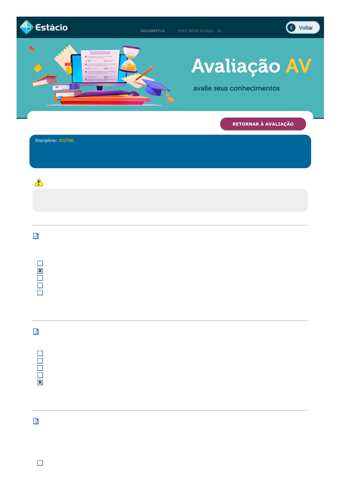 <p>15/10/2022 09:40 EPS</p><p>https://simulado.estacio.br/alunos/ 1/4</p><p>Nathalia Freitas de Sousa</p><p>Avaliação AV</p><p>202208371698 POLO NOVA IGUAÇU - RJ</p><p>avalie seus conhecimentos</p><p>RETORNAR À AVALIAÇÃO</p><p>Disciplina: DGT0025 - RACIOCÍNIO LÓGICO, CRÍTICO E ANALÍTICO PARA TOMADA DE</p><p>DECISÃO</p><p>Período: 2022.3 EAD (G) /</p><p>AV</p><p>Aluno: NATHALIA FREITAS DE SOUSA Matrícula: 202208371698</p><p>Data: 15/10/2022 09:46:04 Turma: 9001</p><p>ATENÇÃO</p><p>1. Veja abaixo, todas as suas respostas gravadas no nosso banco de dados.</p><p>2. Caso você queira voltar à prova clique no botão "Retornar à Avaliação".</p><p>1a Questão (Ref.: 202208417540)</p><p>Considere o conjunto das cidades A={ Rio de Janeiro, São Paulo, Brasília, Belo Horizonte } É correto afirmar</p><p>que:</p><p>Recife está contido no conjunto das cidades A.</p><p>São Paulo é um elemento do conjunto das cidades A.</p><p>Rio de Janeiro é um subconjunto do conjunto das cidades A.</p><p>Belo Horizonte contém o conjunto das cidades A.</p><p>Brasília está contida no conjunto das cidades A.</p><p>2a Questão (Ref.: 202209096151)</p><p>O conjunto R resultante da interseção dos conjuntos referentes às letras das palavras "raciocinio" e "lógico" é:</p><p>R={o,c}</p><p>R={a,o}</p><p>R={ }</p><p>R={g,o,c}</p><p>R={i,o,c}</p><p>3a Questão (Ref.: 202208510265)</p><p>Numa classe de 35 alunos, 28 gostam de Matematica e 16 gostam de Portugues. Considerando que os</p><p>alunos desta classe gostam pelo menos de uma das duas disciplinas, determine o numero de alunos</p><p>dessa turma que gostam das duas disciplinas ao mesmo tempo.</p><p>7</p><p>javascript:voltar_avaliacoes()</p><p>javascript:alert('C%C3%B3digo da quest%C3%A3o: 8673\n\nStatus da quest%C3%A3o: Liberada para Uso.');</p><p>javascript:alert('C%C3%B3digo da quest%C3%A3o: 687284\n\nStatus da quest%C3%A3o: Liberada para Uso.');</p><p>javascript:alert('C%C3%B3digo da quest%C3%A3o: 101398\n\nStatus da quest%C3%A3o: Liberada para Uso.');</p><p>15/10/2022 09:40 EPS</p><p>https://simulado.estacio.br/alunos/ 2/4</p><p>12</p><p>3</p><p>10</p><p>9</p><p>4a Questão (Ref.: 202208510272)</p><p>Uma pesquisa foi realizada em uma clínica veterinária, na qual foram atendidos 400 animais em um mês.</p><p>Considerando que esta clinica veterinária só atende cães e gatos, e que, dos animais atendidos neste</p><p>mês, 60% eram cães, quantos gatos foram atendidos neste mês?</p><p>140</p><p>240</p><p>220</p><p>160</p><p>180</p><p>5a Questão (Ref.: 202209030061)</p><p>João é um trabalhador que recebe proporcionalmente à quantidade de horas trabalhadas. Se trabalha 8 horas</p><p>por dia durante 10 dias recebe R$1000,00. Quantas horas deverá trabalhar por dia durante 20 dias para</p><p>receber R$1500,00?</p><p>8</p><p>5</p><p>6</p><p>7</p><p>4</p><p>6a Questão (Ref.: 202209032572)</p><p>Os dados do gráfico a seguir referem-se a pesquisa sobre a situação do desemprego no Brasil.</p><p>Supondo que o número de pessoas pesquisadas em 2013 foi de 13.000, o total de desempregados</p><p>pesquisados nesse ano foi de:</p><p>636</p><p>javascript:alert('C%C3%B3digo da quest%C3%A3o: 101405\n\nStatus da quest%C3%A3o: Liberada para Uso.');</p><p>javascript:alert('C%C3%B3digo da quest%C3%A3o: 621194\n\nStatus da quest%C3%A3o: Liberada para Uso.');</p><p>javascript:alert('C%C3%B3digo da quest%C3%A3o: 623705\n\nStatus da quest%C3%A3o: Liberada para Uso.');</p><p>15/10/2022 09:40 EPS</p><p>https://simulado.estacio.br/alunos/ 3/4</p><p>674</p><p>712</p><p>582</p><p>598</p><p>7a Questão (Ref.: 202208652130)</p><p>2</p><p>4</p><p>3</p><p>0</p><p>1</p><p>8a Questão (Ref.: 202209143252)</p><p>Sejam as sentenças: "p: O Brasil foi colonizado por Portugal"; "q:6</p>