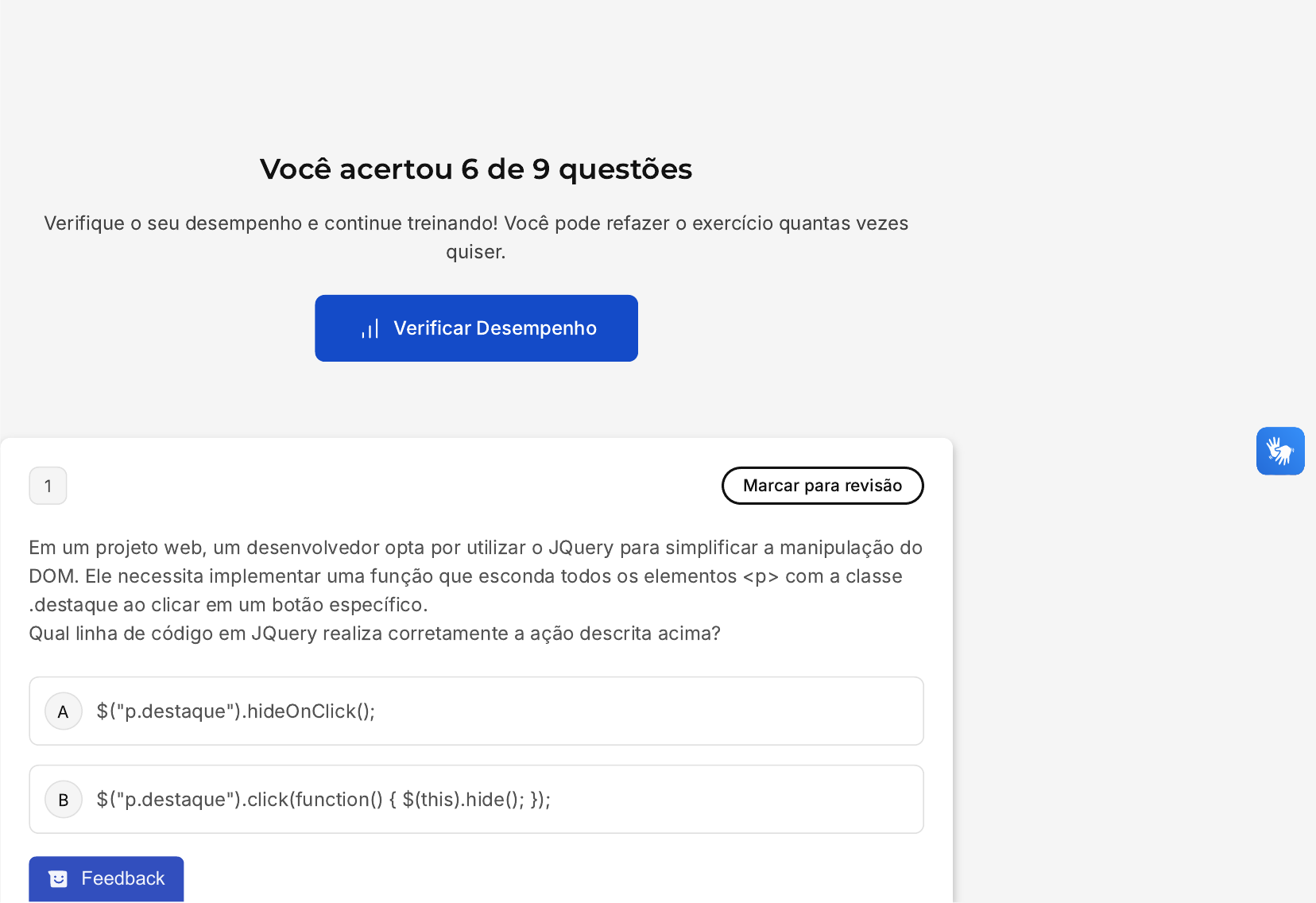 <p>Você acertou 6 de 9 questões</p><p>Verifique o seu desempenho e continue treinando! Você pode refazer o exercício quantas vezes</p><p>quiser.</p><p>Verificar Desempenho</p><p>A</p><p>B</p><p>1 Marcar para revisão</p><p>Em um projeto web, um desenvolvedor opta por utilizar o JQuery para simplificar a manipulação do</p><p>DOM. Ele necessita implementar uma função que esconda todos os elementos com a classe</p><p>.destaque ao clicar em um botão específico.</p><p>Qual linha de código em JQuery realiza corretamente a ação descrita acima?</p><p>$�"p.destaque").hideOnClick();</p><p>$�"p.destaque").click(function() { $(this).hide(); });</p><p>Feedback</p><p>C</p><p>D</p><p>E</p><p>$�".destaque").on("click", "p", function() { $(this).hide(); });</p><p>$�"button").click(function() { $�"p.destaque").hide(); });</p><p>$�"p"�.hasClass(".destaque").click(function() { $(this).hide();</p><p>Resposta correta</p><p>Parabéns, você selecionou a alternativa correta. Confira o gabarito comentado!</p><p>Gabarito Comentado</p><p>A alternativa correta utiliza a função .click() do JQuery para atribuir um evento de clique a um</p><p>botão. Dentro do evento, ela utiliza a função .hide() para esconder todos os elementos</p><p>com a classe .destaque. As outras alternativas não representam corretamente a ação descrita,</p><p>seja por selecionar elementos de forma incorreta ou por utilizar métodos que não existem no</p><p>JQuery.</p><p>2 Marcar para revisão</p><p>Ao contrário da palavra- chave "var", a palavra- chave "let", tem como função restringir o acesso a</p><p>variáveis dentro de um bloco. Neste sentido, o que acontece quando executamos o código abaixo</p><p>em um navegador com suporte a ECMAScript versão ES6 ou superior?</p><p>Questão 5 de 9</p><p>Exercicio Programação Cliente Com Javascript Sair</p><p>A</p><p>B</p><p>C</p><p>D</p><p>E</p><p>O valor da variável teste será sempre 200.</p><p>Será exibido no console do navegador o valor 1.</p><p>Será exibido dentro da janela navegador o valor 1.</p><p>A instrução let introduz um escopo de bloco a variável teste.</p><p>A declaração da variável teste utilizando let funcionaria da mesma forma se utilizássemos</p><p>var.</p><p>Resposta incorreta</p><p>Corretas �6�</p><p>Incorretas �3�</p><p>Em branco �0�</p><p>1 2 3 4 5</p><p>6 7 8 9</p><p>A</p><p>B</p><p>C</p><p>Opa! A alternativa correta é a letra A. Confira o gabarito comentado!</p><p>Gabarito Comentado</p><p>A resposta correta é: O valor da variável teste será sempre 200.</p><p>3 Marcar para revisão</p><p>Em um projeto de interface web, um desenvolvedor utiliza jQuery para aprimorar a interatividade.</p><p>Ele planeja modificar o estilo de um botão quando o usuário passa o mouse sobre ele. Para isso,</p><p>ele precisa selecionar corretamente o botão e aplicar a função de estilo.</p><p>Qual método jQuery o desenvolvedor deve usar para selecionar o botão pelo seu ID e aplicar uma</p><p>mudança de estilo ao passar o mouse?</p><p>$�'#botao').onMouseOver()</p><p>$�'#botao').hover()</p><p>$�'.botao').mouseenter()</p><p>D</p><p>E</p><p>$�'botao').mouseover()</p><p>$�'#botao').mouseStyle()</p><p>Resposta incorreta</p><p>Opa! A alternativa correta é a letra B. Confira o gabarito comentado!</p><p>Gabarito Comentado</p><p>A alternativa correta é a B, $�'#botao').hover(). Este método é usado no jQuery para adicionar</p><p>manipuladores de eventos para a ação de passar o mouse sobre um elemento. As outras</p><p>alternativas, embora usem termos relacionados ao jQuery e eventos de mouse, não são</p><p>métodos corretos para esta ação específica.</p><p>4 Marcar para revisão</p><p>Uma aplicação web requer a atualização de conteúdo sem recarregar a página inteira. O</p><p>desenvolvedor decide usar jQuery para realizar requisições AJAX, buscando dados de um servidor</p><p>e atualizando um elemento da página.</p><p>Qual função jQuery é apropriada para enviar uma requisição AJAX GET e atualizar um elemento</p><p>com o ID 'conteudo'?</p><p>A</p><p>B</p><p>C</p><p>D</p><p>E</p><p>$.ajaxGet('#conteudo')</p><p>$�'#conteudo').loadData()</p><p>$.get('url', function(data) { $�'#conteudo').html(data); })</p><p>$�'#conteudo').ajax('url')</p><p>$.post('url', function(data) { $�'#conteudo').html(data); })</p><p>Resposta correta</p><p>Parabéns, você selecionou a alternativa correta. Confira o gabarito comentado!</p><p>Gabarito Comentado</p><p>A alternativa C, $.get('url', function(data) { $�'#conteudo').html(data); }), é a resposta correta.</p><p>Este método do jQuery é usado para realizar uma requisição AJAX do tipo GET e, em seguida,</p><p>atualizar um elemento específico da página com os dados recebidos. As outras opções,</p><p>apesar de parecerem plausíveis, não são métodos válidos ou apropriados para realizar esta</p><p>tarefa conforme descrito no jQuery.</p><p>A</p><p>B</p><p>C</p><p>D</p><p>E</p><p>5 Marcar para revisão</p><p>Considere o bloco de código abaixo que utiliza JavaScript e JSON.</p><p>Para que o bloco de código exiba 0146 vermelha, a lacuna I deve ser corretamente preenchida</p><p>por:</p><p>x.trens[2�.trem + " " + x.trens[2�.linha</p><p>text.trens[trem] + " " + text.trens[linha]</p><p>x.trens[1�.trem + " " + x.trens[1�.linha</p><p>x.trens[trem] + " " + x.trens[linha]</p><p>text.trens[1�.trem + " " + text.trens[1�.linha</p><p>A</p><p>B</p><p>C</p><p>Resposta correta</p><p>Parabéns, você selecionou a alternativa correta. Confira o gabarito comentado!</p><p>Gabarito Comentado</p><p>A resposta correta é: x.trens[1�.trem + " " + x.trens[1�.linha</p><p>6 Marcar para revisão</p><p>Considere a página abaixo, construída utilizando jQuery:</p><p>$(document).ready(function() { ..I... }); Esconder Texto do parágrafo.</p><p>Para que, ao se clicar no botão Esconder, o texto do parágrafo se torne oculto, deve-se preencher</p><p>a lacuna I com:</p><p>$�'button').