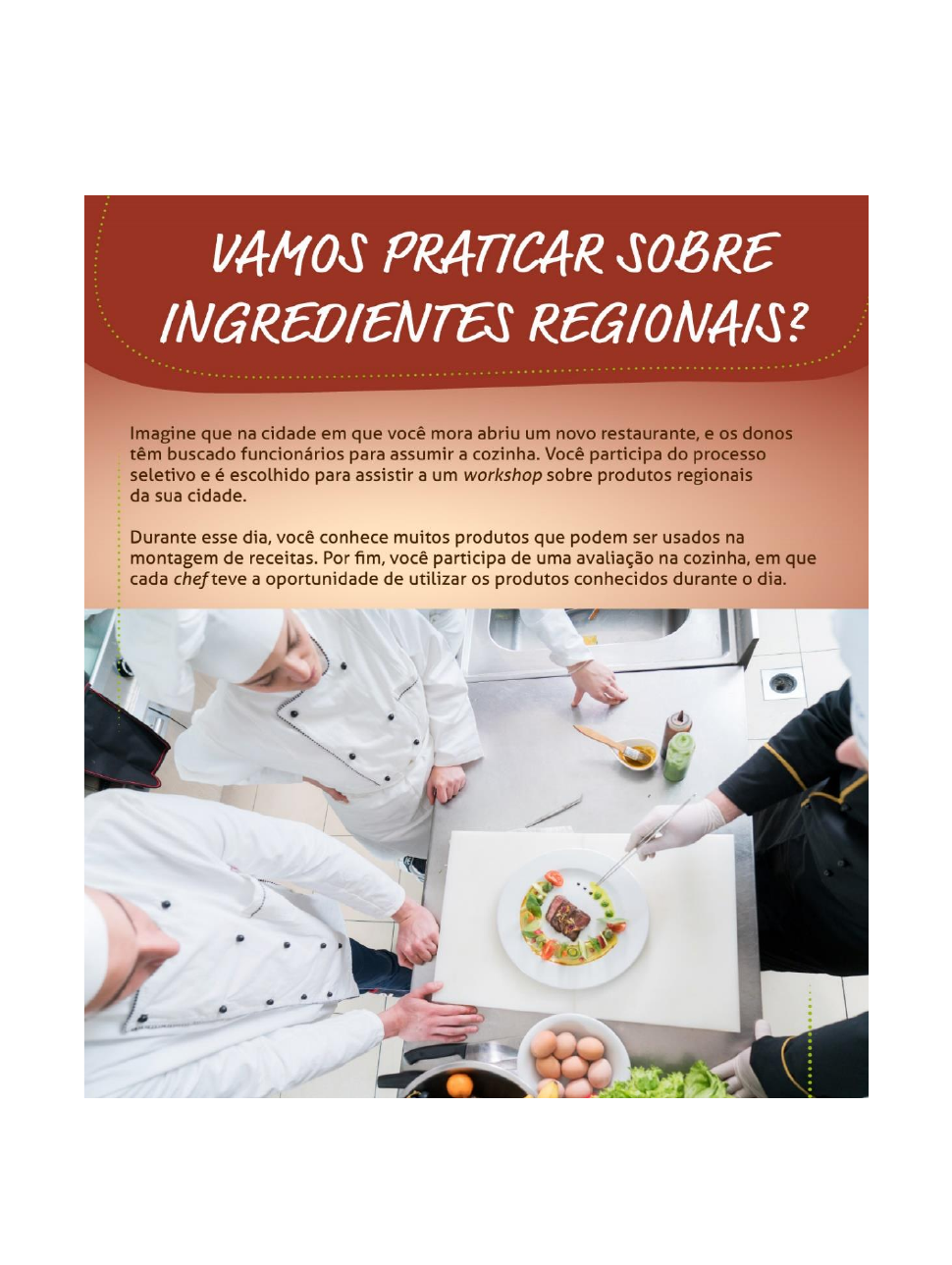 <p>GASTRONOMIA BRASILEIRA I – BIOMA DA AMAZÔNIA - DESAFIO</p><p>DESAFIO</p><p>A gastronomia está sempre em processo de transformação. De 2008 até os dias atuais, os chefes de</p><p>cozinha vêm buscando conhecimento sobre o que servem em seus restaurantes e sobre</p><p>a procedência dos ingredientes, valorizando, assim, a agricultura familiar e também o pequeno</p><p>produtor. No Brasil, esse movimento começou com o chef de cozinha Alex Atala, que investe na</p><p>constante busca de ingredientes regionais. Em 2013, ele criou o Instituto Atá, que forma cadeias</p><p>entre produtores, cozinheiros e consumidores.</p><p>Para este desafio, prepare um prato com ingredientes regionais da sua cidade. Pode ser doce ou</p><p>salgado. O importante é você valorizar o produtor local e a agricultura familiar. Você deve</p><p>fotografar e anexar aqui a foto do seu prato. Além disso, escreva quais foram os produtos</p><p>utilizados, quem são os seus produtores e qual foi o conceito ou a história que você quis contar</p><p>ao montar esse prato.</p><p>Escreva sua resposta no campo abaixo:</p><p>R.</p><p>Prato</p><p>Caldeirada de Tambaqui</p><p>Ingredientes:</p><p>Tambaqui (Roraima) sem escamas e em pedaços</p><p>Limão, pimenta do reino, sal a gosto, tomate, cebola</p><p>Coentro, Cebolinha, Tomate, Pimentão e Pimenta de Cheiro</p><p>Água e Leite de Castanha do Pará</p><p>Este prato eu sempre faço para relembrar a minha infância quando morava no Interior do Pará</p><p>(Alenquer) com meus pais.</p><p>Padrão de resposta esperado</p><p>Resultado da tarefa:</p><p>Apresente uma foto do prato criado por você. Deixe claras as referências da cidade onde</p><p>você mora, como produtos e produtores, e principalmente esclareça o conceito que</p><p>você escolheu para a criação do prato.</p>