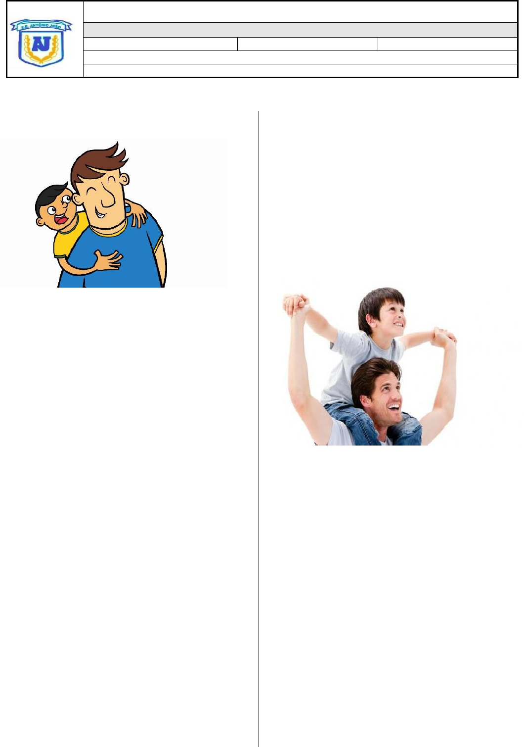 <p>TEMA: O DIA DOS PAIS</p><p>O Dia dos Pais é celebrado no segundo domingo</p><p>de agosto como forma de homenagem aos pais,</p><p>figuras que dedicam suas vidas a cuidar de seus</p><p>filhos.</p><p>ORIGEM DO DIA DOS PAIS</p><p>O Dia dos Pais é uma celebração moderna que,</p><p>assim como o Dia das Mães, teve seu surgimento</p><p>nos Estados Unidos. As primeiras celebrações</p><p>dessa data remontam ao começo do século XX e</p><p>estão relacionadas com Sonora Smart Dodd,</p><p>artista e escritora que morava no estado de</p><p>Washington. Os historiadores apontam que ela</p><p>propôs a criação do Dia dos Pais como um feriado,</p><p>pela primeira vez, em 1910. A sugestão de Sonora</p><p>Dodd teria sido uma forma de homenagear seu</p><p>pai, William Jackson Smart, um veterano da</p><p>Guerra Civil Americana. Dodd conta que o seu pai</p><p>criou seus filhos sozinho depois que sua mãe (e</p><p>esposa de Smart), Ellen Smart, faleceu ao dar à</p><p>luz seu sexto filho.</p><p>A COMEMORAÇÃO NO BRASIL</p><p>No Brasil, a celebração do Dia dos Pais foi</p><p>proposta, pela primeira vez, em 1953, no jornal O</p><p>Globo. A ideia partiu de Sylvio Bhering, publicitário</p><p>que, na época, ocupava funções na Rede Globo.</p><p>Com base em sua ideia, o jornal carioca elaborou</p><p>um texto, no dia 15 de agosto de 1953, estipulando</p><p>que o “Dia do Papai” seria uma forma de os filhos</p><p>demonstrarem um “enternecido reconhecimento</p><p>que devem a quem lhes consagra energia e</p><p>desvelos, preocupações e esperanças”. A</p><p>proposta de Sylvio era celebrar o primeiro Dia dos</p><p>Pais no Brasil em 16 de agosto. Seu objetivo era</p><p>utilizar a data para garantir mais anúncios</p><p>publicitários ao jornal, pois a celebração poderia</p><p>gerar aumento do consumo do comércio e visava</p><p>atingir apenas a cidade do Rio de Janeiro, mas</p><p>acabou se popularizando no Brasil. Como a</p><p>celebração do Dia dos Pais em uma data fixa (16</p><p>de agosto) não se mostrou muito vantajosa,</p><p>porque, às vezes, cairia em dias úteis, a data</p><p>passou a ser celebrada no segundo domingo do</p><p>mesmo mês, assim como o Dia das Mães é</p><p>celebrado no segundo domingo do mês de maio.</p><p>TRADIÇÕES</p><p>Nesta data, os filhos homenageiam e agradecem</p><p>aos papais toda a companhia, suporte e carinho</p><p>recebido ao longo de suas vidas. Normalmente,</p><p>neste dia, com presentes, mensagens, beijos e</p><p>abraços, os filhos e filhas presenteiam seus pais,</p><p>demonstrando todo o amor que sentem por eles.</p><p>CONCLUSÃO</p><p>Infelizmente nem todos têm os pais ainda vivos,</p><p>todavia, vivos ou não, eles continuam trazendo o</p><p>amor para o coração de todos. Os pais merecem</p><p>todas as homenagens de seus filhos, pois eles</p><p>lutam para conseguir um futuro melhor e tudo faz</p><p>pela felicidade da família. Por isso, não deixe de</p><p>homenagear seu PAI nesse Dia dos Pais!</p><p>Fonte do texto: www.preparaenem.com</p><p>ESCOLA ESTADUAL ANTÔNIO JOÃO</p><p>3º BIMESTRE – A1</p><p>Disciplina: Ensino Religioso Professor: Adriel Martins Turma: _____Turno: Manhã</p><p>Nome:</p><p>Data: ____ de Agosto de 2024</p><p>http://www.preparaenem.com/</p><p>ATIVIDADE SOBRE O QUE VOCÊ APRENDEU</p><p>1. Segundo o texto, qual o intuito em celebrar o dia</p><p>dos pais?</p><p>6. Segundo o texto, por que os pais merecem as</p><p>homenagens dos seus filhos?</p><p>2. Conforme o texto, assinale a alternativa</p><p>VERDADEIRA:</p><p>a) O Dia dos Pais é uma celebração moderna</p><p>porque surgiu no Estados Unidos.</p><p>b) O Brasil foi o país que primeiramente celebrou</p><p>e oficializou o dia dos pais.</p><p>c) As únicas pessoas que dedicam suas vidas a</p><p>cuidar de seus filhos são os pais.</p><p>d) Como forma de reconhecimento de cuidado, foi</p><p>estabelecido o dia dos pais.</p><p>3. Localize no texto as seguintes informações:</p><p>a) Pessoa responsável no mundo por instituir o dia</p><p>dos pais.</p><p>b) Ano da primeira comemoração do dia dos pais.</p><p>c) Pessoa que primeiro propôs o dia dos pais para</p><p>ser comemorado no Brasil</p><p>d) Pais de origem do dia dos pais.</p><p>7. Dentre as características abaixo, escolha</p><p>apenas 4 (quatro) palavras que mais definem o</p><p>estilo de vida do seu pai:</p><p>( )Sério ( )Determinado ( )Trabalhador</p><p>( )Carinhoso ( )Observador ( )Presente</p><p>( )Atencioso ( )Compreensivo ( )Honesto</p><p>( )Amigo ( )Conselheiro ( )Espiritual</p><p>8. Observe as palavras abaixo e escreva um</p><p>pequeno texto em homenagem ao seu pai</p><p>utilizando-as na sua mensagem.</p><p>TRABALHO AMOR CARINHO</p><p>_______________________________________</p><p>_______________________________________</p><p>_______________________________________</p><p>_______________________________________</p><p>_______________________________________</p><p>_______________________________________</p><p>e) Data sugerida para comemorar o dia dos pais</p><p>no Brasil que acabou não acontecendo.</p><p>4. No Brasil, a comemoração do dia dos pais teve</p><p>seu surgimento impulsionado pela atividade:</p><p>a) econômica.</p><p>b) escolar.</p><p>c) religiosa.</p><p>d) literária.</p><p>5. De acordo com o texto, como os brasileiros</p><p>comemoram o dia dos pais?</p>