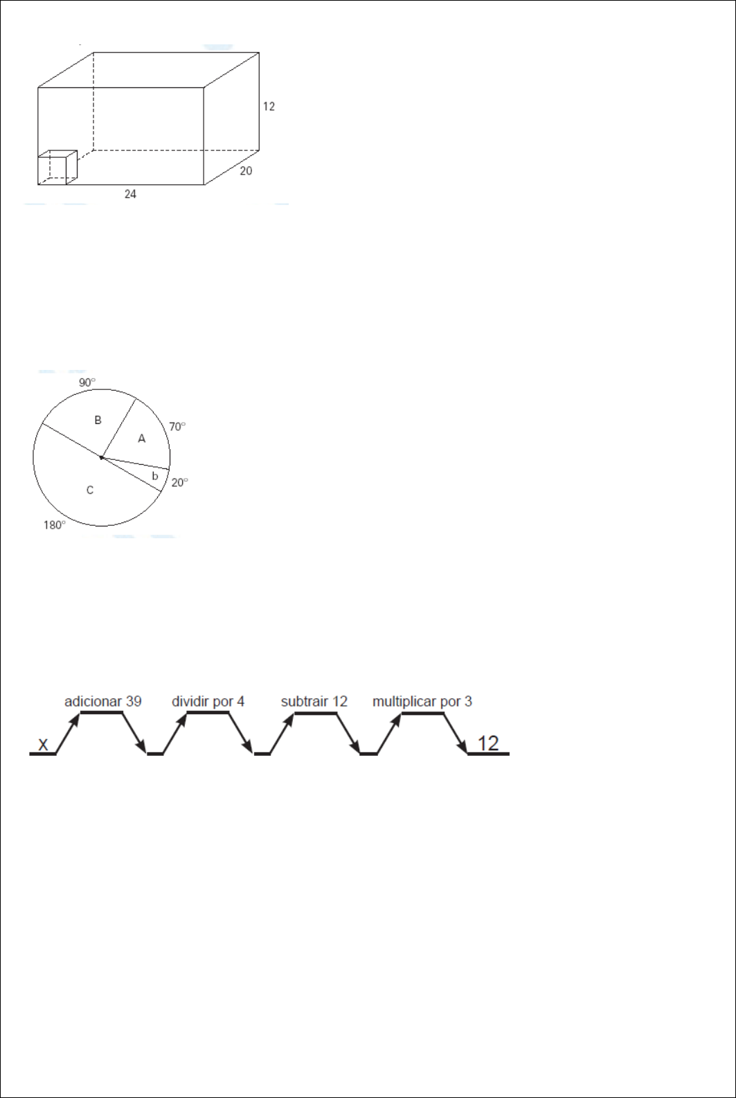 1) A figura ilustra um bloco retangular de madeira com dimensões 12cm, 20cm e 24cm. Queremos cortá-lo segundo planos paralelos às suas faces, de modo a obtermos cubos iguais, sem haver sobra de material. Se os cubos obtidos devem ter as arestas com a maior medida possível, quantos cubos obteremos com esses cortes? A) 48 B) 60 C) 72 D) 86 E) 90 2) Foi feita uma pesquisa com 1800 pessoas sobre suas preferências em relação a três candidatos, A, B e C, à prefeitura de uma cidade. Cada pessoa optou por um único candidato, ou então votou em branco (b). Com os dados obtidos, construiu-se o diagrama de setores abaixo. Quantas pessoas optaram pelo voto em branco? A) 200 B) 175 C) 125 D) 100 E) 75 3) No esquema seguinte têm-se indicadas as operações que devem ser sucessivamente efetuadas, a partir de um número x, a fim de obter-se como resultado final o número 12. É verdade que o número x é: (A) primo (B) par (C) divisível por 3 (D) múltiplo de 7 (E) quadrado perfeito 4) Segundo o Censo do IBGE no ano 1996, 81% dos brasileiros possuíam televisão, 75% possuíam geladeira e 8% não tinham TV nem geladeira. Qual o total de brasileiros que possuíam apenas televisão? A) 15% B) 16% C) 17% D) 18% E) 19% 5) Seja a expressão 1200.x onde x é um número natural não nulo. O menor valor de x, de modo que essa expressão seja um cubo perfeito é: a) 45 b) 150 c) 180 d) 1440 e) 4860 6) Um certo planeta possui dois satélites naturais: Lua A e Lua B; o planeta gira em torno do sol e os satélites em torno do planeta, de forma que os alinhamentos: Sol - planeta - Lua A ocorre a cada 18 anos e Sol - planeta - Lua B ocorre a cada 48 anos. Se hoje ocorrer o alinhamento Sol - planeta - Lua A - Lua B, então o fenômeno se repetirá daqui á: a) 48 anos b) 66 anos c) 96 anos d) 144 anos e) 860 anos 7) O número 26 . 3k . 54 tem 175 divisores naturais. Qual é o valor de k? A) 5 B) 4 C) 3 D) 2 E) 1 8) A razão entre a massa e o volume de uma substância, ou seja, a sua massa específica, depende da temperatura. A seguir, são apresentadas as curvas aproximadas da massa em função do volume para o álcool e para o ferro, ambos à temperatura de 0º C. Considere ρF a massa específica do ferro e ρA a massa específica do álcool. De acordo com o gráfico, a razão ρF / ρA é igual a: (A) 4 (B) 8 (C) 10 (D) 20 (E) 40 9) Em um ginásio de esportes, uma quadra retangular está situada no interior de uma pista de corridas circular, como mostra a figura. A área interior à pista, excedente à da quadra retangular, em 2m , é: a) 50 48π b) 25 48π c) 25 24π d) 25 24 2 π e) 10 30π 10) Para capinar um terreno circular plano, de raio 7 m, uma máquina gasta 5 horas. Quantas horas gastará essa máquina para capinar um terreno em iguais condições com 14 m de raio? a) 10 b) 15 c) 20 d) 25 e) 30