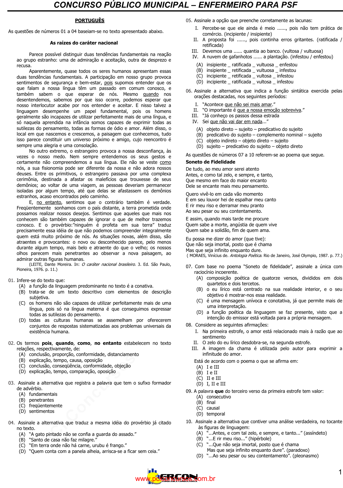 <p>pcimarkpci MDAwMDowMDAwOjAwMDA6MDAwMDowMDAwOmZmZmY6YjEzMzo0YjVk:VGh1LCAxNyBPY3QgMjAyNCAxMTozMDoxNSAtMDMwMA==</p><p>www.pciconcursos.com.br</p><p>CONCURSO PÚBLICO MUNICIPAL – ENFERMEIRO PARA PSF</p><p>1</p><p>PORTUGUÊS</p><p>As questões de números 01 a 04 baseiam-se no texto apresentado abaixo.</p><p>As raízes do caráter nacional</p><p>Parece possível distinguir duas tendências fundamentais na reação</p><p>ao grupo estranho: uma de admiração e aceitação, outra de desprezo e</p><p>recusa.</p><p>Aparentemente, quase todos os seres humanos apresentam essas</p><p>duas tendências fundamentais. A participação em nosso grupo provoca</p><p>sentimentos de segurança e bem-estar, pois supomos entender que os</p><p>que falam a nossa língua têm um passado em comum conosco, e</p><p>também sabem o que esperar de nós. Mesmo quando nos</p><p>desentendemos, sabemos por que isso ocorre, podemos esperar que</p><p>nosso interlocutor acabe por nos entender e aceitar. E nisso talvez a</p><p>linguagem desempenhe um papel fundamental, pois os homens</p><p>geralmente são incapazes de utilizar perfeitamente mais de uma língua, e</p><p>só naquela aprendida na infância somos capazes de exprimir todas as</p><p>sutilezas do pensamento, todas as formas de ódio e amor. Além disso, o</p><p>local em que nascemos e crescemos, a paisagem que conhecemos, tudo</p><p>isso parece constituir um universo próximo e amigo, cujo reencontro é</p><p>sempre uma alegria e uma consolação.</p><p>No outro extremo, o estrangeiro provoca a nossa desconfiança, às</p><p>vezes o nosso medo. Nem sempre entendemos os seus gestos e</p><p>certamente não compreendemos a sua língua. Ele não se veste como</p><p>nós, a sua fisionomia pode ser diferente da nossa e não adora nossos</p><p>deuses. Entre os primitivos, o estrangeiro passava por uma complexa</p><p>cerimônia, destinada a afastar os malefícios que trouxesse de seus</p><p>demônios; ao voltar de uma viagem, as pessoas deveriam permanecer</p><p>isoladas por algum tempo, até que delas se afastassem os demônios</p><p>estranhos, acaso encontrados pelo caminho.</p><p>E, no entanto, sentimos que o contrário também é verdade.</p><p>Freqüentemente sonhamos com o país distante, a terra prometida onde</p><p>possamos realizar nossos desejos. Sentimos que aqueles que mais nos</p><p>conhecem são também capazes de ignorar o que de melhor trazemos</p><p>conosco. E o provérbio:”ninguém é profeta em sua terra” traduz</p><p>precisamente essa idéia de que não podemos compreender integralmente</p><p>quem está muito próximo de nós. As situações novas, além disso, são</p><p>atraentes e provocantes: o novo ou desconhecido parece, pelo menos</p><p>durante algum tempo, mais belo e atraente do que o velho; os nossos</p><p>olhos parecem mais penetrantes ao observar a nova paisagem, ao</p><p>admirar outras figuras humanas.</p><p>(LEITE, Dante Moreira. In: O caráter nacional brasileiro. 3. Ed. São Paulo,</p><p>Pioneira, 1976. p. 11.)</p><p>01. Infere-se do texto que:</p><p>(A) a função da linguagem predominante no texto é a conativa.</p><p>(B) trata-se de um texto descritivo com elementos de descrição</p><p>subjetiva.</p><p>(C) os homens não são capazes de utilizar perfeitamente mais de uma</p><p>língua, pois só na língua materna é que conseguimos expressar</p><p>todas as sutilezas do pensamento.</p><p>(D) todas as culturas humanas se assemelham por oferecerem</p><p>conjuntos de respostas sistematizadas aos problemas universais da</p><p>existência humana.</p><p>02. Os termos pois, quando, como, no entanto estabelecem no texto</p><p>relações, respectivamente, de:</p><p>(A) conclusão, proporção, conformidade, distanciamento</p><p>(B) explicação, tempo, causa, oposição</p><p>(C) conclusão, conseqüência, conformidade, objeção</p><p>(D) explicação, tempo, comparação, oposição</p><p>03. Assinale a alternativa que registra a palavra que tem o sufixo formador</p><p>de advérbio.</p><p>(A) fundamentais</p><p>(B) penetrantes</p><p>(C) freqüentemente</p><p>(D) sentimentos</p><p>04. Assinale a alternativa que traduz a mesma idéia do provérbio já citado</p><p>no texto.</p><p>(A) “A gato pintado não se confia a guarda do assado.”</p><p>(B) “Santo de casa não faz milagre.”</p><p>(C) “Em terra onde não há carne, urubu é frango.”</p><p>(D) “Quem conta com a panela alheia, arrisca-se a ficar sem ceia.”</p><p>05. Assinale a opção que preenche corretamente as lacunas:</p><p>I. Percebe-se que ele ainda é meio ......, pois não tem prática de</p><p>comércio. (incipiente / insipiente)</p><p>II. A proposta foi ......, pois continha erros gritantes. (ratificada /</p><p>retificada)</p><p>III. Devemos uma ...... quantia ao banco. (vultosa / vultuosa)</p><p>IV. A nuvem de gafanhotos ...... a plantação. (infestou / enfestou)</p><p>(A) insipiente _ ratificada _ vultuosa _ enfestou</p><p>(B) insipiente _ retificada _ vultuosa _ infestou</p><p>(C) incipiente _ retificada _ vultosa _ infestou</p><p>(D) incipiente _ ratificada _ vultosa _ infestou</p><p>06. Assinale a alternativa que indica a função sintática exercida pelas</p><p>orações destacadas, nos seguintes períodos:</p><p>I. “Acontece que não sei mais amar.”</p><p>II. “O importante é que a nossa emoção sobreviva.”</p><p>III. “Já conheço os passos dessa estrada</p><p>IV. Sei que não vai dar em nada...”</p><p>(A) objeto direto – sujeito – predicativo do sujeito</p><p>(B) predicativo do sujeito – complemento nominal – sujeito</p><p>(C) objeto indireto – objeto direto – sujeito</p><p>(D) sujeito – predicativo do sujeito – objeto direto</p><p>As questões de números 07 a 10 referem-se ao poema que segue.</p><p>Soneto de Fidelidade</p><p>De tudo, ao meu amor serei atento</p><p>Antes, e como tal zelo, e sempre, e tanto,</p><p>Que mesmo em face do maior encanto</p><p>Dele se encante mais meu pensamento.</p><p>Quero vivê-lo em cada 