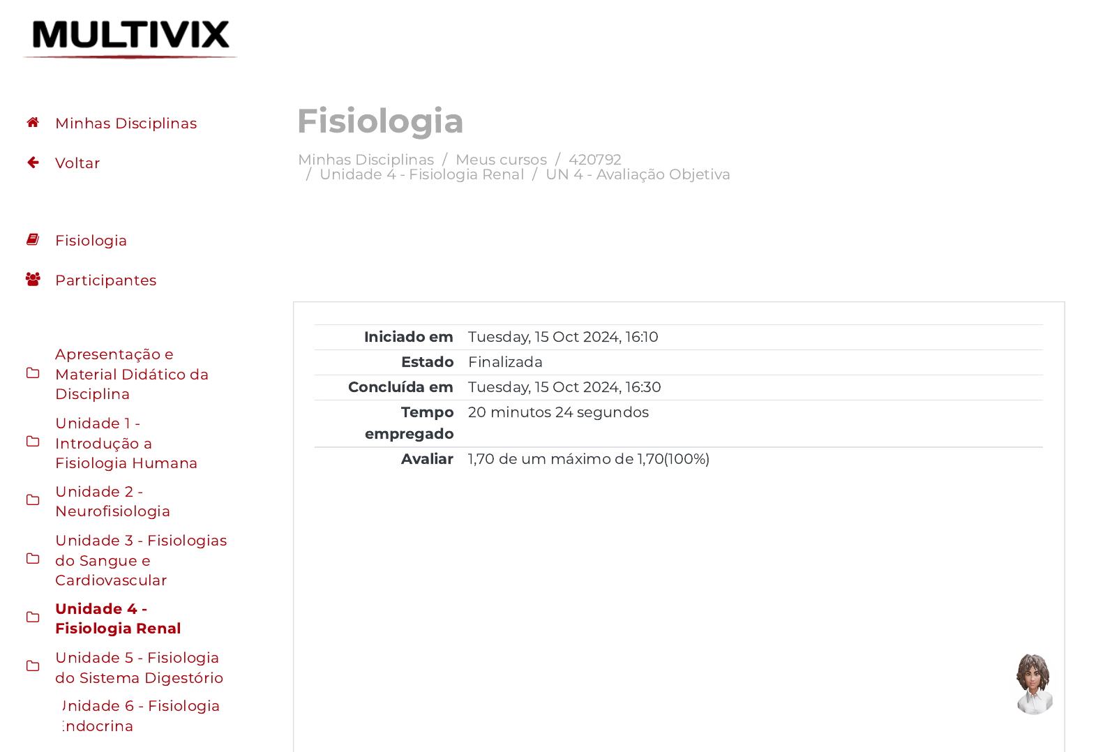<p>Minhas Disciplinas / Meus cursos / 420792</p><p>/ Unidade 4 - Fisiologia Renal / UN 4 - Avaliação Objetiva</p><p>Fisiologia</p><p>Iniciado em Tuesday, 15 Oct 2024, 16:10</p><p>Estado Finalizada</p><p>Concluída em Tuesday, 15 Oct 2024, 16:30</p><p>Tempo</p><p>empregado</p><p>20 minutos 24 segundos</p><p>Avaliar 1,70 de um máximo de 1,70(100%)</p><p> Minhas Disciplinas</p><p> Voltar</p><p> Fisiologia</p><p> Participantes</p><p></p><p>Apresentação e</p><p>Material Didático da</p><p>Disciplina</p><p></p><p>Unidade 1 -</p><p>Introdução a</p><p>Fisiologia Humana</p><p></p><p>Unidade 2 -</p><p>Neurofisiologia</p><p></p><p>Unidade 3 - Fisiologias</p><p>do Sangue e</p><p>Cardiovascular</p><p></p><p>Unidade 4 -</p><p>Fisiologia Renal</p><p></p><p>Unidade 5 - Fisiologia</p><p>do Sistema Digestório</p><p></p><p>Unidade 6 - Fisiologia</p><p>Endocrina</p><p>https://avap.multivix.edu.br/my/</p><p>https://avap.multivix.edu.br/course/view.php?id=29303</p><p>https://avap.multivix.edu.br/course/view.php?id=29303§ion=5</p><p>https://avap.multivix.edu.br/mod/quiz/view.php?id=1714686</p><p>https://avap.multivix.edu.br/my/</p><p>https://avap.multivix.edu.br/course/view.php?id=29303</p><p>https://avap.multivix.edu.br/user/index.php?id=29303</p><p>https://avap.multivix.edu.br/course/view.php?id=29303§ion=1</p><p>https://avap.multivix.edu.br/course/view.php?id=29303§ion=2</p><p>https://avap.multivix.edu.br/course/view.php?id=29303§ion=3</p><p>https://avap.multivix.edu.br/course/view.php?id=29303§ion=4</p><p>https://avap.multivix.edu.br/course/view.php?id=29303§ion=5</p><p>https://avap.multivix.edu.br/course/view.php?id=29303§ion=6</p><p>https://avap.multivix.edu.br/course/view.php?id=29303§ion=7</p><p>https://avap.multivix.edu.br/course/view.php?id=29303§ion=8</p><p>https://avap.multivix.edu.br/</p><p>https://avap.multivix.edu.br/</p><p>https://avap.multivix.edu.br/</p><p>https://avap.multivix.edu.br/</p><p>https://avap.multivix.edu.br/</p><p>https://avap.multivix.edu.br/</p><p>https://avap.multivix.edu.br/</p><p>https://avap.multivix.edu.br/</p><p>https://avap.multivix.edu.br/</p><p>Questão 1</p><p>Correto</p><p>Atingiu 0,34</p><p>de 0,34</p><p>Algumas doenças hepáticas podem diminuir a metabolização de</p><p>compostos orgânicos e, consequentemente, a concentração de proteínas no</p><p>sangue pode ser reduzida. Deste modo, mais �ltrado seria produzido devido</p><p>à queda na pressão osmótica no sangue.</p><p>Considerando o texto anterior, é possível a�rmar que:</p><p>Escolha uma opção:</p><p>a. A pressão sanguínea e o transporte por proteínas transportadoras da</p><p>membrana são fatores que impulsionam os �uidos e os solutos (como</p><p>as proteínas metabolizadas pelo fígado) para fora do sangue e para</p><p>dentro do lúmen do néfron. Porém, quando temos pouca proteína no</p><p>sangue, menos água é reabsorvida, a pressão osmótica no sangue é</p><p>aumentada e mais �ltrado é formado.</p><p>b. A pressão sanguínea e o transporte por proteínas transportadoras</p><p>da membrana são fatores que impulsionam os �uidos e os solutos</p><p>(como as proteínas metabolizadas pelo fígado) para fora do</p><p>sangue e para dentro do lúmen do néfron. Porém, quando temos</p><p>pouca proteína no sangue, menos água é reabsorvida, a pressão</p><p>osmótica no sangue é diminuída e mais �ltrado é formado.</p><p></p><p>c. A pressão sanguínea e o transporte por proteínas transportadoras da</p><p>membrana não in�uenciam o transporte de �uidos e dos solutos</p><p>(como as proteínas metabolizadas pelo fígado) para fora do sangue ou</p><p>para dentro do lúmen do néfron.</p><p> Minhas Disciplinas</p><p> Voltar</p><p> Fisiologia</p><p> Participantes</p><p></p><p>Apresentação e</p><p>Material Didático da</p><p>Disciplina</p><p></p><p>Unidade 1 -</p><p>Introdução a</p><p>Fisiologia Humana</p><p></p><p>Unidade 2 -</p><p>Neurofisiologia</p><p></p><p>Unidade 3 - Fisiologias</p><p>do Sangue e</p><p>Cardiovascular</p><p></p><p>Unidade 4 -</p><p>Fisiologia Renal</p><p></p><p>Unidade 5 - Fisiologia</p><p>do Sistema Digestório</p><p></p><p>Unidade 6 - Fisiologia</p><p>Endocrina</p><p>https://avap.multivix.edu.br/my/</p><p>https://avap.multivix.edu.br/course/view.php?id=29303</p><p>https://avap.multivix.edu.br/user/index.php?id=29303</p><p>https://avap.multivix.edu.br/course/view.php?id=29303§ion=1</p><p>https://avap.multivix.edu.br/course/view.php?id=29303§ion=2</p><p>https://avap.multivix.edu.br/course/view.php?id=29303§ion=3</p><p>https://avap.multivix.edu.br/course/view.php?id=29303§ion=4</p><p>https://avap.multivix.edu.br/course/view.php?id=29303§ion=5</p><p>https://avap.multivix.edu.br/course/view.php?id=29303§ion=6</p><p>https://avap.multivix.edu.br/course/view.php?id=29303§ion=7</p><p>https://avap.multivix.edu.br/course/view.php?id=29303§ion=8</p><p>https://avap.multivix.edu.br/</p><p>https://avap.multivix.edu.br/</p><p>https://avap.multivix.edu.br/</p><p>https://avap.multivix.edu.br/</p><p>https://avap.multivix.edu.br/</p><p>https://avap.multivix.edu.br/</p><p>https://avap.multivix.edu.br/</p><p>https://avap.multivix.edu.br/</p><p>https://avap.multivix.edu.br/</p><p>d. A pressão sanguínea e o transporte por proteínas transportadoras da</p><p>membrana são fatores que impulsionam os �uidos e os solutos (como</p><p>as proteínas metabolizadas pelo fígado) para fora do sangue e para</p><p>dentro do lúmen do néfron. Porém, quando temos uma alta</p><p>concentração de proteína no sangue, menos água é reabsorvida, a</p><p>pressão osmótica no sangue é diminuída e mais �ltrado é formado.</p><p>e. A pressão sanguínea e o transporte por proteínas transportadoras da</p><p>membrana não in�uenciam o transporte de �uidos e dos solutos.</p><p> Minhas Disciplinas</p><p> Voltar</p><p> Fisiologia</p><p> Participantes</p><p></p><p>Apresentação e</p><p>Material Didático da</p><p>Disciplina</p><p></p><p>Unidade 1 -</p><p>Introdu