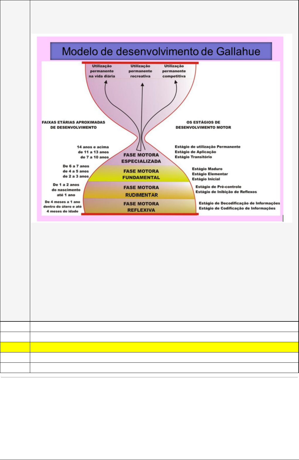 <p>Pincel Atômico - 17/10/2024 18:56:14 3/5</p><p>[359123_1281</p><p>42]</p><p>Questão</p><p>004</p><p>O ser humano desenvolve suas habilidades a partir do seu aparato biológico em</p><p>consonância com o ambiente cultural em que vive. Foi a partir disso que Gallahue e</p><p>Ozmun (2005) pensaram uma forma de classificar as habilidades motoras adquiridas</p><p>pelas pessoas, representada por meio da ampulheta na figura a seguir:</p><p>Considerando as informações apresentadas, avalie as afirmações a seguir:</p><p>I. O bebê reconhece o ambiente imediato a partir da atividade reflexa, provocada por</p><p>toque, sons e alteração de pressão.</p><p>II. É na fase motora rudimentar que as crianças começam as ações de locomoção por</p><p>meio do desenvolvimento da capacidade de arrastar-se, gatinhar e caminhar.</p><p>III. A realização de circuitos de desafios motores é estimulante e importante na fase</p><p>motora fundamental.</p><p>IV. A partir da fase motora especializada, o envolvimento do sujeito nas atividades da</p><p>cultura de movimento dependerá, além das competências motoras desenvolvidas ao</p><p>longo da infância e começo da adolescência, das oportunidades, condições físicas e</p><p>motivação pessoal para tal.</p><p>É correto o que se afirma em</p><p>I, III E IV , apenas.</p><p>I E II, apenas.</p><p>X I, II, III E IV .</p><p>II E III, apenas.</p><p>IV, apenas.</p>