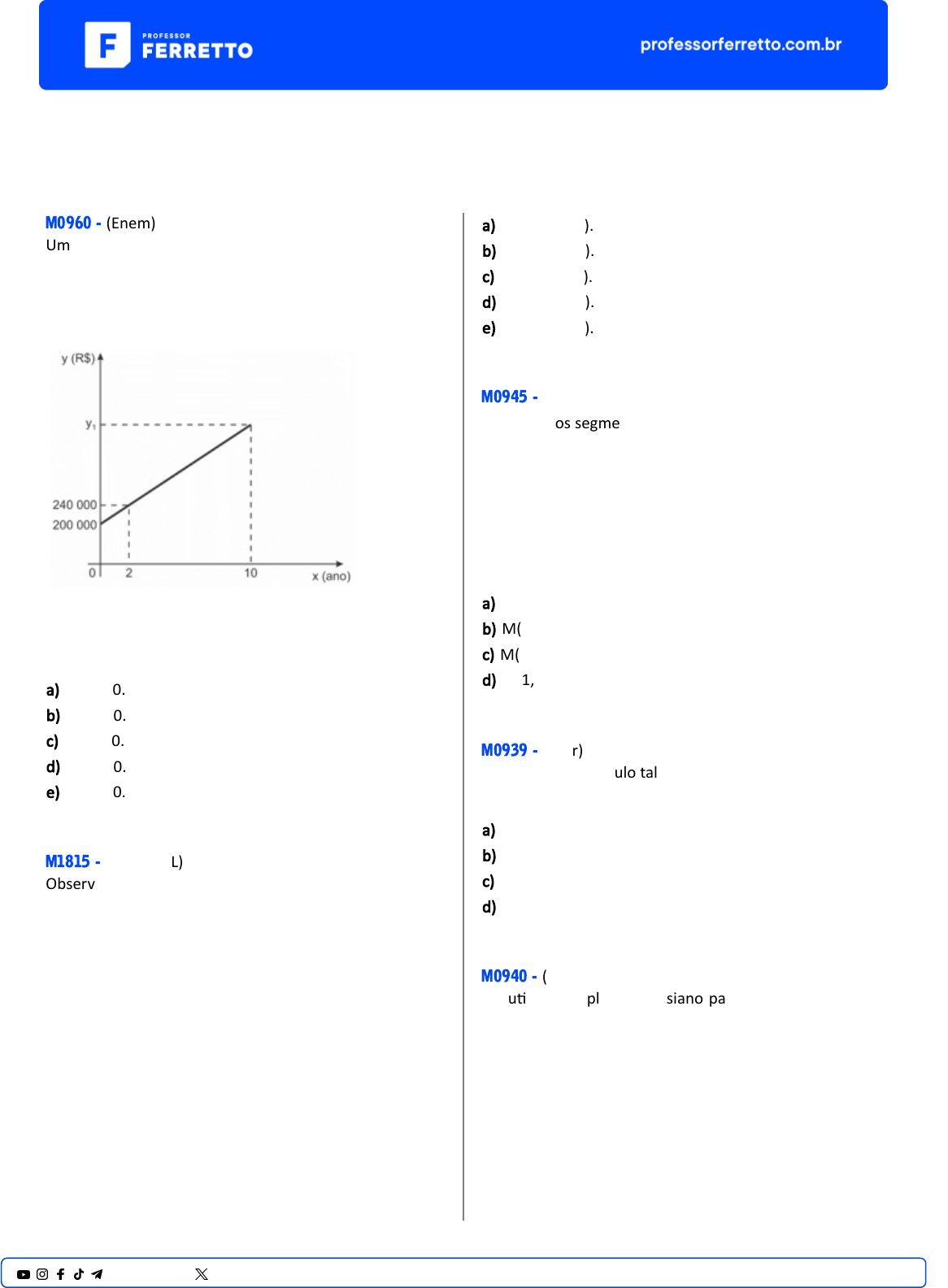 <p>Não respondidas</p><p>Geometria Analítica</p><p>M0960 - (Enem)</p><p>Um sí�o foi adquirido por R$ 200.000,00. O proprietário</p><p>verificou que a valorização do imóvel, após sua aquisição,</p><p>cresceu em função do tempo conforme o gráfico, e que</p><p>sua tendência de valorização se manteve nos anos</p><p>seguintes.</p><p>O valor desse sí�o, no décimo ano após sua compra, em</p><p>real, será de</p><p>a) 190.000.</p><p>b) 232.000.</p><p>c) 272.000.</p><p>d) 400.000.</p><p>e) 500.000.</p><p>M1815 - (Enem PPL)</p><p>Observou-se que todas as formigas de um formigueiro</p><p>trabalham de maneira ordeira e organizada. Foi feito um</p><p>experimento com duas formigas e os resultados ob�dos</p><p>foram esboçados em um plano cartesiano no qual os</p><p>eixos estão graduados em quilômetros. As duas formigas</p><p>par�ram juntas do ponto O, origem do plano cartesiana</p><p>xOy. Uma delas caminhou horizontalmente para o lado</p><p>direito, a uma velocidade de 4 km/h. A outra caminhou</p><p>ver�calmente para cima, à velocidade de 3 km/h.</p><p>Após 2 horas de movimento, quais as coordenadas</p><p>cartesianas das posições de cada formiga?</p><p>a) (8; 0) e (0; 6).</p><p>b) (4; 0) e (0; 6).</p><p>c) (4; 0) e (0; 3).</p><p>d) (0; 8) e (6; 0).</p><p>e) (0; 4) e (3; 0).</p><p>M0945 - (Eear)</p><p>Considere os segmentos de retas 𝐴𝐵 e ¯𝐶𝐷, onde A(0, 10),</p><p>B(2, 12), C(–2, 3) e D(4, 3). O segmento 𝑀𝑁 determinado</p><p>pelos pontos médios dos segmentos ¯𝐴𝐵 e ¯𝐶𝐷 é dado</p><p>pelos pontos M e N, pertencentes respec�vamente a ¯𝐴𝐵</p><p>e a ¯𝐶𝐷.</p><p>Assinale a alterna�va que corresponde corretamente a</p><p>esses pontos.</p><p>a) M(1/2, 1) e N(–1, 3)</p><p>b) M(–2, 10) e N(–1, 3)</p><p>c) M(1, –2) e N(1, 3)</p><p>d) M(1, 11) e N(1, 3)</p><p>M0939 - (Eear)</p><p>Seja ABC um triângulo tal que A(1 ,1), B(3, –1) e C(5, 3). O</p><p>ponto _____ é o baricentro desse triângulo.</p><p>a) (2, 1).</p><p>b) (3, 3).</p><p>c) (1, 3).</p><p>d) (3, 1).</p><p>M0940 - (Enem)</p><p>Foi u�lizado o plano cartesiano para a representação de</p><p>um pavimento de lojas. A loja A está localizada no ponto</p><p>A(1; 2). No ponto médio entre a loja A e a loja B está o</p><p>sanitário S, localizado no ponto S(5; 10).</p><p>Determine as coordenadas do ponto de localização da</p><p>loja B.</p><p>1@professorferretto @prof_ferretto</p><p>a) (–3; –6)</p><p>b) (–6; –3)</p><p>c) (3; 6)</p><p>d) (9; 18)</p><p>e) (18; 9)</p><p>M1757 - (Enem PPL)</p><p>Alunos de um curso de engenharia desenvolveram um</p><p>robô “an�bio” que executa saltos somente nas direções</p><p>norte, sul, leste e oeste. Um dos alunos representou a</p><p>posição inicial desse robô, no plano cartesiano, pela letra</p><p>P, na ilustração.</p><p>A direção norte-sul é a mesma do eixo y, sendo que o</p><p>sen�do norte é o sen�do de crescimento de y, e a direção</p><p>leste-oeste é a mesma do eixo x, sendo que o sen�do</p><p>leste é o sen�do de crescimento de x.</p><p>Em seguida, esse aluno deu os seguintes comandos de</p><p>movimentação para o robô: 4 norte, 2 leste e 3 sul, nos</p><p>quais os coeficientes numéricos representam o número</p><p>de saltos do robô nas direções correspondentes, e cada</p><p>salto corresponde a uma unidade do plano cartesiano.</p><p>Depois de realizar os comandos dados pelo aluno, a</p><p>posição do robô, no plano cartesiano, será</p><p>a) (0;2).</p><p>b) (0;3).</p><p>c) (1;2).</p><p>d) (1;4).</p><p>e) (2;1).</p><p>M0942 - (Pucrj)</p><p>Assinale o valor da área do quadrado de vér�ces (–2, 9),</p><p>(4, 6), (1, 0) e (–5, 3).</p><p>a) 20</p><p>b) 25</p><p>c) √45</p><p>d) 45</p><p>e) √60</p><p>M1690 - (Professor Ferre�o)</p><p>Um agrimensor, ao fazer umas medidas em uma área de</p><p>terra, representou no plano cartesiano os dados ob�dos.</p><p>Ele colocou estacas nos pontos A, B e C e percebeu que</p><p>formavam um triângulo conforme a figura.</p><p>Sabendo que as coordenadas dos pontos que</p><p>representam a localização das estacas são A(2; 3), B(18;</p><p>15) e C(18; 3), pode-se concluir que a tangente do ângulo</p><p>agudo do triângulo localizado na estaca A é</p><p>a) 3/5.</p><p>b) 3/4.</p><p>c) 4/5.</p><p>d) 5/4.</p><p>e) 4/3.</p><p>M1123 - (Enem)</p><p>Para uma feira de ciências, dois projéteis de foguetes, A e</p><p>B, estão sendo construídos para serem lançados. O</p><p>planejamento é que eles sejam lançados juntos, com o</p><p>obje�vo de o projé�l B interceptar o A quando esse</p><p>alcançar sua altura máxima. Para que isso aconteça, um</p><p>dos projéteis descreverá uma trajetória parabólica,</p><p>enquanto o outro irá descrever uma trajetória</p><p>supostamente re�línea. O gráfico mostra as alturas</p><p>alcançadas por esses projéteis em função do tempo, nas</p><p>simulações realizadas.</p><p>2@professorferretto @prof_ferretto</p><p>Com base nessas simulações, observou-se que a</p><p>trajetória do projé�l B deveria ser alterada para que o</p><p>obje�vo fosse alcançado.</p><p>Para alcançar o obje�vo, o coeficiente angular da reta</p><p>que representa a trajetória de B deverá</p><p>a) diminuir em 2 unidades.</p><p>b) diminuir em 4 unidades.</p><p>c) aumentar em 2 unidades.</p><p>d) aumentar em 4 unidades.</p><p>e) aumentar em 8 unidades.</p><p>M0972 - (Upe-ssa)</p><p>Em qual das alterna�vas a seguir, o ponto P pertence à</p><p>circunferência β?</p><p>a) P(5, 6); β : (x – 3)² + (y – 6)² = 4</p><p>b) P(1, 2); β : (x – 2)² + (y – 2)² = 5</p><p>c) P(1, 5); β : x² + y² – 8x + 6 = 0</p><p>d) P(1, 3); β : (x + 1)² + (y – 2)² = 16</p><p>e) P(3, 1); β : x² + y² – 4x + 2y +2 = 0</p><p>M0973 - (Eear)</p><p>As posições dos pontos A(1, 7) e B(7, 1) em relação à</p><p>circunferência de equação (x – 6)² + (y – 2)² = 16 são,</p><p>respec�vamente,</p><p>a) interna e intern