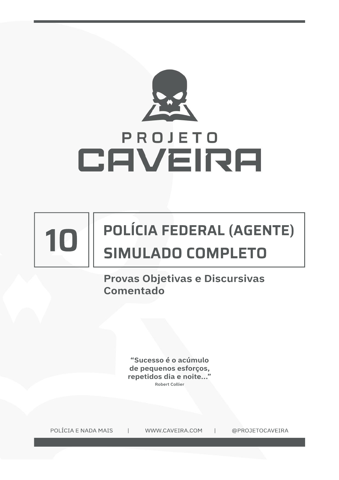 <p>10</p><p>Provas Objetivas e Discursivas</p><p>Comentado</p><p>POLÍCIA FEDERAL (AGENTE)</p><p>SIMULADO COMPLETO</p><p>POLÍCIA E NADA MAIS | WWW.CAVEIRA.COM | @PROJETOCAVEIRA</p><p>“Sucesso é o acúmulo</p><p>de pequenos esforços,</p><p>repetidos dia e noite...”</p><p>Robert Collier</p><p>1189335.21/08/2024</p><p>462.000.969-53.151945</p><p>GABARITO - 10º SIMULADO COMPLETO - PF</p><p>1 2 3 4 5 6 7 8 9 10</p><p>E E E C E C C E C C</p><p>11 12 13 14 15 16 17 18 19 20</p><p>E C C E C E C E E C</p><p>21 22 23 24 25 26 27 28 29 30</p><p>E E C E C C E C E C</p><p>31 32 33 34 35 36 37 38 39 40</p><p>C E C E E C E C E C</p><p>41 42 43 44 45 46 47 48 49 50</p><p>E E C E C C E C C E</p><p>51 52 53 54 55 56 57 58 59 60</p><p>C C E C E C E C E C</p><p>61 62 63 64 65 66 67 68 69 70</p><p>C C E C E C E E C C</p><p>71 72 73 74 75 76 77 78 79 80</p><p>E C E C E C E C E C</p><p>81 82 83 84 85 86 87 88 89 90</p><p>E C E E C E E C E E</p><p>91 92 93 94 95 96 97 98 99 100</p><p>C E C C E C E C E C</p><p>101 102 103 104 105 106 107 108 109 110</p><p>C E C E E X E C E C</p><p>111 112 113 114 115 116 117 118 119 120</p><p>C E E C E C E C E C</p><p>1189335.21/08/2024</p><p>462.000.969-53.151945</p><p>1</p><p>PROVA DISCURSIVA – PROJETO CAVEIRA</p><p>TEMA 10 - PF</p><p>TEXTO I</p><p>Há um Estado paralelo no Rio Grande do Norte (e talvez no Brasil) operado pelo crime</p><p>organizado. A violência em Natal, Mossoró e outras cidades é articulada pelo Primeiro Comando</p><p>da Capital e pelo Sindicato do Crime, uma dissidência do PCC. No momento, estão aliados com</p><p>o objetivo de atacar o Estado e mostrar força.</p><p>Reportagem de Leandro Machado, da BBC News Brasil, mostra que “ônibus e caminhões foram</p><p>incendiados. Em Natal, a circulação de ônibus e trens foi suspensa. O atendimento da coleta de</p><p>lixo e de unidades de saúde foi interrompido e universidades, escolas e lojas fecharam as portas</p><p>com medo de ataque”.</p><p>Não há dúvida: o Estado, o setor público, está acuado pelo crime organizado, que adota práticas</p><p>terroristas. Há criminosos presos, mas as “empresas” criminosas permanecem ativas, como se</p><p>fossem Estados Islâmicos do banditismo ou uma espécie de cangaço modernizado.</p><p>BELÉM, Euler de França. Crime organizado é um problema brasileiro, não apenas do Rio</p><p>Grande Norte. Acesso em 08/06/2023. Disponível em [link].</p><p>TEXTO II</p><p>ESTUDOS AVANÇADOS: A existência do Crime Organizado parece um dado novo na vida</p><p>brasileira. Esse fato estaria ligado à maior difusão do tráfico de drogas e de armas em nosso</p><p>país? Outros fatores, como a superlotação nas prisões, também contribuem para o</p><p>desenvolvimento do crime organizado no Brasil?</p><p>Getúlio Bezerra Santos: O Crime Organizado não é assim tão novo. O cinema norte-americano</p><p>e a televisão já o mostravam há muito tempo, com o Al Capone e Os intocáveis, por exemplo. E</p><p>não tínhamos aqui nenhum Muro de Berlim ou Muralha da China que nos protegesse dessas</p><p>manifestações.</p><p>Temos o seguinte conceito de Crime Organizado: trata-se de crimes de grande potencial</p><p>ofensivo, praticados por grupos criminosos organizados, permanentes ou duradouros, que</p><p>buscam incessantemente vantagem financeira e que debilitam o Estado. Esse é apenas um</p><p>conceito amplo porque não há uma definição legal. Acredito que o Brasil deverá acatar as</p><p>recomendações da Convenção de Palermo, da qual é signatário, para melhor tipificar o conceito.</p><p>Com certeza, o tráfico de drogas, como modalidade do que chamamos de Crime Organizado,</p><p>tem merecido destaque e grande visibilidade em todo o mundo pelos malefícios que acarreta.</p><p>Agora existem manifestações do Crime Organizado que se tornam invisíveis à repressão pelo</p><p>nível de sofisticação e seu alcance. Refiro-me aos crimes praticados contra a administração</p><p>pública e o mercado financeiro, ações que debilitam mortalmente o Estado, e esses crimes</p><p>devem ser combatidos com todos os nossos esforços. Daí as críticas anteriormente feitas à</p><p>Polícia Federal, por não ousar atuar em determinadas áreas contra determinados tipos de crime.</p><p>Agora passamos a adotar uma nova postura sem medo de utilizar elevadores panorâmicos e</p><p>realizar buscas em ambientes refrigerados. Essa foi a mudança na PF e em outras instituições</p><p>que veem que esses crimes não são intocáveis, mesmo porque hoje temos uma</p><p>responsabilidade muito grande para com a sociedade.</p><p>ESTUDOS AVANÇADOS. A hora e a vez de derrotar o Crime Organizado. Acesso em</p><p>08/06/2023. Disponível em [link].</p><p>1189335.21/08/2024</p><p>462.000.969-53.151945</p><p>https://www.jornalopcao.com.br/colunas-e-blogs/imprensa/crime-organizado-e-um-problema-brasileiro-nao-apenas-do-rio-grande-norte-474807/</p><p>https://www.scielo.br/j/ea/a/nThrNmJyZgkdJ8v9Kd3hDpd/</p><p>2</p><p>Com base na reflexão promovida pelos textos acima elencados e nos seus conhecimentos</p><p>gerais, redija um texto dissertativo-expositivo, com até 30 linhas, considerando a seguinte</p><p>temática:</p><p>O COMBATE AO CRIME ORGANIZADO</p><p>Ao elaborar seu texto, aborde, necessariamente, os aspectos a seguir:</p><p>a) Conceito de crime organizado;</p><p>b) Desafios para conter o avanço de organizações criminosas no país;</p><p>c) Iniciativas para conter o crime organizado.</p><p>1189335.21/08/2024</p><p>462.000.969-53.151945</p><p>3</p><p>TEMA 10 – COMENTADO – PF</p><p>PONTO DE IGNIÇÃO</p><p>Aquecendo os motores!</p><p>Olá, Caveira! Pronto para treinar para a sua discursiva? O primeiro ponto para o qual você</p><p>deve voltar a sua atenção é quanto ao gênero solicitado pela banca. Com base na sua última</p><p>prova, a banca solicitou um texto com o gênero dissertativo-expositivo, que, aliás, vamos</p><p>treinar hoje.</p><p>O gênero dissertativo-expositiv