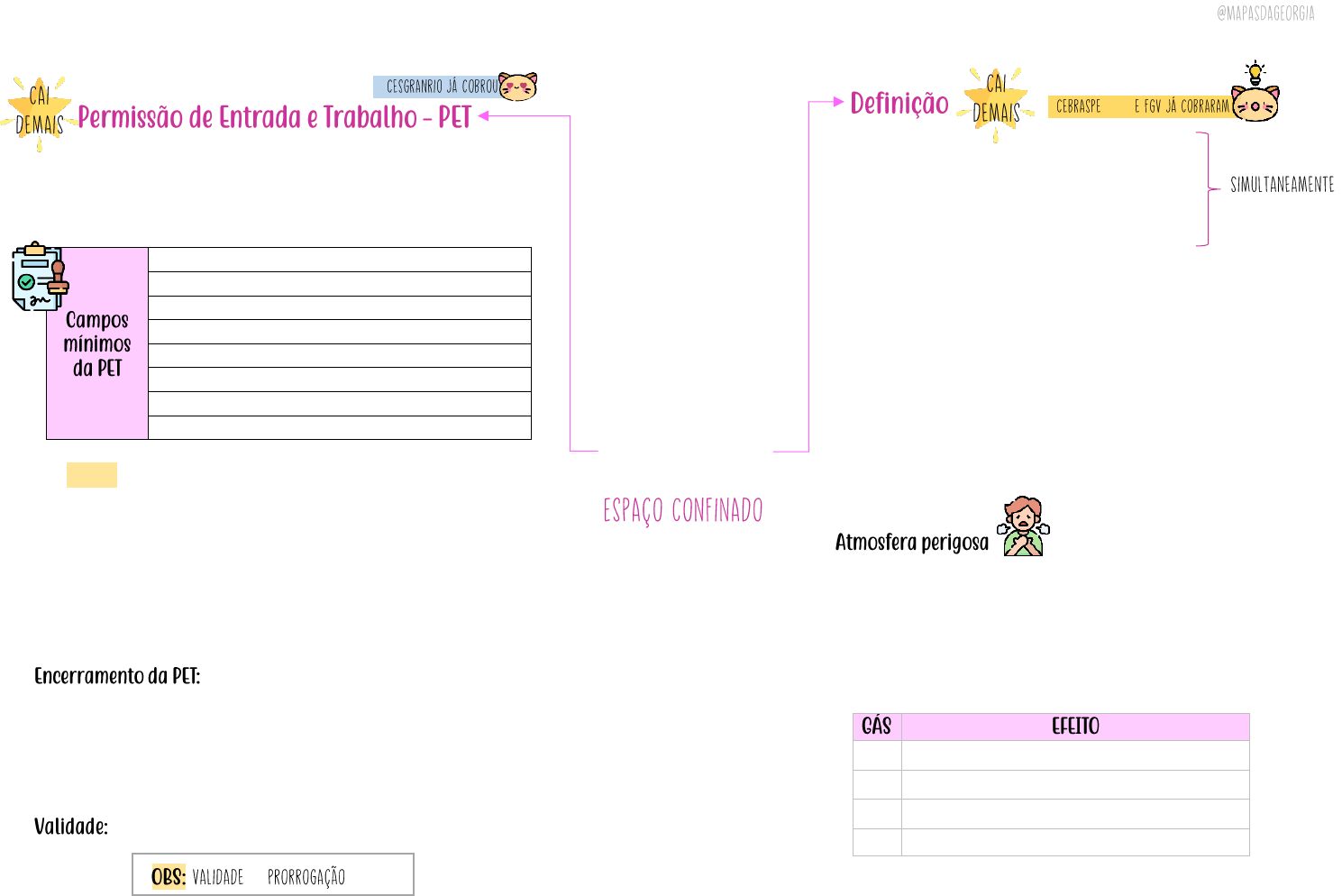 <p> Não projetado para ocupação humana</p><p>contínua;</p><p> Meios limitados de entrada e saída;</p><p> Exista/ possa existir atmosfera perigosa</p><p>ou</p><p> Não destinado para ocupação humana</p><p>contínua, com meios limitados de entrada e</p><p>saída, utilizados para armazenar material</p><p>com potencial p/ engolfar ou afogar o</p><p>trabalhador</p><p> Deficiência (23%) de O2</p><p> Atmosfera explosiva;</p><p> Presença de contaminante com potencial para causar</p><p>danos à saúde</p><p>CH4 Inflamável e asfixiante simples</p><p>CO Asfixiante químico</p><p>CO2 Asfixiante simples</p><p>H2S Tóxico, asfixiante químico e inflamável</p><p> Toda entrada em espaço confinado deve ser precedida de PET</p><p> Autorização específica escrita, impressa ou digital</p><p> Medida administrativa</p><p>Identificação do espaço confinado</p><p>Objetivo da entrada</p><p>Perigos e medidas de controle</p><p>Perigos e medidas de prevenção na entrada</p><p>Avaliação quantitativa atmosférica antes da entrada</p><p>Relação dos trabalhadores envolvidos</p><p>Data e horário da emissão e encerramento</p><p>Assinatura: supervisores de entrada e vigia</p><p> 2 vias: primeira com supervisor de entrada (emite) e</p><p>segunda com vigia;</p><p> Se em meio digital: acesso permanente ao vigia +</p><p>certificação de assinatura;</p><p> Rastreável</p><p> Arquivada por 5 anos: disponível aos trabalhadores, quando</p><p>solicitado</p><p>o Atividades completadas;</p><p>o Condição não prevista;</p><p>o Saída de todos os trabalhadores do espaço confinado;</p><p>o Vigia substituído por outro não relacionado na PET.</p><p>uma jornada de trabalho, podendo ser revalidada.</p><p>+ ≤ 24h</p><p>NR 33</p><p>(5x)</p><p> PLH ou qualificado;</p><p> Identifica e elabora o cadastro de espaços confinados;</p><p> Adapta PET;</p><p> Elabora procedimentos de segurança;</p><p> Indica equipamentos utilizados para trabalho;</p><p> Elabora plano de resgate;</p><p> Coordena capacitação inicial e periódica.</p><p> Emite PET antes do início das atividades;</p><p> Executar testes e conferir equipamentos;</p><p> Implementa procedimentos contidos na PET;</p><p> Assegura que serviço de emergência e</p><p>salvamento esteja disponível e que meios de</p><p>acionamento estão operantes;</p><p> Cancela entrada de trabalho quando necessário;</p><p> Encerra PET após término das atividades;</p><p> Exerce função de vigia, quando previsto na PET;</p><p> Assegura que vigia esteja operante durante</p><p>trabalho no espaço confinado</p><p> Indicar formalmente Responsável Técnico</p><p> Assegurar meios e recursos para o Responsável</p><p>Técnico cumprir atribuições</p><p> Assegurar que o GRO contemple medidas de</p><p>prevenção</p><p> Providenciar Sinalização de Segurança e bloqueio</p><p>de espaços confinados</p><p> Fornecer informações sobre riscos e medidas de</p><p>prevenção aos trabalhadores que interajam direta</p><p>e indiretamente com o espaço confinado</p><p> Garantir equipamentos de controle de risco</p><p> Assegurar disponibilidade dos serviços de</p><p>emergência e salvamento e de simulados</p><p> Supervisionar atividades de contratadas em</p><p>espaços confinados</p><p>NR 33</p><p> Permite somente a entrada de trabalhadores</p><p>autorizados relacionados na PET;</p><p> Mantém controle do nº de trabalhadores autorizados</p><p>a entrar no espaço confinado e assegura a saída de</p><p>todos;</p><p> Permanece fora do espaço confinado, junto a entrada,</p><p>em contato permanente com os trabalhadores</p><p> Aciona equipe de emergência e salvamento;</p><p> Opera movimentadores de pessoas;</p><p> Ordena abandono do espaço confinado quando</p><p>reconhecer algum sinal de alarme, perigo, sintoma,</p><p>queixa, , situação não prevista ou quando não puder</p><p>desempenhar suas tarefas nem puder ser substituído;</p><p> Não realizar outra tarefa durante operações</p><p> Comunica ao supervisor de entrada qualquer</p><p>imprevisto, inclusive ordem de abandono.</p><p>o vigia pode atender a mais de um espaço confinado, desde</p><p>que:</p><p> Permaneça junto à entrada dos espaços confinados, podendo</p><p>ser assistido por sistema de vigilância/comunicação eletrônicas;</p><p> Todos os espaços confinados estejam em seu campo visual,</p><p>sem uso de equipamento eletrônico;</p><p> O nº de espaços confinados não prejudique as funções</p><p> Espaços confinados executem a mesma atividade</p><p> Tenha, no máximo, 2 trabalhadores em cada espaço confinado</p><p> Seja possível visualizar os trabalhadores pelo acesso do espaço</p><p>confinado</p><p> Interna (com funcionários da empresa) ou</p><p>externa (contratada/ pública)</p><p> Dimensionada de acordo com geometria,</p><p>acessos e riscos das atividades e operação de</p><p>resgate.</p><p> Assegura que medidas de salvamento e</p><p>primeiros socorros estejam operantes</p><p> Participam do exercício simulado anual de</p><p>salvamento, que contemple cenários de</p><p>acidentes em espaços confinados, conforme</p><p>plano de resgate;</p><p>NR 33</p><p> Cumprir orientações recebidas em treinamentos</p><p>e procedimentos previstos em PET;</p><p> Utilizar adequadamente meios e equipamentos;</p><p> Comunicar ao vigia ou supervisor de entrada</p><p>situações de risco</p><p>4x</p><p>NR 33</p><p>Deve considerar:</p><p> Existência e construção de novos espaços</p><p>confinados;</p><p> Alteração da geometria ou meios de acesso;</p><p> Utilização dos espaços confinados que implique</p><p>alteração dos perigos anteriormente existentes.</p><p>Ocorre quando o trabalho no espaço confinado não</p><p>puder ser evitado.</p><p>Deve considerar:</p><p> Perigos existentes nas adjascencias do espaço</p><p>confinado e que possam interferir nas condições</p><p>de segurança;</p><p> Possibilidade de formação de atmosfera perigosa;</p><p> Necessidade de controle de energias perigosas;</p><p> Demais medidas de pre