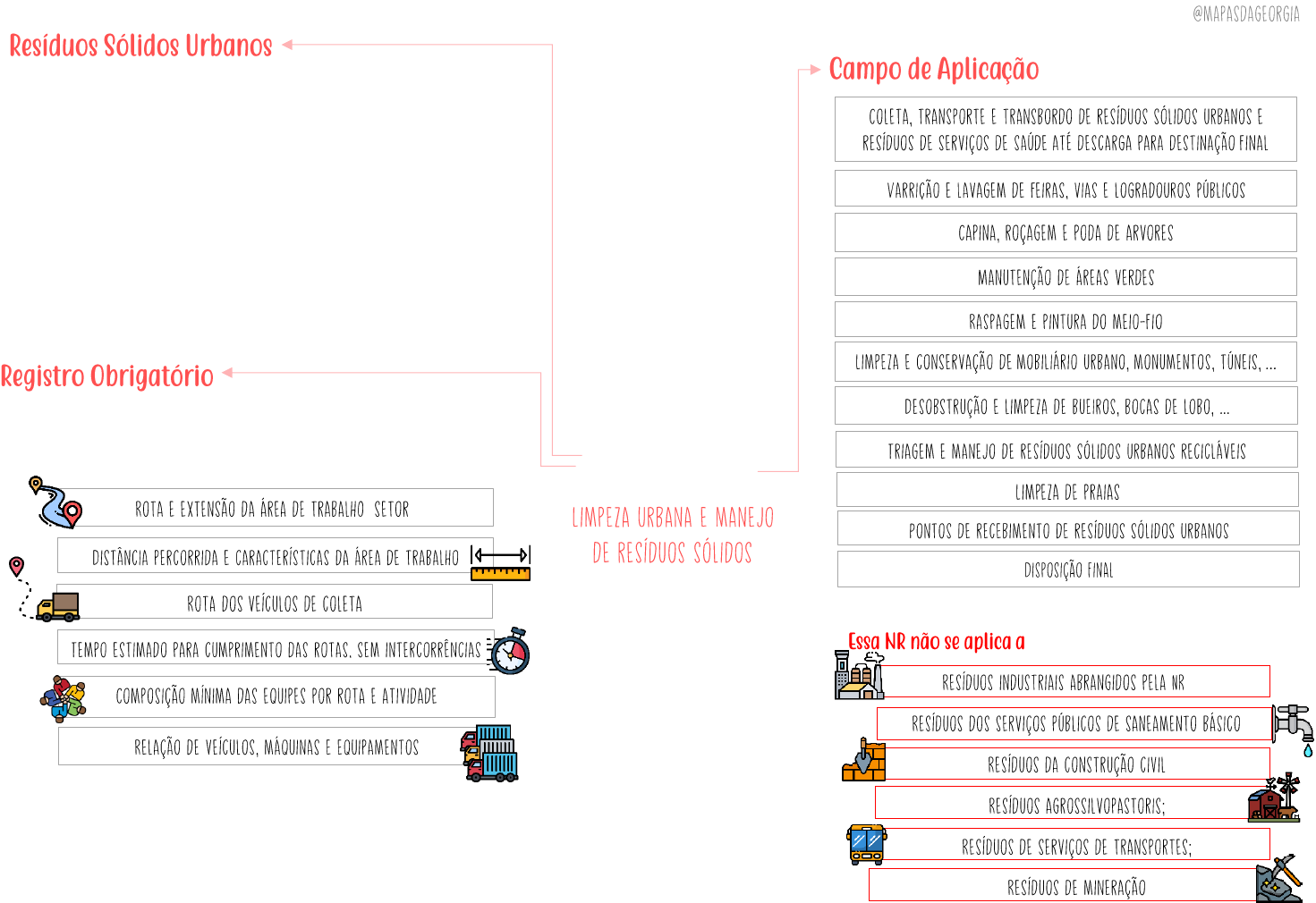 <p>NR 38</p><p>25</p><p>Consideram-se resíduos sólidos urbanos</p><p> Resíduos domésticos;</p><p> Resíduos de atividades comerciais, industriais e serviços</p><p>similares aos resíduos domésticos, que por decisão do</p><p>titular seja considerado resíduo sólido urbano, desde que</p><p>esses resíduos não sejam de responsabilidade do seu</p><p>gerador;</p><p> Resíduos originários das atividades do campo de aplicação.</p><p>Deve ser mantido registro atualizado de todos os logradouros onde</p><p>as atividades são desenvolvidas, contendo informações sobre:</p><p> O registro deve conter informações para realização de AEP</p><p>das situações de trabalho e AET quando aplicável;</p><p> As informações devem permanecer à disposição da CIPA,</p><p>quando solicitado, sendo permitido sistema informatizado.</p><p>( )</p><p>NR 38</p><p> Em locais estratégicos</p><p> Objetivo: satisfação de necessidades fisiológicas e tomada de</p><p>refeições para os trabalhadores que realizam atividades</p><p>externas;</p><p> Deve atender Anexo II da NR 24;</p><p> Pontos de apoio conveniados: empregador deve monitorar</p><p>condições de uso;</p><p> Canais de comunicação: obrigatórios, para que trabalhadores</p><p>possam relatar condições encontradas nos pontos de apoio.</p><p>A organização deve</p><p>Recipientes de armazenamento devem ser abastecidos no início</p><p>da jornada e higienizados periodicamente ou a final de cada</p><p>jornada;</p><p>Recipientes individuais para consumo: proibido uso coletivo.</p><p>Deve observar</p><p> Normas de trânsito;</p><p> Transporte de ferramentas e materiais de trabalho em</p><p>compartimento resistente e fixo, separado dos trabalhadores.</p><p>Quando existente, organização deve implementar procedimento</p><p>de segurança, incluindo sinalização de advertência.</p><p> Vacinação, principalmente contra tétano e hepatite B,</p><p>considerando avaliação de riscos ocupacionais do PGR;</p><p> Pode ser aceita vacinação anterior, a critério médico;</p><p> Trabalhadores devem ter acesso à material informativo sobre:</p><p> Necessidade da vacina e seus benefícios;</p><p> Possíveis riscos por falta ou recusa dessa vacinação.</p><p> : deve ser fornecido ao empregado</p><p>comprovante das vacinas;</p><p> : organização deve solicitar aos</p><p>empregados o certificado de vacinação.</p><p> A vacinação, ou sua recusa, deve ser registrada no prontuário</p><p>clínico individual do empregado.</p><p>Caso haja risco avaliado no PGR, PCMSO deve estabelecer</p><p>procedimento específico, com ou sem afastamento, incluindo</p><p>acompanhamento da evolução clinica</p><p>NR 38</p><p> Colocação de resíduos no caminhão: apenas com veículo parado.</p><p> Pontos de descarga de combustão dos veículos: acima da</p><p>carroceria, com catalizador e silencioso;</p><p> Coleta de resíduos domiciliares: veículo que não exija</p><p>movimentação habitual em altura superior à do ombro dos</p><p>trabalhadores.</p><p> Somente pode ser utilizada em veículos coletores compactadores;</p><p> Trabalhadores não devem permanecer durante compactação;</p><p> Subida e descida apenas com veículo parado;</p><p> Velocidade do caminhão limitada a 10km/h nas áreas de</p><p>trabalho;</p><p> Motorista deve esperar coletor acionar sinal sonoro antes de</p><p>mover veículo;</p><p> Vedada a permanência dos coletores na plataforma durante</p><p>marcha ré;</p><p> Plataforma deve suportar, no mínimo 250kg no ponto</p><p>mais distante do ponto de fixação;</p><p> Cada balaústre deve poder suportar 250kg.</p><p> Preferencialmente no contrafluxo do trânsito</p><p> Organização responsável por transporte e guarda antes e após</p><p>serviço e manutenção periódica.</p><p> Ser de material leve e de fácil higienização;</p><p> Altura que não dificulte colocação do resíduo;</p><p> Possuir suporte para ferramentas;</p><p> Possuir pneus/rodas que facilitem movimentação;</p><p> Possuir faixas refletivas quando usado em trabalho noturno.</p><p>Deve possuir:</p><p> Controles do ciclo de compactação, localizados na lateral;</p><p> Sinalizador rotativo ou intermitente na traseira e dianteira;</p><p> Câmera de monitoramento sem captação de som, com</p><p>acionamento automático em marcha ré;</p><p> Sinal sonoro de ré;</p><p> Sistema de iluminação acima das áreas de carregamento e</p><p>descarregamento;</p><p> Estofamento em bom estado de conservação e limpeza;</p><p> Sinal sonoro, com acionamento na parte traseira;</p><p> Dispositivos de parada de emergência do mecanismo de</p><p>compactação em cada lateral do veículo</p><p>.</p><p> Deve indicar emissão de Permissão de Trabalho (PT), quando</p><p>necessário</p><p> Deve ser:</p><p> Realizada pela equipe envolvida na poda;</p><p> Coordenada por supervisor responsável;</p><p> Registrada em documento, podendo ser eletrônico;</p><p> Assinada por todos os participantes.</p><p> Deve considerar:</p><p> Local e seu entorno, incluindo área de projeção da</p><p>queda dos galhos;</p><p> Isolamento e sinalização no entorno da área de trabalho;</p><p> Integridade física da árvore (análise visual externa);</p><p> Seleção de ferramentas e técnicas: deve-se evitar</p><p>trabalho em altura;</p><p> Condições impeditivas de trabalho;</p><p> Riscos adicionais, especialmente proximidade das</p><p>instalações elétricas.</p><p>NR 38</p><p>( )</p><p>Poda de Árvores</p><p> Deve conter:</p><p> Disposições e medidas da AR;</p><p> Requisitos para execução segura das atividades;</p><p> Participantes da equipe e atividades autorizadas;</p><p> Forma de comunicação entre podador e auxiliares.</p><p> Deve ser:</p><p> Aprovada por supervisor responsável;</p><p> Assinada por todos os participantes;</p><p> Disponibilizada no local da atividade.</p><p> Limitada a duração da atividade, não podendo exceder 24h.</p><p> Pode ser revalidada pelo responsável se não ocorrerem</p><p>mudanç