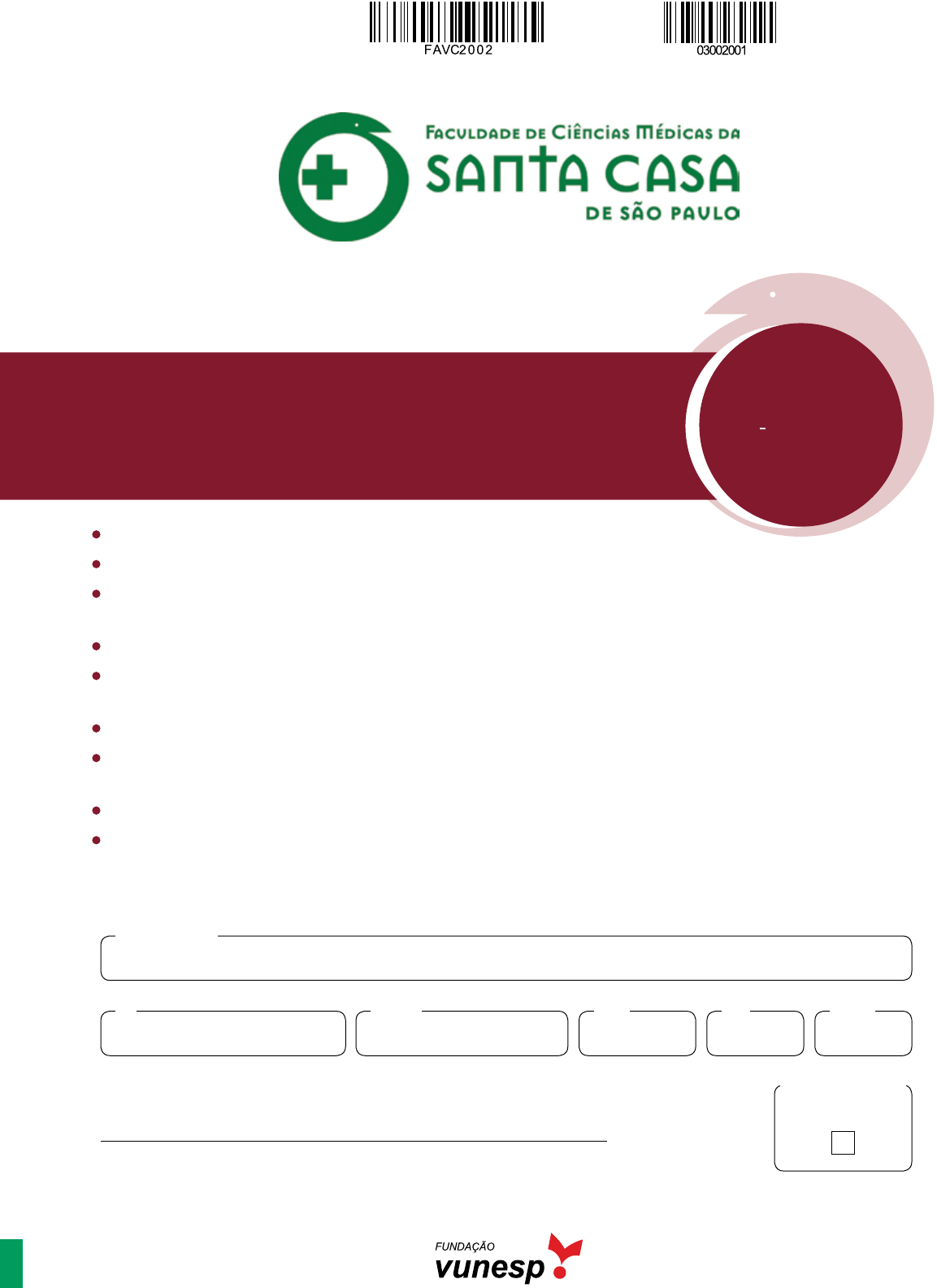 <p>Confira seus dados impressos neste caderno.</p><p>Nesta prova, utilize caneta de tinta preta.</p><p>Assine apenas no local indicado. Será atribuída nota zero à questão que apresentar nome, rubrica, assinatura,</p><p>sinal, iniciais ou marcas que permitam a identificação do candidato.</p><p>Esta prova contém 20 questões discursivas e uma proposta de redação.</p><p>A resolução e a resposta de cada questão devem ser apresentadas no espaço correspondente. Não serão</p><p>consideradas respostas sem as suas resoluções, nem as apresentadas fora do local indicado.</p><p>Encontra-se neste caderno a Classificação Periódica, que poderá ser útil para a resolução de questões.</p><p>Esta prova terá duração total de 4h e o candidato somente poderá sair do prédio depois de transcorrida 1h,</p><p>contada a partir do início da prova.</p><p>Os últimos três candidatos deverão se retirar juntos da sala.</p><p>Ao final da prova, antes de sair da sala, entregue ao fiscal a Folha de Redação e o Caderno de Questões.</p><p>ausente</p><p>usO eXCLusIVO DO FIsCaL</p><p>Assinatura do candidato</p><p>Nome do candidato</p><p>Prédio Sala CarteiraInscriçãoRG</p><p>002. PROVa De</p><p>COnHeCIMentOs esPeCÍFICOs e ReDaÇÃO</p><p>Medicina</p><p>VestIbuLaR</p><p>1o Semestre</p><p>de 2021</p><p>2FAVC2002 | 002-CE-Redação</p><p>3 FAVC2002 | 002-CE-Redação</p><p>ResOLuÇÃO e ResPOsta</p><p>RASCUNHO</p><p>01</p><p>Muitos rios e mananciais recebem uma quantidade excessiva de poluentes, como detergentes não biodegradáveis ou</p><p>poluentes persistentes (que se degradam muito lentamente), além de alto volume de esgoto doméstico, que deveria passar</p><p>por uma estação de tratamento antes de ser lançado no meio ambiente.</p><p>a) O lançamento do esgoto doméstico em um rio ou lago promove inicialmente a multiplicação de algas, que morrem depois</p><p>de um tempo. Por que ocorrem esses dois fenômenos antagônicos?</p><p>b) Uma das etapas do tratamento de esgoto consiste em utilizar apenas um agitador para continuar a decomposição e</p><p>evitar a produção de gases tóxicos gerados por bactérias anaeróbias. Explique por que o agitador evita a produção de</p><p>gases tóxicos.</p><p>QuestÃO</p><p>4FAVC2002 | 002-CE-Redação</p><p>ResOLuÇÃO e ResPOsta</p><p>RASCUNHO</p><p>02</p><p>O gráfico ilustra o pH ideal em que as enzimas lisossômicas atuam, e as figuras numeradas de 1 a 3 mostram três possíveis</p><p>migrações de substâncias, como os íons H+ e bicarbonatos, do citosol para o interior dos lisossomos.</p><p>A</p><p>ti</p><p>v</p><p>id</p><p>a</p><p>d</p><p>e</p><p>e</p><p>n</p><p>z</p><p>im</p><p>á</p><p>ti</p><p>c</p><p>a</p><p>5 pH</p><p>H+</p><p>H+</p><p>H+</p><p>H+</p><p>H+</p><p>H+</p><p>HCO3</p><p>–</p><p>HCO3</p><p>–</p><p>HCO3</p><p>–</p><p>HCO3</p><p>–</p><p>HCO3</p><p>–</p><p>HCO3</p><p>–</p><p>1 2 3</p><p>a) Em qual organela membranosa são produzidas as enzimas lisossômicas? Cite a função dos lisossomos nas células.</p><p>b) Qual das figuras ilustra a migração de íons que ocorre nos lisossomos em atividade normal? Explique a sua escolha de</p><p>acordo com o gráfico apresentado.</p><p>QuestÃO</p><p>5 FAVC2002 | 002-CE-Redação</p><p>ResOLuÇÃO e ResPOsta</p><p>RASCUNHO</p><p>03</p><p>A figura ilustra uma árvore cujo tronco foi seccionado. O detalhe mostra os anéis de crescimento produzidos durante 30 anos</p><p>de vida dessa árvore.</p><p>(www.nicepng.com. Adaptado.)</p><p>a) Cite o número que representa o anel de crescimento mais antigo. Qual tipo de clima é mais favorável à formação de um</p><p>tipo de árvore com anéis de crescimento bem definidos?</p><p>b) Suponha que alguém tenha feito o desenho de um coração no tronco dessa árvore, a 1 metro do solo, quando ela tinha</p><p>10 anos de vida, e que o nível do solo não tenha sido alterado. Aos 30 anos de vida da árvore, a que altura estará o</p><p>desenho? Justifique sua resposta citando os tecidos vegetais que estão em atividade no tronco da árvore.</p><p>QuestÃO</p><p>6FAVC2002 | 002-CE-Redação</p><p>ResOLuÇÃO e ResPOsta</p><p>RASCUNHO</p><p>04</p><p>A imagem ilustra um corte transversal do anfioxo, com destaque para a região dorsal.</p><p>Tubo neural</p><p>X</p><p>(www.bio.sunyorange.edu)</p><p>a) Qual é a estrutura indicada por X? Cite o folheto embrionário que origina essa estrutura.</p><p>b) Sabe-se que a formação do tubo neural no ser humano depende fundamentalmente de uma vitamina. Que vitamina é</p><p>essa? Cite um órgão que se origina a partir do tubo neural.</p><p>QuestÃO</p><p>7 FAVC2002 | 002-CE-Redação</p><p>ResOLuÇÃO e ResPOsta</p><p>RASCUNHO</p><p>05</p><p>A figura ilustra a composição vascular e o tecido epitelial de um órgão do sistema digestório humano.</p><p>Célula epitelial</p><p>Célula</p><p>epitelial</p><p>Capilar</p><p>sanguíneo</p><p>Lácteo</p><p>(modificação do</p><p>vaso linfático)</p><p>Vaso</p><p>linfático</p><p>Arteríola</p><p>Vênula</p><p>(https://biobanter.wordpress.com. Adaptado.)</p><p>a) Cite a modificação da membrana celular que permite a identificação desse órgão. Cite a função dessa modificação da</p><p>membrana celular.</p><p>b) A vascularização desse órgão é dada pelos capilares sanguíneos e pelo vaso linfático. Qual a função de cada um desses</p><p>vasos presentes nessa região?</p><p>QuestÃO</p><p>8FAVC2002 | 002-CE-Redação</p><p>ResOLuÇÃO e ResPOsta</p><p>RASCUNHO</p><p>06</p><p>Uma espécie de planta pode produzir flores amarelas, brancas e vermelhas, conforme a sua composição genotípica. Em</p><p>um experimento, plantas puras com flores amarelas foram cruzadas com plantas puras com flores brancas, o que gerou</p><p>uma descendência com 100% de plantas com flores vermelhas (F1). Quando as plantas de F1 foram autofecundadas, o</p><p>resultado foi uma proporção de 9 plantas com flores vermelhas para 3 com flores amarelas e para 4 com flores 