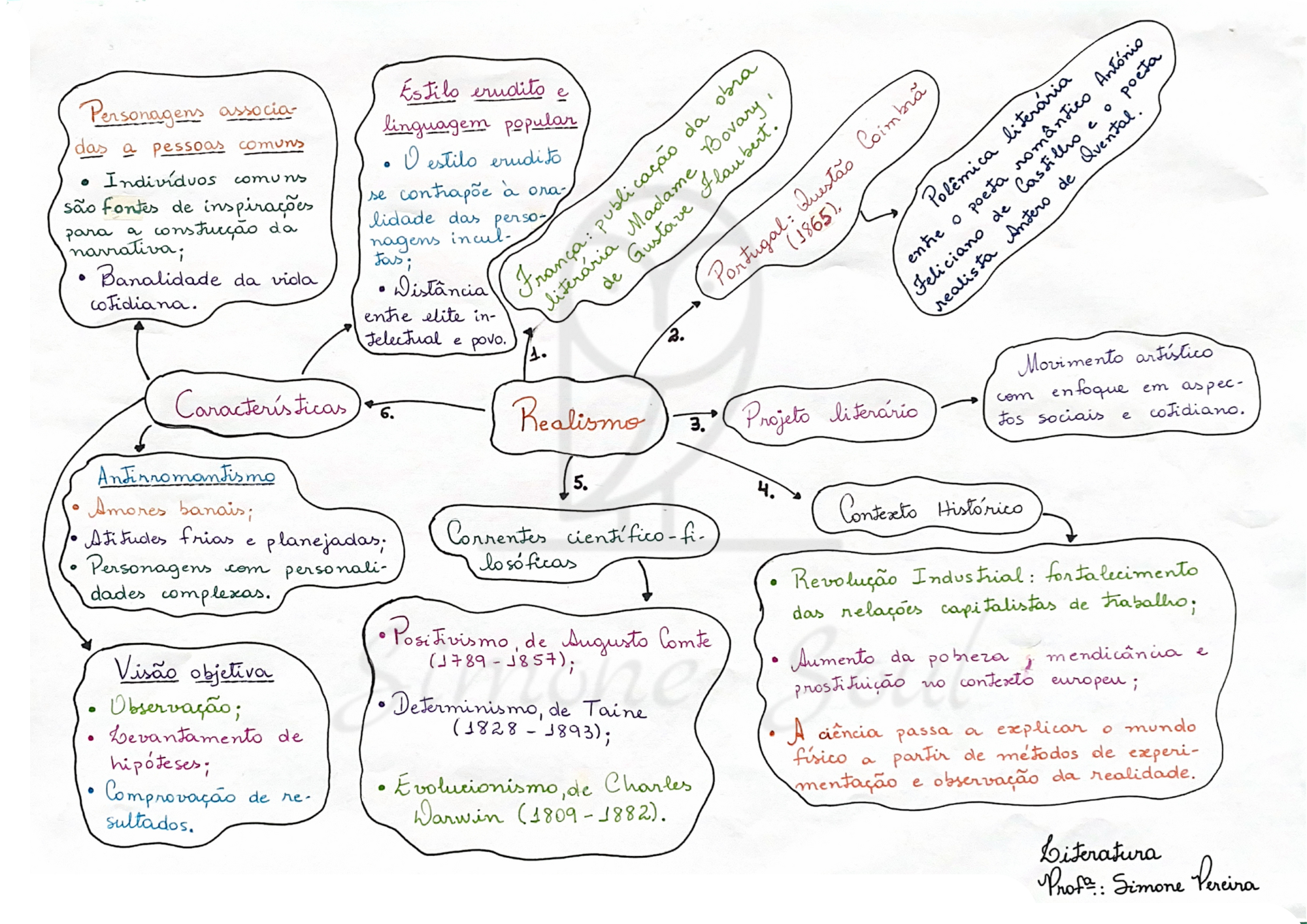 erudito e Personagens associa- linguagem popular das a pessoas comuns estilo erudito Individuos comuns se contrapõe a de inspirações de lidade das perso- para a da nagens Banalidade da viola coFidiana. entie elite in- e povo. 2. 1. Movimento artistico com enfoque em aspec- 6. Realismo 3. Projeto literario tos sociais e 5. 4. Amores frias e planejadas; Correntes Personagens com personali- losóficas Revolução fortalecimento dades complexas. das capitalistas de trabalho; de Augusto Comte Visao objetiva Aumento da e no contexto Determinismo, de Taine de A ciência passa a explicar mundo hipóteses; físico a partir de de experi- Comprovação de re- Evolucionismo, de Charles mentação e observação da realidade. sultados. Warwin (1809-1882). Literatura Simone