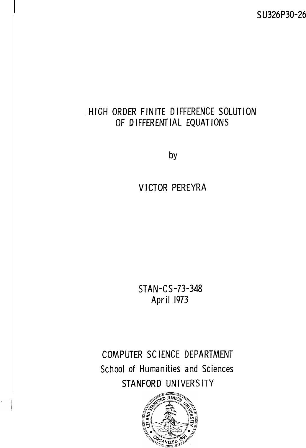 <p>SU326P30-26</p><p>*HIGH ORDER FINITE DIFFERENCE SOLUTION</p><p>OF DIFFERENTIAL EQUATIONS</p><p>VICTOR PEREYRA</p><p>STAN-CS-73-348</p><p>April 1973</p><p>COMPUTER SCIENCE DEPARTMENT</p><p>School of Humanities and Sciences</p><p>STANFORD UNIVERSITY</p><p>HIGH ORDER FINITE DIFFERENCE SOLUTION OF DIFFERENTIAL EQUATIONS</p><p>- v. pereyra*</p><p>c</p><p>c</p><p>April 1973</p><p>i</p><p>L</p><p>L</p><p>*</p><p>This report was written while the author was a Visiting Professor during</p><p>the Winter quarter 142-73. Computing and other support was provided by</p><p>Contract NSF GJ-35135X. Permanent address: Departamento de Computaci&t,</p><p>Fat. Ciencias, Univ. Central de Venezuela, Apartado 590(X, Caracas.</p><p>HIGH ORDER FINITE DIFFERENCE SOLUTION</p><p>OF DIFFERENTIAL EQUATIONS</p><p>V. Pereyra</p><p>c</p><p>Abstract</p><p>L</p><p>L-</p><p>i</p><p>!</p><p>These seminar notes give a detailed treatment of finite difference</p><p>approximations to smooth nonlinear two-point boundary value problems for</p><p>second order differential equations. Consistency, stability, convergence,</p><p>and asymptotic expansions are discussed. Most results are stated in such</p><p>a way as to indicate extensions to more general problems, Successive</p><p>extrapolations and deferred corrections are described and their implemen-</p><p>tations are explored thoroughly. A very general deferred correction gen-</p><p>erator is developed and it is employed in the implementation of a variable</p><p>order, variable (uniform) step method. Complete FORTRAN programs and</p><p>extensive numerical experiments and comparisons are included together</p><p>with a set of 48 references.</p><p>cI., -L</p><p>-</p><p>L -</p><p>-</p><p>c</p><p>c</p><p>L</p><p>-2-</p><p>TABLE OF CONTENTS</p><p>I. INTRODUCTION. . . . . . . . . . . . . . . . . . . . . . . . .</p><p>II. TWO POINT BOUNDARY VALUE PROBLEMS FOR NONLINEAR SECOND</p><p>ORDER DIFFERENTIAL EQUATIONS . . . . . . . . . . . . . . . . . . 8</p><p>3-.</p><p>2.</p><p>3.</p><p>4.</p><p>5.</p><p>6.</p><p>The problem and its discretization . . . . . . . . . . . . 8</p><p>Consistency, stability and convergence . . . . . . . . . . I.2</p><p>An asymptotic expansion for the global discretization</p><p>error . . . . . . . . . . . . . . . . .</p><p>. . . . . . . . . . 16</p><p>Successive extrapolations . . . . . . . . . . . . . . . . . 19</p><p>Some comments on implementation . . . . . . . . . . . . . . 20</p><p>Deferred corrections . . . . . . . . . . . . . . . . . . . 22</p><p>6.1.</p><p>6.2.</p><p>6.3.</p><p>6.k</p><p>6.!j.</p><p>Lt;.</p><p>6.7.</p><p>Introduction . . . . . . . . . . . . . . . . . . . . 22</p><p>Algorithms . . . . . . . . . . . . . . . . . . . . . 25</p><p>An O(h8) method for the price of</p><p>an O(h2) method . . . . , . . . . . . . . . . . . 29</p><p>Some numerical results , . . . . . . . . . . . . . . 32</p><p>Discussion of' results and comparisons . . . . , . . $8</p><p>A II'ORTRAN IV program f'or the 8O(h )</p><p>method of II.63 . . . . . . . . . . . . . . . . . . 41</p><p>Operation count . . . . . . . . . . . . . . . . . . 50</p><p>i</p><p>Successive extrapolations (SE) . . . . . . . . . . . 52</p><p>III. COMPUTER IMPLEMENTATION OF ITERATED DEFERRED CORRECTIONS</p><p>FOR BOUNDARY VALUE PROBLEMS . . . . . . . . . . . . . . . . . . 61</p><p>IL</p><p>c</p><p>L</p><p>1. An automatic weight generator for numerical</p><p>differentiation and other applications . . . . . . . . . . 61</p><p>2. A Universal 2-point boundary value Deferred</p><p>Co&e&ion GGnerator . . . . . . .-. . . . . . . . . . . .</p><p>L</p><p>-5-</p><p>3. Asymptotic error estimation by deferred correction . . . . 70</p><p>4. A variable order, variable (uniform) step, two point</p><p>boundary value problem solver, based on deferred</p><p>corrections . . . . . . . . . . . . . . . . . . . . . . . 72</p><p>5. Numerical results . . . . . . . . . . . . . . . . . . . . 78</p><p>REFERENCES..............* . . . . . . . . . 83</p><p>t</p><p>t-</p><p>L</p><p>Q-</p><p>ei+-</p><p>L</p><p>L</p><p>L</p><p>t</p><p>F</p><p>L</p><p>PL</p><p>b</p><p>/</p><p>I</p><p>/</p><p>i</p><p>HIGH ORDER FINITE DIFFERENCE SOLUTION OF DIFFERENTIAL EQUATIONS</p><p>V. Pereyra</p><p>I. Introduction</p><p>These notes correspond to a six-week Seminar offered during the Winter</p><p>quarter 1972-73. In them, we intend to give an overview on certain gen-</p><p>era1 techniques that permit the increase of the order of accuracy of simple</p><p>discretizations to differential equations. Also, we will examine in detail</p><p>one specific application. This will lead us naturally to consider some</p><p>efficient tools which will permit the graceful implementation of the methods.</p><p>We shall consider the basic ideas in relation to a simple application:</p><p>the two point boundary problem.</p><p>(l.la) -y"(x) + f(x,y) = 0 ,</p><p>(l.lb) y(a) = CY , y(b) = S .</p><p>Most of the elements of the general theory are present here and we</p><p>shall emphasize those points which are basic and can be transferred to</p><p>other applications.</p><p>- The problem and an O(h2) discretization are presented in Chapter</p><p>II. The notions of consistency, stability and convergence are developed,</p><p>and an asymptotic expansion for the global discretization error is obtained.</p><p>The method of successive extrapolations is introduced in Section II.4</p><p>together with some comments on implementation.</p><p>In Section 11.6, the method of deferred corrections is treated. An</p><p>algorithm for obtaining an</p><p>8O(h ) discrete approximation with a cost</p><p>I</p><p>t -4-</p><p>E :</p><p>L</p><p>c</p><p>L-</p><p>i</p><p>1</p><p>t</p><p>-5-</p><p>similar to the method of order O(h2) of II.1 is described in 11.6.3.</p><p>Numerical results for a set of four test problems frequently found in the</p><p>literature are obtained with a FORTRAN computer implementation (Section</p><p>11.6.6). An operation count and comparisons with the successive extra-</p><p>polations me