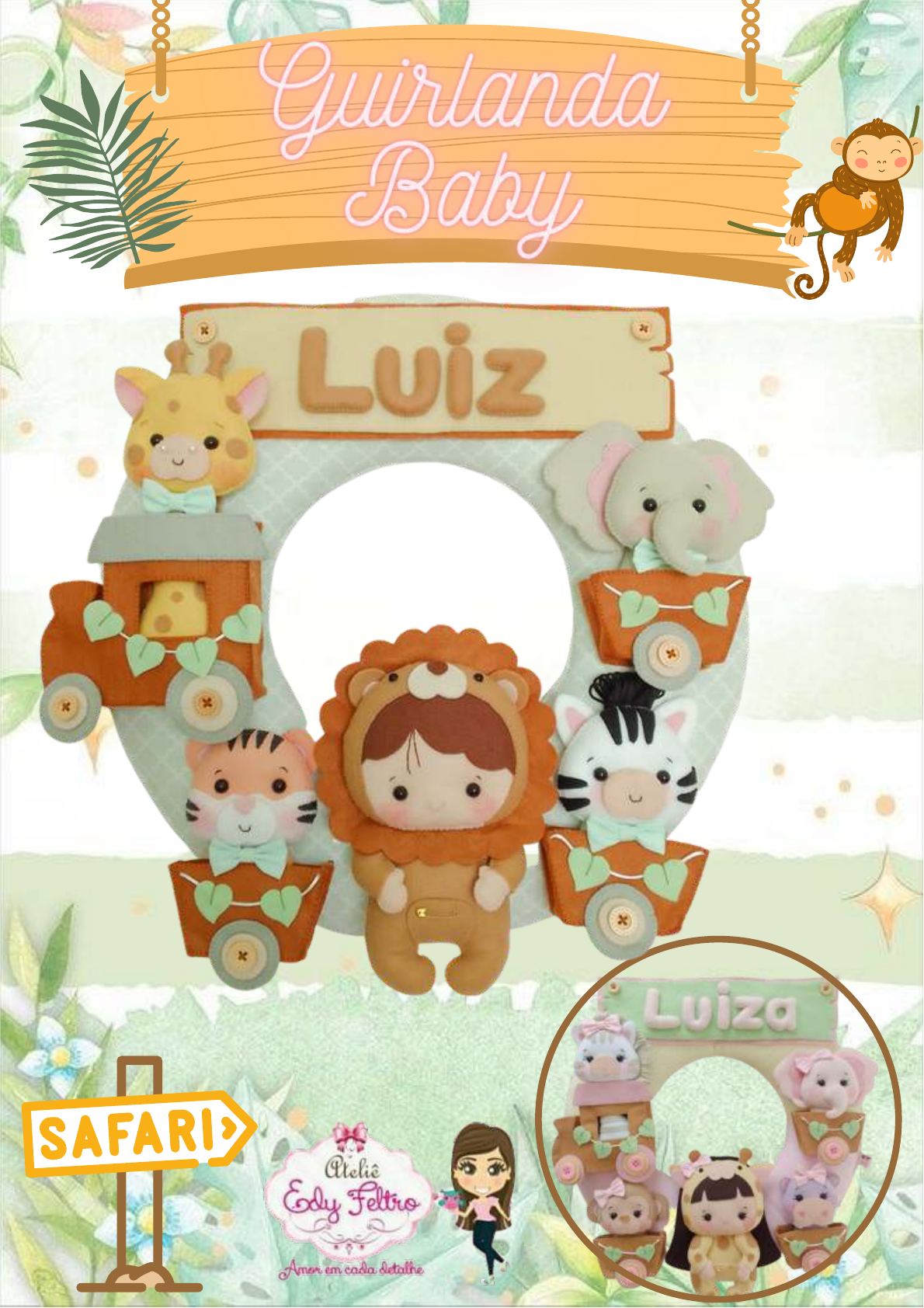 <p>Me chamo Edvânia Bezerra sou artesã, trabalho</p><p>com feltro desde 2013. Tenho 36 anos, casada e</p><p>mãe de 3 filhos. Ao longo dessa caminhada como</p><p>artesã já desenvolvi muitos projetos digitais, ao</p><p>todo 12 apostilas. Esse é mais um projeto que trago</p><p>hoje para abençoar e facilitar a sua vida amiga,</p><p>colega artesã. Espero que seja uma experiência</p><p>maravilhosa confeccionar essas guirlandas</p><p>preparadas com todo carinho pra você.</p><p>Lista de MateriaisLista de MateriaisLista de MateriaisLista de MateriaisLista de Materiais</p><p>40 cm de tecido tipo tricoline na cor que você desejar.</p><p>Papelão bem resistente aproximadamente 50 cm</p><p>Manta acrílica</p><p>Manta R1</p><p>Feltro branco.</p><p>Argola acrílica pequenininha</p><p>Para a base da guirlanda</p><p>Feltro nas cores</p><p>Branco 035</p><p>Creme 012</p><p>Bege palha 072</p><p>Amarelo Roma 055</p><p>Caramelo Havaí 056</p><p>Cinza Baby 095</p><p>Caramelo 058</p><p>Gelo 073</p><p>Verde caribe 222</p><p>Nude 023</p><p>Rosa poente 088</p><p>Nude Capri 047</p><p>Marrom 025</p><p>Preto 034</p><p>Botões decorativos para placa com nome 2 unidades</p><p>Botões decorativos para rodas do trem 5 unidades.</p><p>Alfinete dourado pequeno</p><p>Tecido tricoline para lacinhos</p><p>Bichinhos Guirlanda meninos</p><p>45 cm de fio acetinado branco fininho.</p><p>Lista de MateriaisLista de MateriaisLista de MateriaisLista de MateriaisLista de Materiais</p><p>Feltro nas cores</p><p>Branco 035</p><p>Creme 012</p><p>Amarelo Roma 055</p><p>Caramelo Havaí 056</p><p>Cinza Baby 095</p><p>Marrom terra 027</p><p>Rosa poente 088</p><p>Rosa nascente 015</p><p>Verde Caribe 222</p><p>Caramelo Baby 216</p><p>Nude 023</p><p>Violeta Light 215</p><p>Alfinete dourado pequeno</p><p>Tricoline para os lacinhos</p><p>Material comum</p><p>Enchimento acrílico</p><p>Tesoura</p><p>Cola fria de silicone líquida</p><p>45 centímetros de fio acetinado branco fininho.</p><p>Cola quente</p><p>Linhas para costura nas cores do feltro</p><p>Botões decorativos para placa com nome 2 unidades</p><p>Botões decorativos para rodas 5 unidades</p><p>Agulha</p><p>Meia pérola para olhinhos 08mm preta</p><p>Bichinhos Guirlanda meninas</p><p>Blush ou tinta de tecido Rosa chá para marcar as bochechas</p><p>Guirlanda Baby Menina</p><p>Guirlanda Baby Menino</p><p>Guirlanda Baby Menino</p><p>Guirlanda Baby Menino</p><p>Passo a Passo Guirlanda</p><p>Vamos iniciar esse lindo projeto pela base da guirlanda.</p><p>01.Escolha um tecido de boa qualidade para confecção da guirlanda, aqui temos 50 centímetros de</p><p>tricolor.</p><p>03 - 04- Passe cola escolar ou termolina leitosa no risco para o tecido não desar. Deixe secar ao sol.</p><p>02.O molde disponível na apostila deve ser riscado sobre uma cartolina 4 vezes para formar o círculo</p><p>completo. Para o tecido use o molde maior. Risque o molde da guirlanda no avesso do tecido.</p><p>05 . Recorte o tecido.</p><p>06. Com o mesmo molde usado para o tecido risque 2 partes no feltro branco.</p><p>07 - 08. Com o mesmo molde usado para o tecido e o feltro risque as mantas aqui usei 4 camadas de</p><p>manta.</p><p>09. Risque o molde menor da Guirlanda em uma cartolina e passe para o papelão.</p><p>Passo a Passo Guirlanda</p><p>Outra camada de feltro branco;</p><p>Tecido com lado acesso para baixo.</p><p>Tecido com lado acesso para cima;</p><p>10-11. Começando a montagem para costura:</p><p>Uma camada de feltro branco;</p><p>15. Feita a costura separe a camada de cima da de baixo como na foto .</p><p>12-13-14. Ao todo são 4 camadas tecido, feltro, feltro e tecido. Passe alnetes em toda a volta do círculo</p><p>menor e faça o caseado em toda a volta.</p><p>16- Passe cola no feltro branco na parte de baixo da guirlanda.</p><p>17. Cole uma camada de manta.</p><p>18. Passe cola na manta e então cole o papelão.</p><p>Passo a Passo Guirlanda</p><p>20-21+.Feito isso traga o tecido e o feltro para cima e ajuste a base aguentando tudo para facilitar a</p><p>costura. Caseie toda a volta da Guirlanda.</p><p>19. Vá colando as demais camadas de manta uma sobre a outra.</p><p>22 - 23. Para o gancho você vai precisar de um pedaço do tecido( um retângulo) da guirlanda e uma</p><p>argola acrílica pequenininha.</p><p>Dobre o tecido ao meio e passe cola quente.</p><p>27 . Cole as duas partes do tecido com cola quente .....</p><p>24 - 25 -26.Feito a colagem passe esse tecido pela argola e costure para prender bem.</p><p>Passo a Passo Guirlanda</p><p>28. ....e recorte o excesso.</p><p>29-30-31.Centralize o meio da guirlanda e cole. Recorte um pedaço</p><p>de feltro branco e com cola quente cole por cima da metade do tecido.</p><p>Passo a Passo Trenzinho e Vagão</p><p>32 -33. Para fazer o trenzinho comece colando as duas partes de feltro da frente e as duas partes de</p><p>trás que não tem janela. costure ao redor da janela.</p><p>Costure o pedacinho menor na parte interna da chaminé do trem.</p><p>34-35. Recorte dois pedacinhos de feltro nos tamanhos 3x2 cm e 5x2 cm.</p><p>36-37.</p><p>Deve car assim.</p><p>Passo a Passo Trenzinho e Vagão</p><p>38-39.Costure o pedacinho de 5x2 cm nessa parte de cima do trenzinho.</p><p>40. Costure as duas pontas que se encontram.</p><p>42-43. Costure esse pedaço na parte arredondada da frente do trem.</p><p>41. Agora recorte um pedaço de feltro de 2x7 cm para a frente do trenzinho.</p><p>44. Para a parte de baixo do trenzinho recorte um pedaço de feltro de 2×22 cm. Costure toda a base da</p><p>frente.</p><p>46. Continue costurando até em cima. Recorte a parte que sobrar.</p><p>45.Marque com caneta o local da virada.</p><p>Passo a Passo Trenzinho e Vagão</p><p>47-48. Costure essas duas partes que caram abertas.</p><p>49. Passe alnetes em toda a volta do trenzinho prendendo a parte de trás que ainda vai ser costurada.</p><p>50. Caseie tudo ao redor.</p><p>51-52. O trenzinho cará assim.</p><p>54. Costure um botão a seu gosto no detalhe do meio dos pneus