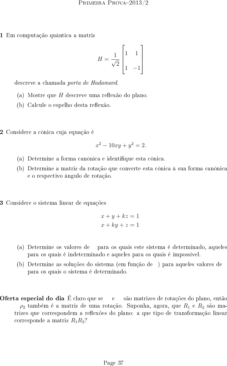 <p>Primeira Prova�2013/2</p><p>1 Em computação quântica a matriz</p><p>H =</p><p>1√</p><p>2</p><p>1 1</p><p>1 −1</p><p></p><p>descreve a chamada porta de Hadamard.</p><p>(a) Mostre que H descreve uma re�exão do plano.</p><p>(b) Calcule o espelho desta re�exão.</p><p>2 Considere a cônica cuja equação é</p><p>x2 − 10xy + y2 = 2.</p><p>(a) Determine a forma canônica e identi�que esta cônica.</p><p>(b) Determine a matriz da rotação que converte esta cônica à sua forma canônica</p><p>e o respectivo ângulo de rotação.</p><p>3 Considere o sistema linear de equações</p><p>x+ y + kz = 1</p><p>x+ ky + z = 1</p><p>kx+ y + z = 1.</p><p>(a) Determine os valores de k para os quais este sistema é determinado, aqueles</p><p>para os quais é indeterminado e aqueles para os quais é impossível.</p><p>(b) Determine as soluções do sistema (em função de k) para aqueles valores de k</p><p>para os quais o sistema é determinado.</p><p>Oferta especial do dia É claro que se ρ1 e ρ2 são matrizes de rotações do plano, então</p><p>ρ1ρ2 também é a matriz de uma rotação. Suponha, agora, que R1 e R2 são ma-</p><p>trizes que correspondem a re�exões do plano: a que tipo de transformação linear</p><p>corresponde a matriz R1R2?</p><p>Page 37</p><p>Solução</p><p>1. Para determinar que H representa uma re�exão basta mostrar que existe uma reta</p><p>r cujos vetores �cam inalterados por H (que faz o papel do espelho) e que todo vetor</p><p>ortogonal a esta reta é levado no seu oposto. Para descobrir a reta r basta resolver a</p><p>equação matricial HX = X, em que X é uma matriz de variáveis de tamanho 2 × 1.</p><p>Tomando X = [x, y]t a equação matricial será</p><p>1√</p><p>2</p><p>1 1</p><p>1 −1</p><p></p><p>x</p><p>y</p><p> =</p><p>x</p><p>y</p><p></p><p>que corresponde ao sistema linear</p><p>(</p><p>√</p><p>2− 1)x− y = 0</p><p>x− (</p><p>√</p><p>2 + 1)y = 0.</p><p>Observe que a segunda equação pode ser obtida multiplicando-se a primeira por (</p><p>√</p><p>2+1),</p><p>de modo que as duas equações são independentes. Mas, da primeira equação, temos que</p><p>y = (</p><p>√</p><p>2− 1)x,</p><p>de modo que a reta desejada tem [1,</p><p>√</p><p>2 − 1]t como vetor diretor. Portanto, um vetor</p><p>normal à esta reta é v = [1−</p><p>√</p><p>2, 1]t. Mas,</p><p>1√</p><p>2</p><p>1 1</p><p>1 −1</p><p></p><p>1−</p><p>√</p><p>2</p><p>1</p><p> =</p><p>1√</p><p>2</p><p>2−</p><p>√</p><p>2</p><p>−</p><p>√</p><p>2</p><p> =</p><p></p><p>√</p><p>2− 1</p><p>−1</p><p></p><p>de modo que Hv = −v. Veri�camos, assim, que H é realmente uma re�exão. Outra</p><p>maneira de proceder para identi�car uma re�exão é usar que uma matriz descreve uma</p><p>re�exão se, e somente se, é ortogonal e tem determinante igual a 1.</p><p>Uma terceira maneira é supor que u = [a, b]t é um vetor unitário e calcular a matriz</p><p>da re�exão cujo espelho é u. Como n = [−b, a]t é unitário e ortogonal a u, a re�exão terá</p><p>por matriz</p><p>R = I − 2nnt =</p><p>−2b2 + 1 2ab</p><p>2ab −2a2 + 1.</p><p> (1)</p><p>Para que esta matriz seja igual a H, devemos ter que</p><p>−2b2 + 1 = 1/</p><p>√</p><p>2</p><p>ab = 1/2</p><p>√</p><p>2</p><p>−2a2 + 1 = −1/</p><p>√</p><p>2.</p><p>Page 38</p><p>Da primeira e da terceira equações obtemos</p><p>b = ±</p><p>√</p><p>2−</p><p>√</p><p>2</p><p>2</p><p>e a = ±</p><p>√</p><p>2 +</p><p>√</p><p>2</p><p>2</p><p>.</p><p>Como (√</p><p>2−</p><p>√</p><p>2</p><p>2</p><p>)(√</p><p>2 +</p><p>√</p><p>2</p><p>2</p><p>)</p><p>=</p><p>√</p><p>22 −</p><p>√</p><p>2</p><p>2</p><p>4</p><p>=</p><p>√</p><p>2</p><p>4</p><p>=</p><p>1</p><p>2</p><p>√</p><p>2</p><p>,</p><p>devemos tomar a e b como tendo o mesmo sinal. Logo, o espelho terá como vetor diretor</p><p>√</p><p>2+</p><p>√</p><p>2</p><p>2</p><p>√</p><p>2−</p><p>√</p><p>2</p><p>2</p><p> =</p><p>√</p><p>2 +</p><p>√</p><p>2</p><p>2</p><p> 1</p><p>√</p><p>2−</p><p>√</p><p>2√</p><p>2+</p><p>√</p><p>2</p><p> =</p><p>√</p><p>2 +</p><p>√</p><p>2</p><p>2</p><p> 1</p><p>2−</p><p>√</p><p>2√</p><p>2</p><p> =</p><p>√</p><p>2 +</p><p>√</p><p>2</p><p>2</p><p> 1</p><p>√</p><p>2− 1</p><p> .</p><p>� Note que não basta saber que det(R) = 1, nem que R é da forma dada pela equação</p><p>(1) para podermos concluir que R é uma re�exão. Em ambos os casos precisamos saber</p><p>também que R é ortogonal.</p><p>2. A equação matricial correspondente à cônica dada é X tAX = 2, em que 1 −5</p><p>−5 1</p><p> e X =</p><p>x</p><p>y</p><p> .</p><p>O polinômio característico de A é</p><p>p(t) = det(A− tI) = det</p><p>1− t −5</p><p>−5 1− t</p><p> = (1− t)2 − 25,</p><p>donde concluímos que 1 − t = ±5. Portanto, os autovalores de A são −4 e 6. Com isto</p><p>já podemos responder a letra (a), porque os autovalores acima correspondem à cônica</p><p>6x21 − 4y21 = 2,</p><p>cuja forma canônica é</p><p>x21</p><p>1/3</p><p>− y21</p><p>1/2</p><p>= 1.</p><p>Temos, portanto, que a cônica é uma hipérbole.</p><p>Para poder determinar a rotação e responder a letra (b), calculamos o autovetor</p><p>associado ao autovalor 6. Para isto, precisamos resolver a equação matricial−5 −5</p><p>−5 −5</p><p></p><p>x</p><p>y</p><p> =</p><p>0</p><p>0</p><p> ,</p><p>Page 39</p><p>que corresponde ao sistema 5x + 5y = 0, já que as duas equações são iguais. Temos,</p><p>assim, um sistema indeterminado cujas soluções são da forma [x,−x]t. Portanto, o vetor</p><p>unitário</p><p>u =</p><p>1√</p><p>2</p><p> 1</p><p>−1</p><p></p><p>é autovetor associado a 6. Logo o autovetor associado a −4 terá que ser ortogonal a u,</p><p>de modo que podemos tomá-lo como sendo</p><p>1√</p><p>2</p><p>1</p><p>1</p><p></p><p>Logo, a rotação desejada terá por matriz</p><p>Q =</p><p>1√</p><p>2</p><p> 1 1</p><p>−1 1</p><p></p><p>e o ângulo d