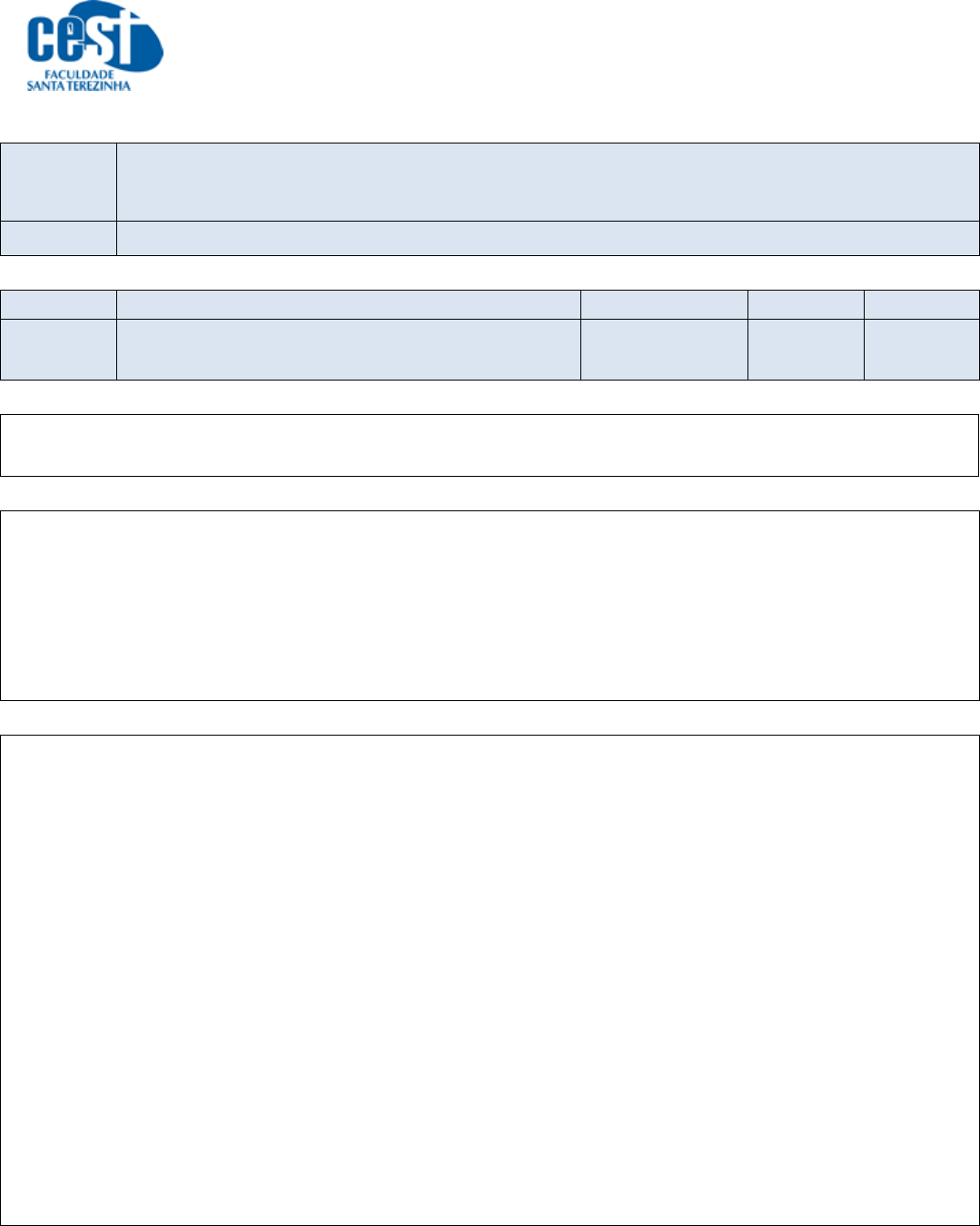 <p>FACULDADE SANTA TEREZINHA – CEST</p><p>COORDENAÇÃO DO CURSO DE FISIOTERAPIA</p><p>PLANO DE ENSINO</p><p>CEST: MISSÃO E VISÃO</p><p>Missão</p><p>Promover educação superior de excelência, formando profissionais competentes e éticos, cidadãos comprometidos com o</p><p>desenvolvimento da sociedade e com o segmento das pessoas com deficiência, conscientes de sua função transformadora.</p><p>Visão Ser referência regional em educação superior, reconhecida pela excelência de sua atuação e compromisso social.</p><p>DADOS DA DISCIPLINA</p><p>CÓDIGO NOME CH TOTAL PERÍODO HORÁRIO</p><p>RECURSOS TERAPÊUTICOS MANUAIS</p><p>60h</p><p>T - 40h T / P - 20h</p><p>4º Matutino</p><p>EMENTA</p><p>História, definições e terminologia da massagem. Massagem clássica, zonas reflexas e tecido conjuntivo. Condições básicas e</p><p>efeitos terapêuticos. Drenagem linfática. Noções básicas de massagem oriental. Massagem associada às patologias</p><p>OBJETIVOS</p><p>GERAL</p><p>Desenvolver habilidades técnicas por meio dos conhecimentos teórico-práticos sobre os Recursos Terapêuticos Manuais para</p><p>tratamento prático da massagem e manipulação de segmentos corporais.</p><p>ESPECÍFICOS</p><p>Reconhecer a importância do estudo dos Recursos Terapêuticos Manuais para o tratamento fisioterápico.</p><p>Identificar os diversos tipos de Recursos Terapêuticos Manuais (massagens).</p><p>Relacionar os tipos de procedimentos (RTM) indicados para os diversos tipos de patologias.</p><p>CONTEÚDO PROGRAMÁTICO</p><p>UNIDADE I: PERSPECTIVAS HISTÓRICAS DA MASSAGEM (4 HORAS)</p><p>1.1 Aspectos gerais</p><p>1,2 Época pré-histórica</p><p>1.3 História antiga</p><p>1.4 História moderna da massagem médica</p><p>1.5 Definição de massagem</p><p>1.6 Terminologia da massagem</p><p>UNIDADE II: DESCRIÇÃO DOS MOVIMENTOS DA MASSAGEM (4 HORAS)</p><p>2.1 Petrissage</p><p>2.2 Amassamento</p><p>2.3 Fricção</p><p>2.4 Alisamento e Effleurage</p><p>UNIDADE III: CONDIÇÕES BÁSICAS PARA A MASSAGEM TERAPÊUTICA (4 HORAS)</p><p>3.1 Aspectos éticos</p><p>3.2 Conhecimento de anatomia superficial</p><p>3.3 Preparação das mãos</p><p>3.4 Lubrificantes</p><p>3.5 Equipamentos</p><p>3.6 Posicionamento do paciente</p><p>3.7 Posição do terapeuta</p><p>3.8 Componentes da massagem</p><p>FACULDADE SANTA TEREZINHA – CEST</p><p>COORDENAÇÃO DO CURSO DE FISIOTERAPIA</p><p>PLANO DE ENSINO</p><p>UNIDADE IV: COMPONENTES DA MASSAGEM: (4 HORAS)</p><p>4.1 Direção</p><p>4.2 Pressão</p><p>4.3 Velocidade e ritmo</p><p>4.4 Meios</p><p>4.5 Posição do terapeuta e do paciente</p><p>4.6 Duração</p><p>4.7 Frequência</p><p>4.8 Alterações nos sinais e sintomas</p><p>UNIDADE V: CLASSIFICAÇÃO E DESCRIÇÃO DOS MOVIMENTOS DA MASSAGEM: (4 HORAS)</p><p>5.1 Classificação</p><p>5.2 Descrição</p><p>5.3 Manipulação de alisamento (superficial e profundo)</p><p>5.4 Manipulação de Effleurage</p><p>5.5 Manipulação de Petrissage (pressão)</p><p>5.6 Manipulação por tapotement (percussão)</p><p>5.7 Vibração</p><p>5.8 Fricções</p><p>5.9 Trações e manipulações</p><p>UNIDADE VI: EFEITOS MECÂNICOS, FISIOLÓGICOS, PSICOLÓGICOS E TERAPÊUTICOS DA MASSAGEM: (8 HORAS)</p><p>6.1 Efeito mecânico</p><p>6.2 Efeitos fisiológicos:</p><p>6.2.1 Na circulação sanguínea e linfática</p><p>6.2.2 No sangue</p><p>6.2.3 No metabolismo</p><p>6.2.4 No tecido muscular</p><p>6.2.5 Nos ossos e articulaçõe</p><p>6.2.6 No sistema nervoso</p><p>6.2.7 Na dor</p><p>6.2.8 Nas vísceras</p><p>6.2.9 Nas secreções pulmonares</p><p>6.2.10 Na pele</p><p>6.2.11 No tecido adiposo</p><p>6.3 Efeitos psicológicos</p><p>6.3.1 Relaxamento físico</p><p>6.3.2 Alívio da ansiedade e da tensão (estresse)</p><p>6.3.4 Sensação geral de bem estar</p><p>6.4 Efeitos terapêuticos principais</p><p>6.4.1 Principais usos da massagem terapêutica</p><p>6.4.2 Precauções gerais e contra-indicações</p><p>UNIDADE VII: INTRODUÇÃO À DRENAGEM LINFÁTICA: (4 HORAS)</p><p>7.1 Noções de anatomia, fisiologia e fisiopatologia do sistema linfático</p><p>7.2 Drenagem linfática manual</p><p>7.3 Drenagem da cabeça e pescoço</p><p>7.4 Drenagem de MMSS</p><p>7.5 Drenagem do tórax</p><p>7.6 Drenagem de MMII</p><p>UNIDADE VIII: MASSAGEM ASSOCIADA AS PATOLOGIAS: (4 HORAS)</p><p>8.1 Respiratórias</p><p>8.2 Vasculares</p><p>FACULDADE SANTA TEREZINHA – CEST</p><p>COORDENAÇÃO DO CURSO DE FISIOTERAPIA</p><p>PLANO DE ENSINO</p><p>8.3 Neurológicas</p><p>8.4 Traumatológicas</p><p>8.5 Reumatológicas</p><p>8.6 Dermatológicas</p><p>UNIDADE IX: MASSAGEM ORIENTAL (NOÇÕES BÁSICAS): (4HORAS)</p><p>9.1 Acupressão</p><p>9.2 Shiatsu</p><p>9.3 Massagem chinesa tradicional</p><p>9.4 Massagem tailandesa tradicional</p><p>9.5 Massagem Huna</p><p>AULAS PRÁTICAS (20 HORAS)</p><p>Sequência para massagem geral:</p><p>Coxa “D”</p><p>Perna e joelho “D”</p><p>Pé Coxa, perna e pé esquerdos</p><p>Braço, antebraço e mãos esquerdas</p><p>Braço, antebraço e mãos direitas</p><p>Tórax</p><p>Abdômen</p><p>Costas e quadris</p><p>Face</p><p>Região posterior do pescoço</p><p>TRABALHOS DISCENTES EFETIVOS – TDE’s</p><p>Titulo: a manipulação do tecido conjuntivo no tratamento da dor lombar crônica de origem miofacial.</p><p>Atividade: estudo dirigido. Carga horária: 6h aulas.</p><p>Título: a massagem ajuda portadores de mal de parkinson.</p><p>Atividade: resumo de citação; Carga horária: 6h aula</p><p>PROCEDIMENTOS DIDÁTICOS</p><p>Exposição / demonstração; Aulas práticas; Trabalhos individuais; Estudo dirigido.</p><p>RECURSOS DIDÁTICOS</p><p>Quadro; Data show; Laboratório.</p><p>SISTEMA DE AVALIAÇÃO</p><p>A avaliação tem caráter processual e diagnóstico, objetivando o acompanhamento do desempenho do aluno no decorrer da</p><p>disciplina, para tanto, devem ser considerados aspectos qualitativos como a participação ativa nas aulas e atividades acadêmicas,</p><p>o relacionamento aluno-professor e aluno-aluno, a cooperação, 