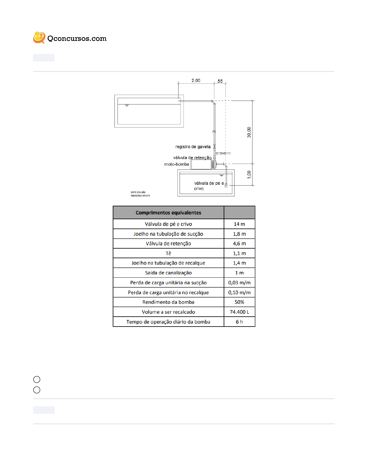 <p>02/02/2019 Questões de Provas - Questões de Concursos - Página 3 | Qconcursos.com</p><p>https://www.qconcursos.com/questoes-de-concursos/questoes?advanced_filter_toggle_input=on&discipline_ids%5B%5D=171&examining_board_ids%5B%5D=23… 1/12</p><p>www.qconcursos.com</p><p>Ano: 2018 Banca: Quadrix Órgão: CODHAB-DF</p><p>Considerando o conjunto elevatório de um prédio de 20 pavimentos, com 8 apartamentos de 2 quartos por andar e uma</p><p>taxa de ocupação de 4 pessoas por apartamento, julgue o item subsequente no que se refere a instalações prediais de água</p><p>fria e conjunto elevatório, conforme apresentado acima.</p><p>A vazão desse sistema de recalque é de 0,0034 m³/s.</p><p>Certo</p><p>Errado</p><p>Ano: 2018 Banca: Quadrix Órgão: CODHAB-DF</p><p>41 Q960440 > Engenharia Civil Hidráulica , Instalações , Instalações Hidrosanitárias</p><p>Prova: Quadrix - 2018 - CODHAB-DF - Analista - Engenharia</p><p>42 Q960439 > Engenharia Civil Instalações , Instalações Hidrosanitárias</p><p>Prova: Quadrix - 2018 - CODHAB-DF - Analista - Engenharia</p><p>https://www.qconcursos.com/</p><p>https://www.qconcursos.com/questoes-de-concursos/bancas/quadrix</p><p>https://www.qconcursos.com/questoes-de-concursos/institutos/codhab-df</p><p>https://www.qconcursos.com/questoes-de-concursos/bancas/quadrix</p><p>https://www.qconcursos.com/questoes-de-concursos/institutos/codhab-df</p><p>https://www.qconcursos.com/questoes-de-concursos/questoes/9cd0b58a-19</p><p>https://www.qconcursos.com/questoes-de-concursos/disciplinas/engenharia-civil-engenharia-civil</p><p>https://www.qconcursos.com/questoes-de-concursos/disciplinas/engenharia-civil-engenharia-civil/hidraulica</p><p>https://www.qconcursos.com/questoes-de-concursos/disciplinas/engenharia-civil-engenharia-civil/instalacoes</p><p>https://www.qconcursos.com/questoes-de-concursos/disciplinas/engenharia-civil-engenharia-civil/instalacoes-hidrosanitarias</p><p>https://www.qconcursos.com/questoes-de-concursos/provas/quadrix-2018-codhab-df-analista-engenharia</p><p>https://www.qconcursos.com/questoes-de-concursos/questoes/9ccceda5-19</p><p>https://www.qconcursos.com/questoes-de-concursos/disciplinas/engenharia-civil-engenharia-civil</p><p>https://www.qconcursos.com/questoes-de-concursos/disciplinas/engenharia-civil-engenharia-civil/instalacoes</p><p>https://www.qconcursos.com/questoes-de-concursos/disciplinas/engenharia-civil-engenharia-civil/instalacoes-hidrosanitarias</p><p>https://www.qconcursos.com/questoes-de-concursos/provas/quadrix-2018-codhab-df-analista-engenharia</p><p>02/02/2019 Questões de Provas - Questões de Concursos - Página 3 | Qconcursos.com</p><p>https://www.qconcursos.com/questoes-de-concursos/questoes?advanced_filter_toggle_input=on&discipline_ids%5B%5D=171&examining_board_ids%5B%5D=23… 2/12</p><p>Considerando o conjunto elevatório de um prédio de 20 pavimentos, com 8 apartamentos de 2 quartos por andar e uma</p><p>taxa de ocupação de 4 pessoas por apartamento, julgue o item subsequente no que se refere a instalações prediais de água</p><p>fria e conjunto elevatório, conforme apresentado acima.</p><p>O consumo total diário desse empreendimento é de 153.600 L.</p><p>Certo</p><p>Errado</p><p>Ano: 2018 Banca: Quadrix Órgão: CODHAB-DF</p><p>43 Q960438 > Engenharia Civil Hidráulica , Instalações , Instalações Hidrosanitárias</p><p>Prova: Quadrix - 2018 - CODHAB-DF - Analista - Engenharia</p><p>https://www.qconcursos.com/questoes-de-concursos/bancas/quadrix</p><p>https://www.qconcursos.com/questoes-de-concursos/institutos/codhab-df</p><p>https://www.qconcursos.com/questoes-de-concursos/questoes/9cc7b035-19</p><p>https://www.qconcursos.com/questoes-de-concursos/disciplinas/engenharia-civil-engenharia-civil</p><p>https://www.qconcursos.com/questoes-de-concursos/disciplinas/engenharia-civil-engenharia-civil/hidraulica</p><p>https://www.qconcursos.com/questoes-de-concursos/disciplinas/engenharia-civil-engenharia-civil/instalacoes</p><p>https://www.qconcursos.com/questoes-de-concursos/disciplinas/engenharia-civil-engenharia-civil/instalacoes-hidrosanitarias</p><p>https://www.qconcursos.com/questoes-de-concursos/provas/quadrix-2018-codhab-df-analista-engenharia</p><p>02/02/2019 Questões de Provas - Questões de Concursos - Página 3 | Qconcursos.com</p><p>https://www.qconcursos.com/questoes-de-concursos/questoes?advanced_filter_toggle_input=on&discipline_ids%5B%5D=171&examining_board_ids%5B%5D=23… 3/12</p><p>Considerando o conjunto elevatório de um prédio de 20 pavimentos, com 8 apartamentos de 2 quartos por andar e uma</p><p>taxa de ocupação de 4 pessoas por apartamento, julgue o item subsequente no que se refere a instalações prediais de água</p><p>fria e conjunto elevatório, conforme apresentado acima.</p><p>As capacidades dos reservatórios superior e inferior devem ser, respectivamente, de 61,44 m³ e 76,80 m³.</p><p>Certo</p><p>Errado</p><p>Ano: 2018 Banca: Quadrix Órgão: CODHAB-DF</p><p>44 Q960437 > Engenharia Civil Instalações , Instalações Hidrosanitárias</p><p>Prova: Quadrix - 2018 - CODHAB-DF - Analista - Engenharia</p><p>https://www.qconcursos.com/questoes-de-concursos/bancas/quadrix</p><p>https://www.qconcursos.com/questoes-de-concursos/institutos/codhab-df</p><p>https://www.qconcursos.com/questoes-de-concursos/questoes/9cc2ffea-19</p><p>https://www.qconcursos.com/questoes-de-concursos/disciplinas/engenharia-civil-engenharia-civil</p><p>https://www.qconcursos.com/questoes-de-concursos/disciplinas/engenharia-civil-engenharia-civil/instalacoes</p><p>https://www.qconcursos.com/questoes-de-concursos/disciplinas/engenharia-civil-engenharia-civil/instalacoes-hidrosanitarias</p><p>https://www.qconcursos.com/questoes-de-concursos/provas/quadrix-2018-codhab-df-analista-engenharia</p><p>02/02/2019 Questões de Provas - Questões de Concursos - Página 3 | Qconcursos.com</p><p>https://www.qconcursos.com/questoes-de-concursos/questoes?advanced_filter_toggle_input=on&discipline_ids%5B%5D=