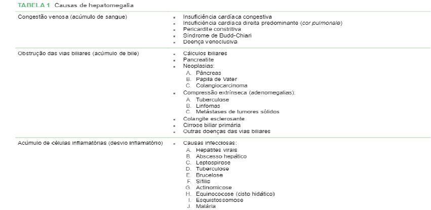 <p>HEPATOESPLENOMEGALIA</p><p>Hepatomegalia: Segundo os conhecimentos atuais, o fígado de um homem adulto com 70 kg possui cerca de 250 bilhões de hepatócitos que respondem por 80% do volume do órgão. Esses números ressaltam a importância do volume individual dos hepatócitos no tamanho do fígado como um todo. Os hepatócitos são as maiores células do fígado, com diâmetro de 20-30 micrômetros, e somam 65% do total das células do órgão. Em segundo lugar, estão as células de Kupffer, que respondem por 15% do total. Os restantes 20% são distribuídos entre as demais células: endoteliais, canais biliares, estreladas, fibroblastos, etc.</p><p>A hepatimetria normal detectada pelo exame clínico atinge 10-12 cm no homem e 8-11 cm na mulher. O peso médio do fígado chega a 1.800 g no sexo masculino e 1.400 g no sexo feminino.</p><p>A hepatomegalia pode ser classificada como:</p><p>Leve (hepatimetria de 13-16 cm).</p><p>Moderada (16-19 cm).</p><p>Maciça (acima de 19 cm).</p><p>ESPLENOMEGALIA</p><p>O baço exerce funções para o sistema circulatório de maneira equivalente aos linfonodos para o sistema linfático. Esse órgão representa o grande filtro do sangue para todos os elementos estranhos e células danificadas, além de exercer importantes funções na resposta imune. É o maior depósito do organismo humano para células fagocíticas-mononucleares (polpa vermelha) e de linfócitos (polpa branca). Normalmente, o baço pesa cerca de 80-200 g no homem adulto e 70-150 g na mulher, medindo 12 cm de comprimento, 7 cm de largura e 3 cm de espessura. Para exercer suas funções de filtro especializado do sangue, o baço possui uma anatomia perfeita: sua polpa vermelha é atravessada por numerosos sinusoides vasculares de paredes finas e endotélio descontínuo, separados pelos cordões esplênicos ou cordões de Billroth. Esses canais vasculares únicos terminam em fundo cego, diferente de qualquer outro canal vascular do organismo. A única forma de uma hemácea normal, de diâmetro entre 7 e 8 mícrons, escapar desses cordões e voltar à circulação geral, é se deformando e passando por fendas de 2-3 mícrons existentes na parede dos cordões. Hemácias velhas ou danificadas ficam nos cordões e são fagocitadas pelo sistema mononuclear-fagocitário. As células do sangue normais passam com facilidade entre os cordões, atravessando a seguir um labirinto de macrófagos de permeio. Dessa forma, estabelece-se um filtro físico e funcional, no qual o sangue flui lentamente. A polpa branca do baço tem importante ação na resposta imunológica, com participação de linfócitos T, B e macrófagos. Com a compreensão da anatomia e das funções do baço, é possível entender as causas de esplenomegalia com mais facilidade.</p><p>As esplenomegalias podem ser classificadas de acordo com seu tamanho em:</p><p>Leves (até 4 cm do rebordo costal esquerdo).</p><p>Moderadas (de 4-8 cm do rebordo costal esquerdo).</p><p>Maciças (além de 8 cm do rebordo costal esquerdo).</p><p>A história clínica pode fornecer bons indícios da possível causa de esplenomegalia. Por exemplo, o paciente com alcoolismo crônico ou hepatite crônica com ascite tem provavelmente esplenomegalia por cirrose. No paciente com queixas como febre, sudorese noturna, queda do estado geral e perda de peso, a esplenomegalia pode refletir atividade de doença sistêmica, como: aids, lúpus eritematoso sistêmico, artrite reumatoide, sarcoidose, malária, tuberculose, infecção viral (mononucleose, citomegalovírus etc.) ou doença hematológica (leucemia mieloide crônica, leucemia linfoide crônica, leucemia hairy cell, linfomas).</p><p>O hiperesplenismo é situação clínica em que há exagero das funções normais do baço, sendo necessários quatro critérios para definir o diagnóstico:</p><p>Citopenia de uma ou mais séries hematológicas.</p><p>Hiperplasia reativa da medula óssea.</p><p>Esplenomegalia.</p><p>Correção das alterações com esplenectomia.</p><p>Síndrome de Budd-Chiari</p><p>Hepatomegalia: O mecanismo de formação da hepatomegalia é semelhante ao mencionado anteriormente na insuficiência cardíaca, porém a dimensão do fenômeno é muito maior. A obstrução ao fluxo venoso de saída do fígado, que caracteriza a síndrome, pode ser secundária à trombose das veias supra-hepáticas ou à formação de uma membrana intraluminal na veia cava, acima da desembocadura das veias supra-hepáticas. Por qualquer dos dois mecanismos, ocorre rápido aumento da pressão venosa intra-hepática. Esse fato provoca grande aumento do órgão, acompanhado de dor local. A hepatomegalia tende a ser maciça, com o fígado atingindo seus maiores tamanhos (podendo ser palpado a mais de 10 cm do rebordo costal direito – RCD). É importante lembrar que nesses casos não há refluxo hepatojugular ao exame clínico A ascite formada por porejamento de linfa a partir da superfície hepática ocorre mais rapidamente, e de forma mais acentuada, do que na insuficiência cardíaca. Na síndrome de Budd-Chiari, as varizes esofagogástricas, a esplenomegalia e a circulação portal aparecem em cerca de 40-60% dos casos.</p><p>Várias doenças e condições estão associadas com a trombose das veias supra-hepáticas, como: policitemia vera, uso de contraceptivos orais, hemoglobinúria paroxística noturna, carcinoma hepatocelular, outras neoplasias (renal, adrenal, pulmonar, pancreática, gástrica), estados de hipercoagulabilidade, doença de Behçet, sarcoidose, doença inflamatória intestinal, entre outras. A realização de um método de imagem complementar pode mostrar hipertrofia do lobo caudado em um terço dos casos, apesar da atrofia dos demais lobos do fígado. Esse fenômeno se deve à drenagem venosa peculiar que pode existir no lobo caudado, com saída de seu fluxo venoso direto para a veia cava, sem passar pelas veias supra-hepáticas. Dessa maneira, o lobo caudado recebe fluxo preferencialmente 