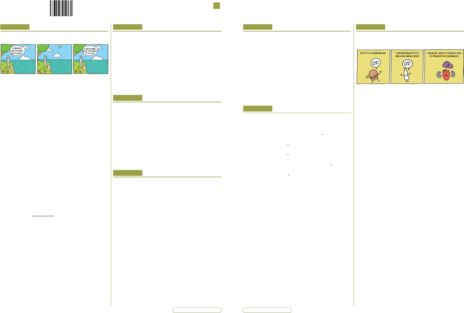 <p>3Confidencial até o momento da aplicação. Saresp2023 | 011-LC-CN 1.ª Série EM – Cad01</p><p>QUESTÃO 01</p><p>Examine a tirinha do cartunista Adão Iturrusgarai.</p><p>(Adão Iturrusgarai. La vie em rose, 2015)</p><p>A tirinha poderia servir de ilustração para o seguinte dita-</p><p>do popular:</p><p>(A) Não há bem que dure para sempre, nem mal que nun-</p><p>ca se acabe.</p><p>(B) Nem tanto ao mar, nem tanto à terra.</p><p>(C) Há sempre uma luz no fim do túnel.</p><p>(D) Não há nada tão ruim que não possa piorar.</p><p>(E) Não deixe para amanhã o que você pode fazer hoje.</p><p>Leia o soneto do poeta português Manuel Maria Barbosa</p><p>du Bocage, para responder às questões de números 02 a 06.</p><p>A loira Fílis na estação das flores,</p><p>Comigo passeou por este prado1</p><p>Mil vezes; por sinal, trazia ao lado</p><p>As Graças, os Prazeres e os Amores.</p><p>Quantos mimos2 então, quantos favores,</p><p>Que inocente afeição, que puro agrado</p><p>Me não viram gozar (oh, doce estado!),</p><p>Mordendo-se de inveja, os mais pastores!</p><p>Porém, segundo o feminil3 costume,</p><p>Já Fílis se esqueceu do amor mais terno,</p><p>E como Jônio se ri de meu queixume4.</p><p>Ah!, se nos corações fosses eterno,</p><p>Tormento abrasador, negro ciúme,</p><p>Serias tão cruel como os do Inferno!</p><p>(Manuel Maria Barbosa du Bocage. Poemas escolhidos, 1974)</p><p>1 prado: campo; campina.</p><p>2 mimos: carinhos.</p><p>3 feminil: feminino.</p><p>4 queixume: queixa.</p><p>QUESTÃO 02</p><p>No soneto, o eu lírico acusa Fílis de ser</p><p>(A) ingrata.</p><p>(B) gananciosa.</p><p>(C) invejosa.</p><p>(D) preguiçosa.</p><p>(E) ciumenta.</p><p>QUESTÃO 03</p><p>No soneto, o eu lírico dirige-se, mediante vocativo,</p><p>(A) a Jônio.</p><p>(B) ao ciúme.</p><p>(C) a Fílis.</p><p>(D) aos pastores.</p><p>(E) ao Inferno.</p><p>QUESTÃO 04</p><p>Uma característica da estética árcade presente nesse</p><p>s oneto é</p><p>(A) o tom socialmente engajado.</p><p>(B) a referência a seres mitológicos.</p><p>(C) a expressão exaltada da subjetividade.</p><p>(D) a descrição sombria da paisagem.</p><p>(E) a rigorosa contenção lírica.</p><p>01</p><p>CADERNO 1</p><p>4 Confidencial até o momento da aplicação.Saresp2023 | 011-LC-CN 1.ª Série EM – Cad01</p><p>QUESTÃO 07</p><p>Examine a tirinha do cartunista André Dahmer, publicada</p><p>em sua conta no Instagram em 26.05.2023.</p><p>Na construção do sentido de sua tirinha, o cartunista m obi-</p><p>liza fundamentalmente o seguinte recurso expressivo:</p><p>(A) pleonasmo: a repetição desnecessária de palavras ou</p><p>expressões na enunciação de uma ideia.</p><p>(B) hipérbole: a ênfase resultante do exagero na expres-</p><p>são ou comunicação de uma ideia.</p><p>(C) personificação: a atribuição de sentimentos humanos</p><p>e palavras a seres inanimados, a animais, a mortos ou</p><p>a ausentes.</p><p>(D) eufemismo: o emprego de palavra ou expressão no</p><p>lugar de outra palavra ou expressão considerada</p><p>d esagradável, grosseira.</p><p>(E) ambiguidade: a presença, num texto, de palavra ou</p><p>e xpressão que pode significar coisas diferentes, admi-</p><p>tir mais de uma leitura.</p><p>QUESTÃO 05</p><p>As duas primeiras estrofes do soneto exploram, sobretudo,</p><p>o seguinte tópico neoclássico:</p><p>(A) “aurea mediocritas” (“moderação dourada”).</p><p>(B) “fugere urbem” (“fugir da cidade”).</p><p>(C) “inutilia truncat” (“corta o inútil”).</p><p>(D) “locus amoenus” (“lugar aprazível”).</p><p>(E) “carpe diem” (“aproveita o momento”).</p><p>QUESTÃO 06</p><p>O sujeito da locução verbal sublinhada na segunda estrofe</p><p>do soneto é:</p><p>(A) “As Graças, os Prazeres e os Amores” (1a estrofe).</p><p>(B) “Quantos mimos” (2a estrofe).</p><p>(C) “quantos favores” (2a estrofe).</p><p>(D) “Que inocente afeição, que puro agrado” (2a estrofe).</p><p>(E) “os mais pastores” (2a estrofe).</p><p>5Confidencial até o momento da aplicação. Saresp2023 | 011-LC-CN 1.ª Série EM – Cad01</p><p>QUESTÃO 09</p><p>Estabelece uma relação de condição o termo sublinha-</p><p>do em:</p><p>(A) “sem poder levantar-se, afogou-se ali mesmo”.</p><p>(B) “se caísse novamente, iria levantar-se mais ágil”.</p><p>(C) “se caísse novamente, iria levantar-se mais ágil”.</p><p>(D) “como o sal se dissolveu, ele se levantou mais leve”.</p><p>(E) “ele se levantou mais leve e saiu todo contente”.</p><p>QUESTÃO 10</p><p>Releia a fábula “O burro que carregava sal”, do escritor gre-</p><p>go Esopo, atentando para o conectivo sublinhado.</p><p>Um burro carregado de sal atravessava um rio quan-</p><p>do escorregou e caiu na água. E, como o sal se dissolveu,</p><p>ele se levantou mais leve e saiu todo contente. Tempos</p><p>depois, estava com a carga de esponjas quando chegou</p><p>à beira de um rio e, supondo que, se caísse novamente,</p><p>iria levantar-se mais ágil, escorregou de propósito. Aconte-</p><p>ceu, porém, que as esponjas absorveram a água e ele, sem</p><p>p oder levantar-se, afogou-se ali mesmo.</p><p>(Esopo. Fábulas completas, 2013)</p><p>O conectivo sublinhado na fábula pode ser substituído,</p><p>sem prejuízo para o sentido do texto, por:</p><p>(A) contudo.</p><p>(B) conforme.</p><p>(C) portanto.</p><p>(D) pois.</p><p>(E) embora.</p><p>Leia a fábula “O burro que carregava sal”, do escritor grego</p><p>Esopo, para responder às questões de números 08 e 09.</p><p>Um burro carregado de sal atravessava um rio quan-</p><p>do escorregou e caiu na água. E, como o sal se dissolveu,</p><p>ele se levantou mais leve e saiu todo contente. Tempos</p><p>depois, estava com a carga de esponjas quando chegou</p><p>à beira de um rio e, supondo que, se caísse novamente,</p><p>iria levantar-se mais ágil, escorregou de propósito. Aconte-</p><p>ceu, porém, que as esponjas absorveram a água e ele, sem</