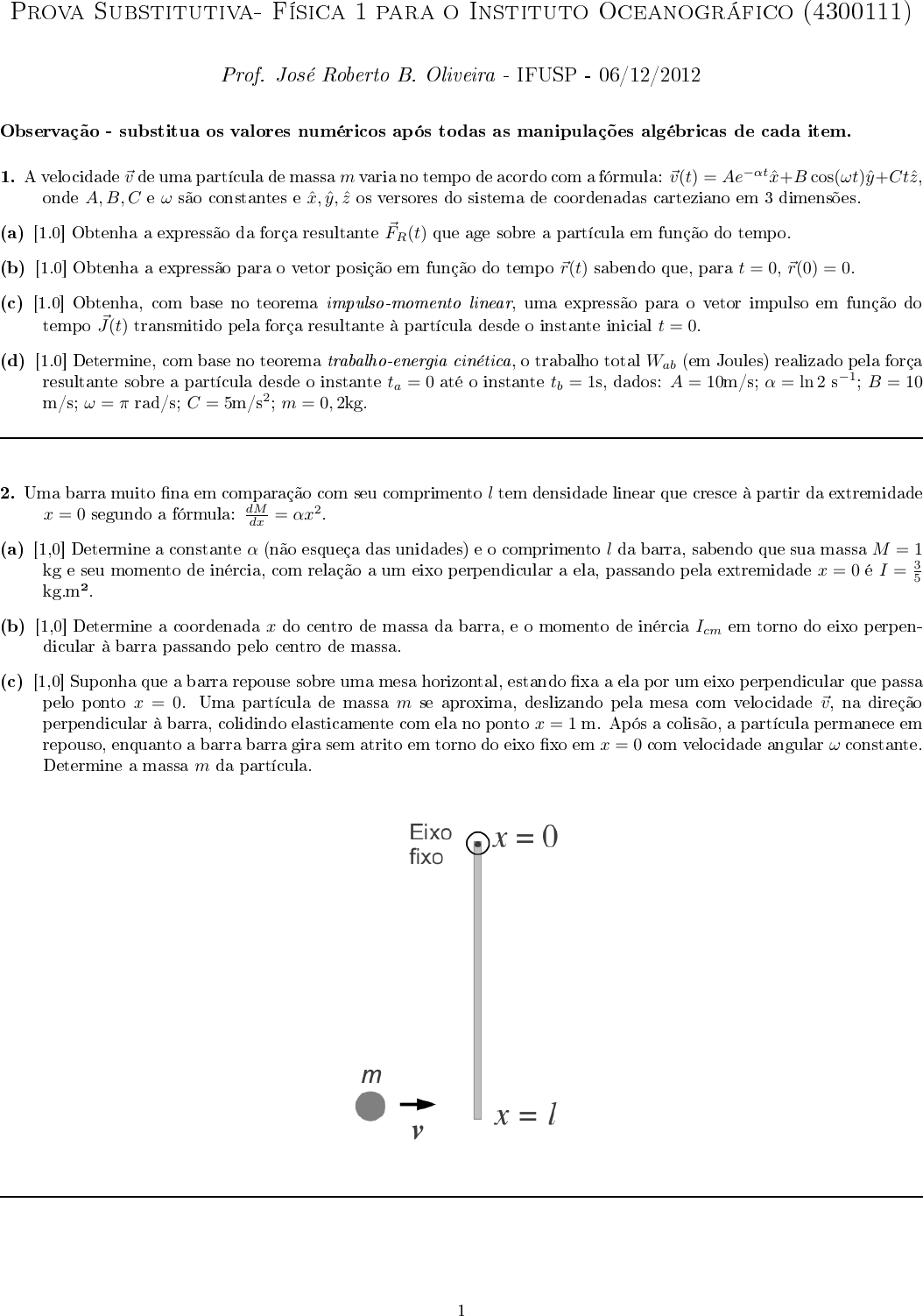 <p>Prova Substitutiva- Física 1 para o Instituto Oceanográfico (4300111)</p><p>Prof. José Roberto B. Oliveira - IFUSP - 06/12/2012</p><p>Observação - substitua os valores numéricos após todas as manipulações algébricas de cada item.</p><p>1. A velocidade ~v de uma partícula de massam varia no tempo de acordo com a fórmula: ~v(t) = Ae−αtx̂+B cos(ωt)ŷ+Ctẑ,</p><p>onde A,B,C e ω são constantes e x̂, ŷ, ẑ os versores do sistema de coordenadas carteziano em 3 dimensões.</p><p>(a) [1.0] Obtenha a expressão da força resultante ~FR(t) que age sobre a partícula em função do tempo.</p><p>(b) [1.0] Obtenha a expressão para o vetor posição em função do tempo ~r(t) sabendo que, para t = 0, ~r(0) = 0.</p><p>(c) [1.0] Obtenha, com base no teorema impulso-momento linear, uma expressão para o vetor impulso em função do</p><p>tempo ~J(t) transmitido pela força resultante à partícula desde o instante inicial t = 0.</p><p>(d) [1.0] Determine, com base no teorema trabalho-energia cinética, o trabalho total Wab (em Joules) realizado pela força</p><p>resultante sobre a partícula desde o instante ta = 0 até o instante tb = 1s, dados: A = 10m/s; α = ln 2 s−1; B = 10</p><p>m/s; ω = π rad/s; C = 5m/s2; m = 0, 2kg.</p><p>2. Uma barra muito �na em comparação com seu comprimento l tem densidade linear que cresce à partir da extremidade</p><p>x = 0 segundo a fórmula: dM</p><p>dx = αx2.</p><p>(a) [1,0] Determine a constante α (não esqueça das unidades) e o comprimento l da barra, sabendo que sua massa M = 1</p><p>kg e seu momento de inércia, com relação a um eixo perpendicular a ela, passando pela extremidade x = 0 é I = 3</p><p>5</p><p>kg.m².</p><p>(b) [1,0] Determine a coordenada x do centro de massa da barra, e o momento de inércia Icm em torno do eixo perpen-</p><p>dicular à barra passando pelo centro de massa.</p><p>(c) [1,0] Suponha que a barra repouse sobre uma mesa horizontal, estando �xa a ela por um eixo perpendicular que passa</p><p>pelo ponto x = 0. Uma partícula de massa m se aproxima, deslizando pela mesa com velocidade ~v, na direção</p><p>perpendicular à barra, colidindo elasticamente com ela no ponto x = 1 m. Após a colisão, a partícula permanece em</p><p>repouso, enquanto a barra barra gira sem atrito em torno do eixo �xo em x = 0 com velocidade angular ω constante.</p><p>Determine a massa m da partícula.</p><p>1</p><p>3. Uma grande bóia de massa m = 100 kg encontra-se presa ao fundo do mar por um cabo de aço. O sistema encontra-se</p><p>inteiramente submerso, e não há correntes marinhas na região da bóia. Utilize g ∼ 10m/s2 e π ∼ 3 para facilitar as</p><p>contas.</p><p>(a) [1,0] Estando a boia em repouso, com o cabo alinhado na direção vertical, a tensão no cabo vale 104 N. Determine a</p><p>força de empuxo FE e o volume da bóia V . Obs.: FE = ρV g, sendo ρ = 103 kg/m3 a densidade da água. (A massa</p><p>e volume do cabo são desprezíveis em comparação com as dimensões da bóia).</p><p>(b) [1,0] O torque resultante τR (em N.m) das forças que agem sobre a bóia com relação ao ponto �xo do cabo, no fundo</p><p>do mar, caso este seja deslocado com relação à direção vertical de um ângulo pequeno θ (em radianos), é dado pela</p><p>fórmula τR = 2× 105θ. Determine a distância entre o ponto �xo do cabo e o centro de massa da bóia.</p><p>(c) [1,0] Devido a ondas harmônicas na superfície da água de frequência angular ω, a bóia realiza um movimento oscilatório</p><p>forçado em um plano vertical com amplitude A. Dado que nestas condições, a equação diferencial para θ(t) é:</p><p>d2θ</p><p>dt2 + 0, 25dθdt + 4θ = 0, 1 cos(ωt). Determine a frequência de oscilação livre ω0 da bóia, e a amplitude A (em</p><p>radianos), do movimento oscilatório para ω = ω0 (isto é, na fequência de ressonância).</p><p>2</p>