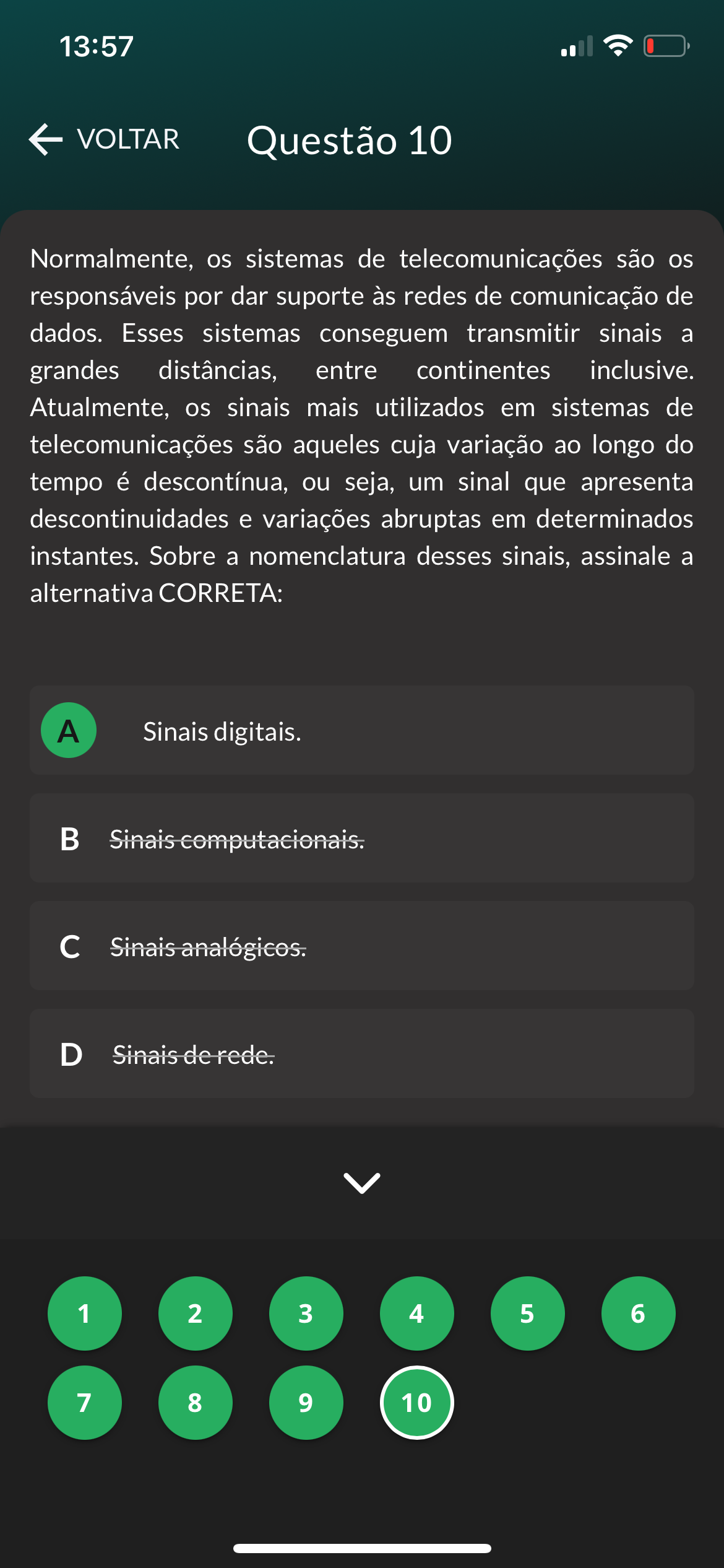 13:57 VOLTAR Questão 10 Normalmente, os sistemas de telecomunicações são os responsáveis por dar suporte às redes de comunicação de dados. Esses sistemas conseguem transmitir sinais a grandes distâncias, entre continentes inclusive. Atualmente, os sinais mais utilizados em sistemas de telecomunicações são aqueles cuja variação ao longo do tempo é descontínua, ou seja, um sinal que apresenta descontinuidades e variações abruptas em determinados instantes. Sobre a nomenclatura desses sinais, assinale a alternativa CORRETA: A Sinais digitais. B Sinaiscomputacionais C D Sinais-de-rede. 1 2 3 4 5 6 7 8 9 10