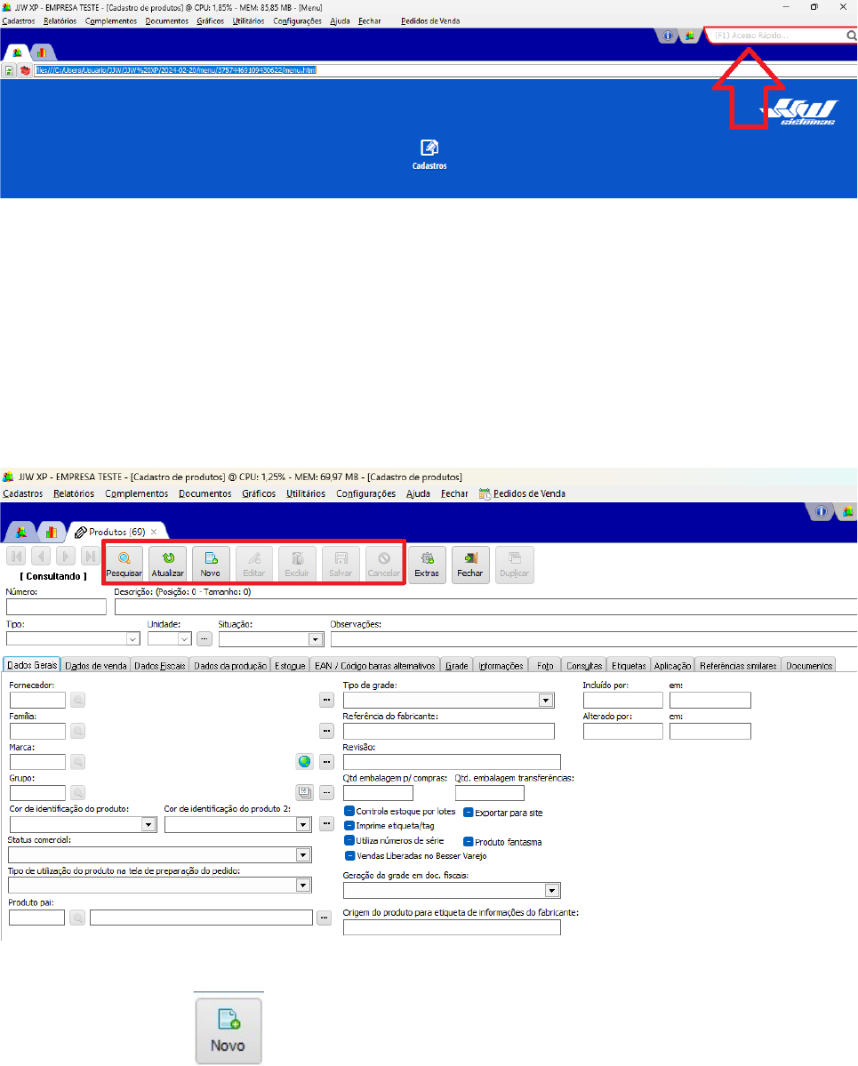 <p>CADASTRO DE PRODUTOS (TELA 69)</p><p>Será a tela onde serão cadastrados todos os produtos do sistema.</p><p>Para abrir a tela, basta digitar o número 69 no canto direito superior, no campo indicado como</p><p>“Acesso Rápido”, que seria um menu de navegação.</p><p>Dentro da tela existem os botões padrões para todas as telas de Cadastro:</p><p>• Pesquisar</p><p>• Atualizar</p><p>• Novo</p><p>• Editar</p><p>• Excluir</p><p>• Salvar</p><p>• Cancelar</p><p>Para cadastrar um produto basta clicar no botão “Novo”</p><p>Clicando nesse botão, o sistema entrará em modo de Inserção</p><p>O campo Número, caso o sistema esteja configurado com a numeração automática (parâmetros),</p><p>será preenchido automaticamente. Caso contrário, precisará informar o número do produto.</p><p>Os outros campos para preenchimento obrigatório estarão destacados na cor de fundo azul,</p><p>exemplo:</p><p>Esses são os campos básicos para o preenchimento nessa primeira parte.</p><p>Posteriormente ao preenchimento desses campos, precisará ser informada a NCM (Classificação</p><p>Fiscal) do produto</p><p>Produtos (69) > Dados Fiscais > Dados Fiscais</p><p>Caso a Classificação não esteja cadastrada no sistema, precisará cadastra-la.</p><p>Pra isso, será necessário acessar a tela de cadastro da Classificação Fiscal (Tela 80), dar um novo na</p><p>tela e ir preenchendo as informações:</p><p>Importante também sempre cadastrar a empresa na Classificação Fiscal:</p><p>Depois, basta clicar no botão “Salvar”:</p><p>Com o cadastro da Classificação Fiscal existindo, basta se direcionar novamente para a tela de</p><p>Produtos (69) > Dados Fiscais > Dados Fiscais, e preencher o campo destinado a Classificação</p><p>Fiscal, conforme o exemplo:</p><p>E então basta Salvar o registro da tela 69.</p><p>CASO PRECISE INFORMAR UM VALOR DE VENDA PARA O PRODUTO:</p><p>Precisará ir até a aba Produtos</p><p>(69) > Dados de venda > “Alterar</p><p>preço da lista” com a tela NÃO</p><p>ESTANDO EM MODO DE</p><p>INSERÇÃO.</p><p>Será aberta a seguinte tela:</p><p>E então basta clicar no botão “Novo” na aba Produto, informar a lista de preço e o valor de venda e</p><p>depois salvar.</p><p>PARA A LIBERAÇÃO DE PRODUTOS PARA O BESSER (RETAGUARDA OU PDV).</p><p>Para liberar produtos para o Besser, os produtos devem ter:</p><p>• Vínculo com alguma lista de preços.</p><p>• Valor de venda na lista de preço.</p><p>• Flag “Venda liberada Besser” marcada.</p>