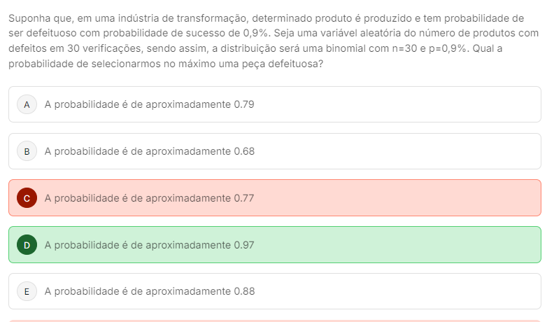 Suponha que, em uma indústria de transformação, determinado produto é produzido e tem probabilidade de ser defeituoso com probabilidade de sucesso de Seja uma variável aleatória do número de produtos com defeitos em 30 verificações, sendo assim, a distribuição será uma binomial com n=30 e p=0,9%. Qual a probabilidade de selecionarmos no máximo uma peça defeituosa? A A probabilidade é de aproximadamente 0.79 B A probabilidade é de aproximadamente 0.68 C A probabilidade é de aproximadamente 0.77 D A probabilidade é de aproximadamente E A probabilidade é de aproximadamente 0.88