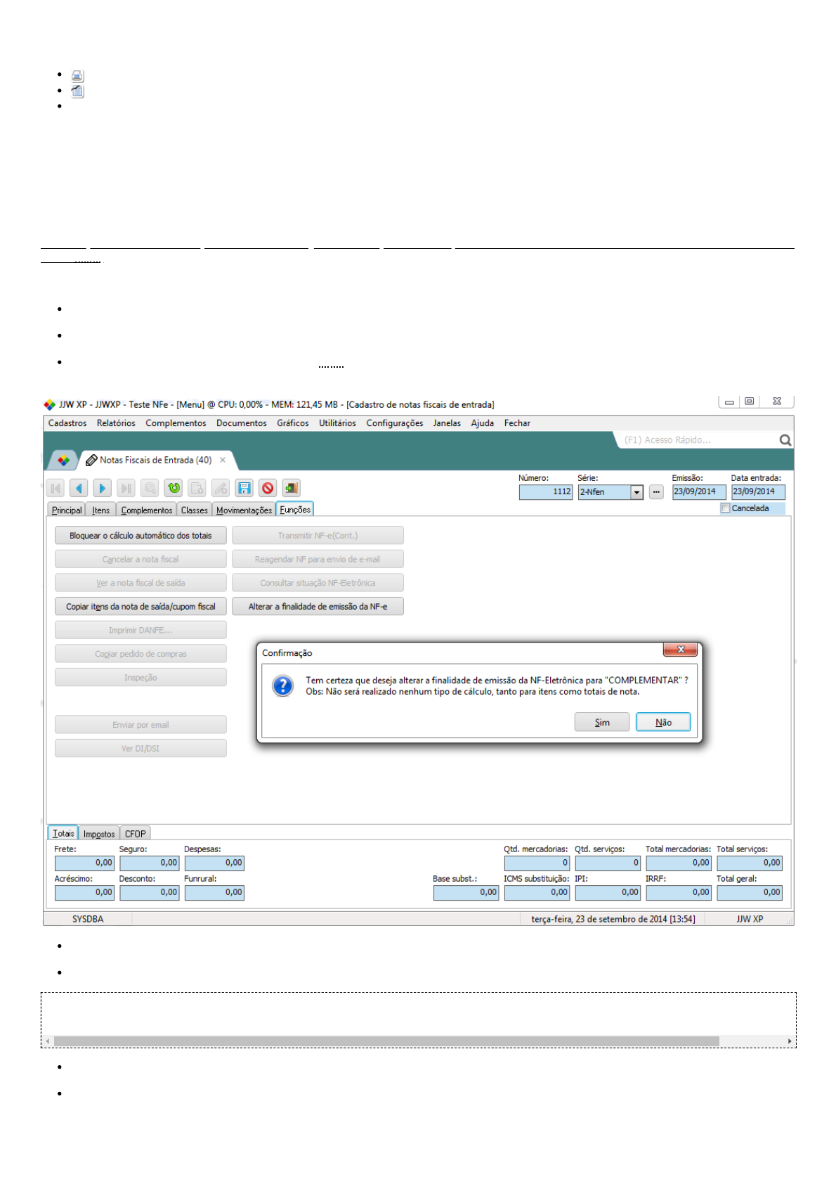 <p>24/08/2022 09:20 Nota Complementar - JJW.Documentação</p><p>https://www.jjw.com.br/doc/doku.php?id=doc:jjwxp:faq:nota_complementar 1/2</p><p>Versão para impressão</p><p>Exportar para OpenOffice</p><p>Nota Complementar</p><p>Passo a passo para cadastro de nota complementar de entrada e saída.</p><p>Nota Complementar de Entrada</p><p>Ps.: Só é possível fazer nota complementar de um nota já transmitida para a receita (a nota a ser referenciada deve estar com o retorno 100 - Autorizado o</p><p>uso da NF-e)</p><p>Cadastros – Faturamento – Nota Fiscal de Entrada</p><p>Novo – Digitar cliente (mesmo cliente da nota de entrada que foi feita sem impostos ou impostos incorretos);</p><p>Inserir Natureza de operação – Verificar os parâmetros da Natureza de Operação, não pode estar setado o parâmetro “Atualiza estoque”.</p><p>Ir na Aba Funções – Alterar a finalidade de emissão da NF-e. Abrirá uma janela de confirmação, clique em “Sim”.</p><p>Inserir o número da nota que faltou informar os impostos;</p><p>Aba Itens – Inserir o produto (geralmente o nome do produto é complemento de imposto);</p><p>OBS: Se não tiver o produto,entrar em Cadastros – Estoques – Produtos e cadastrar um produto cujo código vai ser "CPLIMP" e descrição "Complemento</p><p>Unidade "PC", tipo "Outros", na aba Dados Fiscais, coloque alguma classificação fiscal no produto e salve.</p><p>Digitar a quantidade e salvar (No caso de complementar o valor do produto deve ser zerado);</p><p>Editar o produto e, na linha dele, digitar o percentual do imposto, o valor de base e o imposto. Salvar o item;</p><p>https://www.jjw.com.br/doc/doku.php?id=doc:jjwxp:faq:nota_complementar&rev=0&mddo=print</p><p>https://www.jjw.com.br/doc/doku.php?id=doc:jjwxp:faq:nota_complementar&rev=0&do=export_odt</p><p>https://www.jjw.com.br/doc/lib/exe/detail.php?id=doc%3Ajjwxp%3Afaq%3Anota_complementar&media=doc:jjwxp:faq:nfe.png</p><p>24/08/2022 09:20 Nota Complementar - JJW.Documentação</p><p>https://www.jjw.com.br/doc/doku.php?id=doc:jjwxp:faq:nota_complementar 2/2</p><p>OBS: Se a nota for complementar de ICMS, o Total Geral fica 0,00. Se ela for complementar de IPI ou ICMS Substituição, colocar o valor do Imposto</p><p>Existem casos que podem possuir os três tipos de impostos na mesma nota complementar.</p><p>Na aba Totais da nota, digitar o valor de base e o imposto. Salvar e transmitir.</p><p>Nota Complementar de Saída</p><p>Cadastros – Faturamento – Nota Fiscal de Saída</p><p>Novo – Digitar cliente (mesmo cliente da nota de saída que foi feita sem impostos ou impostos incorretos);</p><p>Inserir a Natureza de operação. Verifique os parâmetros da Natureza de Operação, não deve estar ativado o parâmetro “Atualiza estoque”.</p><p>OBS: Se a nota fiscal complementar for sobre uma nota de devolução, a CFOP utilizada não pode estar com o lógico de devolução marcado, pois a finalidade da</p><p>nota precisa ser complementar.</p><p>Ir na Aba Funções – Alterar a finalidade de emissão da NF-e. Abrirá uma janela de confirmação, clique em “Sim”.</p><p>Inserir o número da nota que faltou informar os impostos;</p><p>Na Aba Itens – Inserir o produto (geralmente o nome do produto é complemento de imposto)</p><p>Caso não exista, cadastrá-lo em: Cadastros – Estoques – Produtos e cadastrar um produto cujo código vai ser “CPLIMP” e descrição “Complemento de</p><p>Imposto”.</p><p>Unidade “PC”, tipo “Outros”, na aba Dados Fiscais inserir a classificação fiscal de acordo com a nota original e salve o cadastro.</p><p>Digitar a quantidade e salvar (No caso de complementar o valor do produto deve ficar zerado);</p><p>Editar o produto e, na linha dele, digitar o percentual do imposto, o valor de base e o imposto. Salvar o item;</p><p>*OBS: Se a nota for complementar de ICMS, o Total Geral fica 0,00. Se ela for complementar de IPI ou ICMS Substituição, colocar o valor do Imposto no total</p><p>Geral da nota.**</p><p>Existem casos que podem possuir os três tipos de impostos na mesma nota complementar.</p><p>Na aba Totais da nota, digitar o valor de base e o imposto. Salvar e transmitir.</p><p>doc/jjwxp/faq/nota_complementar.txt · Última modificação: 2021/02/16 15:11 (edição externa)</p><p>https://www.jjw.com.br/doc/doku.php?id=doc:jjwxp:faq:nota_complementar</p>