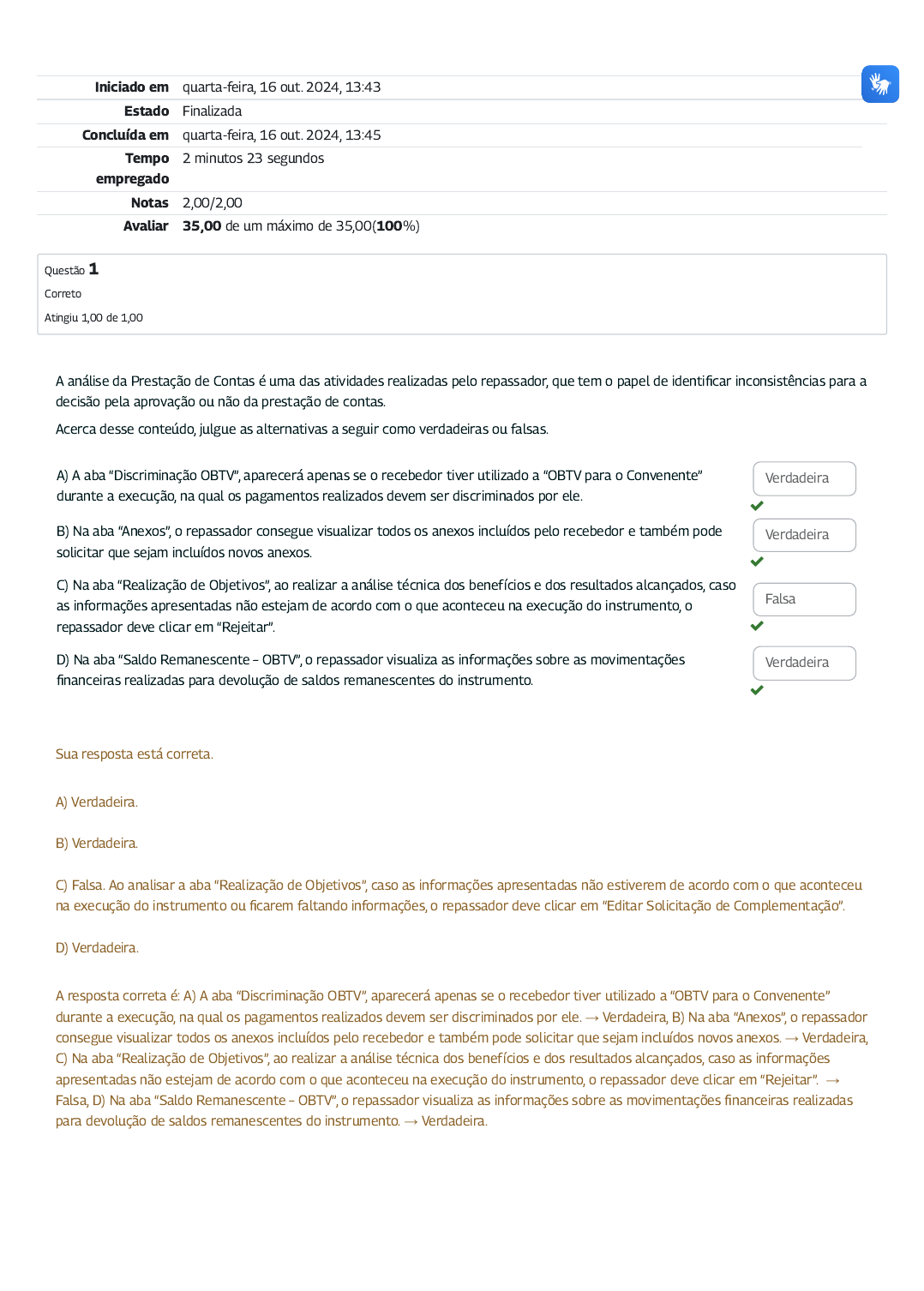 <p>Iniciado em quarta-feira, 16 out. 2024, 13:43</p><p>Estado Finalizada</p><p>Concluída em quarta-feira, 16 out. 2024, 13:45</p><p>Tempo</p><p>empregado</p><p>2 minutos 23 segundos</p><p>Notas 2,00/2,00</p><p>Avaliar 35,00 de um máximo de 35,00(100%)</p><p>Questão 1</p><p>Correto</p><p>Atingiu 1,00 de 1,00</p><p>A análise da Prestação de Contas é uma das atividades realizadas pelo repassador, que tem o papel de identi�car inconsistências para a</p><p>decisão pela aprovação ou não da prestação de contas.</p><p>Acerca desse conteúdo, julgue as alternativas a seguir como verdadeiras ou falsas.</p><p>A) A aba “Discriminação OBTV”, aparecerá apenas se o recebedor tiver utilizado a “OBTV para o Convenente”</p><p>durante a execução, na qual os pagamentos realizados devem ser discriminados por ele.</p><p></p><p>B) Na aba “Anexos”, o repassador consegue visualizar todos os anexos incluídos pelo recebedor e também pode</p><p>solicitar que sejam incluídos novos anexos.</p><p></p><p>C) Na aba “Realização de Objetivos”, ao realizar a análise técnica dos benefícios e dos resultados alcançados, caso</p><p>as informações apresentadas não estejam de acordo com o que aconteceu na execução do instrumento, o</p><p>repassador deve clicar em “Rejeitar”. </p><p>D) Na aba “Saldo Remanescente – OBTV”, o repassador visualiza as informações sobre as movimentações</p><p>�nanceiras realizadas para devolução de saldos remanescentes do instrumento.</p><p></p><p>Verdadeira</p><p>Verdadeira</p><p>Falsa</p><p>Verdadeira</p><p>Sua resposta está correta.</p><p>A) Verdadeira.</p><p>B) Verdadeira.</p><p>C) Falsa. Ao analisar a aba “Realização de Objetivos”, caso as informações apresentadas não estiverem de acordo com o que aconteceu</p><p>na execução do instrumento ou �carem faltando informações, o repassador deve clicar em “Editar Solicitação de Complementação”.</p><p>D) Verdadeira.</p><p>A resposta correta é: A) A aba “Discriminação OBTV”, aparecerá apenas se o recebedor tiver utilizado a “OBTV para o Convenente”</p><p>durante a execução, na qual os pagamentos realizados devem ser discriminados por ele. → Verdadeira, B) Na aba “Anexos”, o repassador</p><p>consegue visualizar todos os anexos incluídos pelo recebedor e também pode solicitar que sejam incluídos novos anexos. → Verdadeira,</p><p>C) Na aba “Realização de Objetivos”, ao realizar a análise técnica dos benefícios e dos resultados alcançados, caso as informações</p><p>apresentadas não estejam de acordo com o que aconteceu na execução do instrumento, o repassador deve clicar em “Rejeitar”. →</p><p>Falsa, D) Na aba “Saldo Remanescente – OBTV”, o repassador visualiza as informações sobre as movimentações �nanceiras realizadas</p><p>para devolução de saldos remanescentes do instrumento. → Verdadeira.</p><p>Questão 2</p><p>Correto</p><p>Atingiu 1,00 de 1,00</p><p>A emissão de pareceres é uma ação importante no processo de Prestação de Contas, pois permite ao repassador comunicar o</p><p>resultado de sua análise.</p><p>Acerca desse assunto, julgue as alternativas a seguir como verdadeiras ou falsas.</p><p>A) A análise da prestação de contas consiste basicamente no acompanhamento sistemático da conformidade</p><p>�nanceira, considerando o início e o �m da vigência dos instrumentos.</p><p></p><p>B) Ao �nalizar a análise de todas as abas, no momento de iniciar a emissão os pareceres na aba “Pareceres”, o</p><p>repassador tem três opções: aprovar a prestação de contas; indicar a necessidade de diligência para que o</p><p>recebedor preste alguma informação ou complementação; ou, ainda, o repassador pode indicar o parecer como</p><p>desfavorável.</p><p></p><p>C) Após indicar se o parecer é favorável, desfavorável ou se houve diligência, o resultado dos pareceres está</p><p>�nalizado e a prestação de contas concluída.</p><p></p><p>D) Ao �nalizar a inclusão dos eventos o repassador deve enviar o parecer para o SIAFI.</p><p></p><p>Falsa</p><p>Verdadeira</p><p>Falsa</p><p>Verdadeira</p><p>Sua resposta está correta.</p><p>A) Falsa. Como foi ensinado neste módulo, a análise da prestação de contas é realizada a partir de dois elementos: o técnico e o</p><p>�nanceiro. A análise técnica consiste no procedimento de análise dos elementos que comprovam, sob os aspectos técnicos, a execução</p><p>integral do objeto e o alcance dos resultados previstos nos instrumentos. Já a análise �nanceira é o procedimento de acompanhamento</p><p>sistemático da conformidade �nanceira, considerando o início e o �m da vigência dos instrumentos.</p><p>B) Verdadeira.</p><p>C) Falsa. O repassador precisa incluir os eventos para dizer o resultado �nal da prestação de contas. Após a �nalização dessa etapa a</p><p>prestação de contas estará concluída.</p><p>D) Verdadeira.</p><p>A resposta correta é: A) A análise da prestação de contas consiste basicamente no acompanhamento sistemático da conformidade</p><p>�nanceira, considerando o início e o �m da vigência dos instrumentos. → Falsa, B) Ao �nalizar a análise de todas as abas, no momento</p><p>de iniciar a emissão os pareceres na aba “Pareceres”, o repassador tem três opções: aprovar a prestação de contas; indicar a</p><p>necessidade de diligência para que o recebedor preste alguma informação ou complementação; ou, ainda, o repassador pode indicar o</p><p>parecer como desfavorável. → Verdadeira, C) Após indicar se o parecer é favorável, desfavorável ou se houve diligência, o resultado dos</p><p>pareceres está �nalizado e a prestação de contas concluída. → Falsa, D) Ao �nalizar a inclusão dos eventos o repassador deve enviar o</p><p>parecer para o SIAFI. → Verdadeira.</p>
