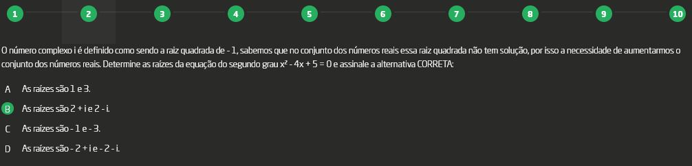 2 3 4 5 6 7 g 10 0 número complexo i é definido como sendo a raiz quadrada de 1, sabemos que no conjunto dos números reais essa raiz quadrada não tem solução, por isso a necessidade de aumentarmos O conjunto dos números Determine as raízes da equação do segundo grau assinale a alternativa CORRETA: A As raízes são 1 e 3. As raízes são 2 +ie2-i As raízes são 1 e D As raízes são - 2