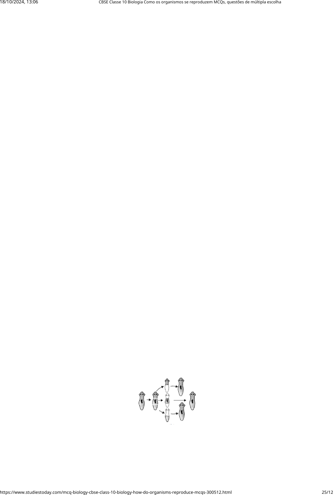 <p>18/10/2024, 13:06 CBSE Classe 10 Biologia Como os organismos se reproduzem MCQs, questões de múltipla escolha</p><p>(a) (i) e (iv)</p><p>(b) Apenas (iv)</p><p>(c) (ii), (iii) e (iv)</p><p>(d) (i), (ii) e (iii)</p><p>Resposta: A</p><p>Pergunta. O plasma seminal humano, a parte fluida do sêmen, é produzido por contribuições de qual das partes dadas? A.</p><p>Glândula prostática</p><p>B. Glândula bulbouretral</p><p>C. Uretra</p><p>D. Vesículas seminais</p><p>(a) A e D somente</p><p>(b) A somente</p><p>(c) A, B, C e D</p><p>(d) A, B e D somente</p><p>Resposta: D</p><p>Pergunta. A reprodução sexuada é o modo de reprodução que (i)</p><p>depende do envolvimento de dois gametas diferentes.</p><p>(ii) incorpora um processo de combinação de DNA de dois gametas.</p><p>(iii) oferece maiores chances de variações em comparação à reprodução assexuada.</p><p>(iv) dá origem a descendentes geneticamente idênticos.</p><p>(a) (i) e (ii)</p><p>(b) (i), (iii) e (iv)</p><p>(c) (i), (ii) e (iv)</p><p>(d) (i), (ii) e (iii)</p><p>Resposta: D</p><p>Pergunta. Se não houver formação de óvulo durante o desenvolvimento do óvulo, então, após a fertilização, qual das seguintes estruturas não se desenvolverá?</p><p>(a) Embrião</p><p>(b) Endosperma</p><p>(c) Semente</p><p>(d) Fruta</p><p>Resposta: A</p><p>Pergunta. Exemplos de plantas que se reproduzem vegetativamente são</p><p>(a) tomate, quiabo, cebola, couve-flor</p><p>(b) batata, gengibre, cebola, cana-de-açúcar</p><p>(c) couve-flor, cebola, batata, tomate</p><p>(d) quiabo, cebola, gengibre, cana-de-açúcar.</p><p>Resposta: B</p><p>Pergunta. Selecione a correspondência</p><p>correta. Organismo Modo de reprodução</p><p>(a) Bryophyllum – Broto foliar</p><p>(b) Hydra – Fissão binária</p><p>(c) Paramécio – Fissão múltipla</p><p>(d) Spirogyra – Propagação vegetativa</p><p>Resposta: A</p><p>Pergunta. Selecione a afirmação incorreta sobre sementes.</p><p>(a) As sementes têm uma casca resistente que as protege do ambiente externo.</p><p>(b) Os cotilédones armazenam alimentos.</p><p>(c) A plúmula se desenvolve no sistema radicular.</p><p>(d) As sementes contêm a futura planta chamada</p><p>embrião. Resposta: C</p><p>Pergunta. ––––––– é a porção na qual o enxerto é feito e fornece as raízes.</p><p>(a) Estoque</p><p>(b) Descendente</p><p>(c) Broto</p><p>(d) Nenhuma destas</p><p>Resposta: A</p><p>Pergunta. O tipo de reprodução mostrado na figura é</p><p>(a) brotando</p><p>(b) agamogênese</p><p>(c) regeneração</p><p>(d) fissão.</p><p>Resposta: C</p><p>Pergunta. Quantos gametas masculinos são encontrados no tubo polínico:</p><p>(a) um</p><p>(b) dois</p><p>https://www.studiestoday.com/mcq-biology-cbse-class-10-biology-how-do-organisms-reproduce-mcqs-300512.html 25/12</p><p>Rectangle</p><p>Rectangle</p><p>18/10/2024, 13:06 CBSE Classe 10 Biologia Como os organismos se reproduzem MCQs, questões de múltipla escolha</p><p>(c) três</p><p>(d) quatro</p><p>Resposta: B</p><p>Pergunta. Quais das seguintes afirmações são falsas para a reprodução sexuada em plantas com flores?</p><p>(a) Requer dois tipos de gâmetas</p><p>(b) a fertilização é obrigatória</p><p>(c) sempre resulta na formação do zigoto</p><p>(d) os descendentes são clones</p><p>Resposta: D</p><p>Pergunta. Qual das seguintes plantas tem flores unissexuais?</p><p>(a) Hibisco</p><p>(b) Mostarda</p><p>(c) Mamão</p><p>(d) Amor-perfeito</p><p>Resposta: C</p><p>Pergunta. Qual dos seguintes é um contraceptivo?</p><p>(a) Cobre</p><p>(b) Preservativo</p><p>(c) Diafragma</p><p>(d) Todos estes</p><p>Resposta: D</p><p>Pergunta. Em uma flor, as partes que produzem gametas masculinos e femininos (células germinativas) são</p><p>(a) Estame e antera</p><p>(b) Filamento e estigma</p><p>(c) Antera e ovário</p><p>(d) Estame e estilo</p><p>Resposta: C</p><p>Pergunta. A seguir está (são) a reprodução assexuada</p><p>(a) Brotamento</p><p>(b) Formação de esporos</p><p>(c) Regeneração</p><p>(d) Todas as anteriores</p><p>Resposta: D</p><p>Pergunta. A reprodução é importante porque permite:</p><p>(a) Perda de vigor</p><p>(b) Esterilidade no organismo</p><p>(c) Perpetuação de espéciescorreto</p><p>(d) Defeitos na prole</p><p>Resposta: C</p><p>Pergunta. (A) Os testículos estão presentes fora da cavidade abdominal do corpo.</p><p>(R) A formação do esperma requer uma temperatura mais baixa do que a temperatura normal do corpo.</p><p>(a) Tanto A quanto R são verdadeiras e R é a explicação correta de A.</p><p>(b) Tanto A quanto R são verdadeiras e R não é a explicação correta de A.</p><p>(c) A é verdadeira, mas R é falsa.</p><p>(d) A é falsa, mas R é verdadeira.</p><p>Resposta: A</p><p>Pergunta. Uma característica da reprodução que é comum à Ameba, Spirogyra e Levedura é que</p><p>(a) eles se reproduzem assexuadamente</p><p>(b) são todos unicelulares</p><p>(c) reproduzem-se apenas sexualmente</p><p>(d) são todos multicelulares</p><p>Resposta: A</p><p>Pergunta. A forma artificial de propagação vegetativa é:</p><p>(a) Camadas</p><p>(b) Enxertia</p><p>(c) Corte</p><p>(d) Todos estes</p><p>Resposta: D</p><p>Pergunta. Leia as frases a seguir com atenção e escolha a incorreta:</p><p>(а) Muitos organismos unicelulares, como protozoários e bactérias, simplesmente se dividem em duas metades idênticas durante a divisão celular, levando à criação de novos organismos, chamada fissão.</p><p>(b) Na fissão múltipla, o organismo parental se divide para formar muitos novos organismos ao mesmo tempo</p><p>(c) Na fissão binária, o organismo parental se divide para formar três novos organismos.</p><p>(d) Paramécio e ameba se dividindo ou reproduzindo pelo método de fissão binária.</p><p>Resposta: C</p><p>Pergunta. Os testículos estão presentes fora do corpo no homem porque:</p><p>(a) há menos espaço na cavidade abdominal</p><p>(b) a temperatura é menor fora do corpo</p><p>(c) a cópula é fácil</p>
