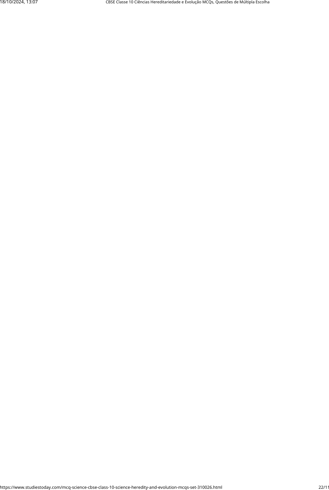 <p>18/10/2024, 13:07 CBSE Classe 10 Ciências Hereditariedade e Evolução MCQs, Questões de Múltipla Escolha</p><p>Pergunta. A Terra surgiu provavelmente .......... milhões de anos atrás.</p><p>Resposta:4600</p><p>Pergunta. O processo pelo qual novas espécies se desenvolvem a partir das existentes é chamado</p><p>de .......... Resposta:especiação</p><p>Pergunta. ........... chamado pai da genética.</p><p>Resposta:Mendel</p><p>Pergunta. Mendel é conhecido como o pai de ..........</p><p>Resposta:genética</p><p>Pergunta. Os órgãos análogos têm funções semelhantes, mas têm ......... estruturas.</p><p>Resposta:Diferente</p><p>Pergunta. O brócolis foi desenvolvido a partir de .......... repolho por meio de seleção artificial. Resposta:</p><p>Selvagem</p><p>Pergunta: O F2a razão fenotípica de um cruzamento monohíbrido estudado por Mendel é</p><p>a) 1:1</p><p>b) 2:1</p><p>c) 3:1</p><p>e) 4:1</p><p>Resposta: C</p><p>Pergunta: Se T é para altura e t para nanismo, qual deve ser o genótipo de uma planta de ervilha alta de acordo com o mendelismo?</p><p>a) TT</p><p>b) Tt</p><p>c) Ou TT ou Tt</p><p>e) não</p><p>Resposta: C</p><p>Pergunta: Uma planta de ervilha com sementes amarelas e redondas tem o genótipo YyRr. Os gametas produzidos devem ser</p><p>a) Aa, Rr</p><p>b) ANO, ANO, ANO, ANO</p><p>c) ANO, ano</p><p>e) Sim, sim, R, r</p><p>Resposta: B</p><p>Pergunta: Se em humanos um espermatozóide (22+Y) fertiliza um óvulo (22+X), o sexo do feto será</p><p>a) Masculino</p><p>b) Feminino</p><p>c) Masculino ou Feminino</p><p>d) ambos</p><p>Resposta: A</p><p>Pergunta: O membro anterior do sapo, lagarto, pássaro e homem tem alguma relação evolutiva. Estas são</p><p>a) Relação de mãos</p><p>b) Elos perdidos</p><p>c) Órgãos análogos</p><p>d) Órgãos homólogos</p><p>Resposta: D</p><p>Pergunta: O número de autossomos em uma célula do corpo humano é</p><p>a) 44</p><p>b) 46</p><p>c) 22</p><p>e) 23</p><p>Resposta: A</p><p>Pergunta: A teoria da Seleção Natural foi proposta por</p><p>a) Lamarck</p><p>b) Darwin</p><p>c) Mendel</p><p>d) Haldane</p><p>Resposta: B</p><p>Pergunta: Como a vida pode ter se originado na Terra foi demonstrado experimentalmente por</p><p>a) Urey e Miller</p><p>b) Oparin e Haldane</p><p>c) Watson e Crick</p><p>d) Nenhuma das anteriores</p><p>Resposta: A</p><p>Pergunta: A remoção cirúrgica das caudas dos ratos ao longo de várias gerações não produz ratos sem caudas.</p><p>Isso prova que</p><p>a) Cortar a cauda não causa mudança genética. Então não é herdado.</p><p>b) Os caracteres adquiridos ao longo da vida não são herdados.</p><p>c) Nem a nem b estão corretas</p><p>d) Tanto a como b estão corretas</p><p>Resposta: D</p><p>https://www.studiestoday.com/mcq-science-cbse-class-10-science-heredity-and-evolution-mcqs-set-310026.html 22/11</p><p>Rectangle</p><p>Rectangle</p><p>18/10/2024, 13:07 CBSE Classe 10 Ciências Hereditariedade e Evolução MCQs, Questões de Múltipla Escolha</p><p>Pergunta: Uma mudança aleatória na frequência de alelos em qualquer população ao longo de várias gerações devido a erros nos gametas é chamada</p><p>a) Fluxo gênico</p><p>b) Deriva genética</p><p>c) Erro genético</p><p>d) Colisão genética</p><p>Resposta: B</p><p>Pergunta: O número de pares de cromossomos sexuais em uma célula diplóide humana é</p><p>a) um</p><p>b) dois</p><p>c) três</p><p>d) quatro</p><p>Resposta B</p><p>Pergunta: O processo de emasculação em plantas envolve</p><p>a) remoção das anteras das flores bem antes da maturidade do gineceu das flores.</p><p>b) remoção do gineceu das flores bem antes da maturidade das anteras das flores.</p><p>c) remoção das anteras e do gineceu das flores simultaneamente antes da maturidade das flores.</p><p>d) nenhuma das duas.</p><p>Resposta A</p><p>Pergunta: Uma planta de ervilha com sementes redondas e amarelas é cruzada com uma planta de ervilha com sementes enrugadas e verdes. A proporção de 4 tipos diferentes de</p><p>características observadas seria</p><p>a) 9 : 4 : 2 : 1</p><p>b) 7 : 6 : 2 : 1</p><p>c) 9 : 3 : 3 : 1</p><p>e) 4 : 4 : 4 : 4</p><p>Resposta C</p><p>Pergunta: A diversidade é bastante alta em organismos que produzem por meio de</p><p>a) Reprodução assexuada</p><p>b) Brotamento</p><p>c) Fissão binária</p><p>d) Reprodução sexuada</p><p>Resposta D</p><p>Pergunta: Um zigoto que possui o cromossomo Y herdado do pai e o cromossomo X herdado da mãe se desenvolverá em</p><p>a) menina</p><p>b) menino</p><p>c) eunuco</p><p>d) menino ou menina</p><p>Resposta B</p><p>Pergunta: Cite o órgão que é vestigial no homem, mas funcional nas aves</p><p>a) apêndice vermiforme</p><p>b) ceco</p><p>c) membrana nictitante</p><p>d) terceiro molar</p><p>Resposta B</p><p>Pergunta: Os gases usados no aparelho de descarga de faísca de Miller e Urey eram</p><p>a) NH3, Nova Hampshire4e O2</p><p>b) NH3, CO2e O2</p><p>c) NH3, CO2e CH4</p><p>e) NH3, O2e CH4</p><p>Resposta D</p><p>Pergunta: A deriva genética opera principalmente em</p><p>a) populações menores</p><p>b) populações maiores</p><p>c) populações mendelianas</p><p>d) populações insulares</p><p>Resposta A</p><p>Pergunta: A masculinidade de uma criança é determinada por</p><p>a) o cromossomo X no zigoto</p><p>b) o cromossomo Y no zigoto</p><p>c) o citoplasma da célula germinativa que determina o sexo</p><p>d) o sexo é determinado pelo acaso</p><p>Resposta B</p><p>Pergunta: Se o fóssil de um organismo for encontrado nas camadas mais profundas da Terra, então podemos prever que</p><p>a) a extinção do organismo ocorreu recentemente</p><p>b) a extinção do organismo ocorreu há milhares de anos</p><p>c) a posição dos fósseis nas camadas da Terra não está relacionada com o seu tempo de extinção</p><p>d) o tempo de extinção não pode ser determinado.</p><p>Resposta B</p><p>https://www.studiestoday.com/mcq-science-cbse-class-10-science-heredity-and-evolution-mcqs-set-310026.html 22/12</p><p>Rectangle</p>