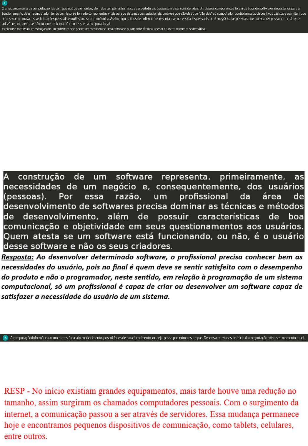 <p>1 - O amadurecimento da computação fez com que outros elementos, além dos componentes físicos e</p><p>arquiteturais, passassem a ser considerados. Um desses componentes foram os tipos de softwares</p><p>necessários para o funcionamento de um computador, tendo com isso, se tornado componentes vitais para os</p><p>sistemas computacionais, uma vez que são eles que "dão vida" ao computador, controlam seus dispositivos</p><p>básicos e permitem que as pessoas promovam suas interações pessoais e profissionais com a máquina.</p><p>Assim, alguns tipos de software representam as necessidades pessoais, ou de negócio, das pessoas, que por</p><p>sua vez passaram a criá-los e utilizá-los, tornando-se o "componente humano" de um sistema</p><p>computacional. Explique o motivo da construção de um software não poder ser considerado uma atividade</p><p>puramente técnica, apesar de extremamente sistemática.</p><p>Resposta esperada</p><p>A construção de um software representa, primeiramente, as necessidades de um negócio e,</p><p>consequentemente, dos usuários (pessoas). Por essa razão, um profissional da área de desenvolvimento de</p><p>softwares precisa dominar a s técnicas e métodos de desenvolvimento, além de possuir características de boa</p><p>comunicação e objetividade em seus questionamentos aos usuários. Quem atesta se um software está</p><p>funcionando, ou não, é o usuário desse software e não os seus criadores.</p><p>2 - A computação/informática, como outras áreas do conhecimento, possui fases de amadurecimento, ou</p><p>seja, passa por inúmeras etapas.</p><p>Descreva as etapas do início da computação até o seu momento atual.</p>