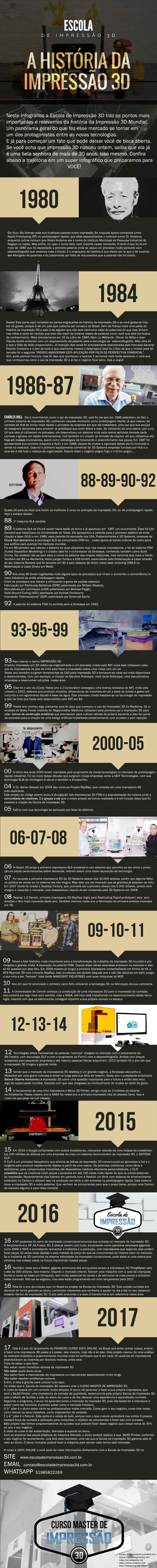 <p>1980</p><p>2015</p><p>2016</p><p>2017</p><p>1984</p><p>1986-87</p><p>88-89-90-92</p><p>93-95-99</p><p>2000-05</p><p>06-07-08</p><p>09-10-11</p><p>12-13-14</p><p>scott-crump</p><p>Neste Infográfico a Escola de Impressão 3D traz os pontos mais</p><p>importantes e relevantes da história da Impressão 3D Mundial.</p><p>Um panorama geral do que fez esse mercado se tornar em</p><p>um dos protagonistas entre as novas tecnologias.</p><p>E já para começar um fato que pode deixar você de boca aberta.</p><p>Se você acha que impressão 3D nasceu ontem, saiba que ela já</p><p>é uma bela senhora de mais de 30 anos. Isso mesmo. Coné uma bela senhora de mais de 30 anos. Isso mesmo. Confira</p><p>abaixo a trajetória em um super infográfico que preparamos para</p><p>VOCÊ!</p><p>Fontes: https://redshift.autodesk.com</p><p>https://3dprintingindustry.com</p><p>https://en.wikipedia.org</p><p>https://www.sculpteo.com</p><p>http://reprap.org/wiki/About</p><p>Ele ficou tão famoso pela sua frustrada patente sobre impressão 3d, naquela época conhecida como</p><p>Rapid Prototyping (RP) ou prototipagem rápida, que sites especializados o colocam como Dr. Kodama,</p><p>enquanto outros indicam que Hideo Kodama era o nome do Instituto Municipal de Pesquisa Industrial de</p><p>Nagoya no Japão. Mas enfim, no caso o nome dele, nem importa nesse momento. O certo é que foi lá em</p><p>maio de 1980 que foi depositada a primeira patente onde se usava um processo muito parecido com</p><p>estereolitografia que veremos mais a frente. E o engraçado da história é que dizem por ai que o tal inventor</p><p>era era Advogado de patentes e foi justamente por falta de documentos que a patente não foi aceita.</p><p>Rssss! Esta parte aqui completa as partes engraçadas da história da impressão 3D e se você gosta de fute-</p><p>bol irá gostar, porque é de um país que costuma ser carrasco do Brasil. Vem da França mais uma parte da</p><p>história da impressão 3D e esta é de alguém que não teve nenhuma visão do potencial do que eles tinham</p><p>nas mãos e pode ter certeza que eles não eram da mesma classe de pessoas como você que está em busca</p><p>de conhecimento. Mais precisamente em 16 de julho de 1984, Alain Le Méhauté , Olivier de Witte e Jean</p><p>Claude André entraram com um arquivamento de patente para a tecnologia de estereolitografia .Mas olha só</p><p>o o que a falta de visão proporcionou...A invenção dos caras foi simplesmente abandonada pela francesa General</p><p>Electric Company e o pior de tudo e que realmente mostra o despreparo total foi o fato de que o motivo para tal</p><p>decisão foi o seguinte "IREMOS ABANDONAR ESTA APLICAÇÃO POR FALTA DE PERSPECTIVA COMERCIAL".</p><p>Sim, pode parecer loucura, mas foi isso que aconteceu e apenas 3 semanas mais tarde apareceu o cara que</p><p>que conhecemos como o pai da Impressão 3D e ai fez o negócio ficar sério. Veja a seguir</p><p>Charles Hull - Ele é reconhecido como o pai da impressão 3D, pois foi ele que em 1986 patenteou de fato o</p><p>primeiro sistema de impressão 3D, conhecido naquele momento como prototipagem rápida, já que nasceu da</p><p>vontade de Hull de tornar mais rápido o processo da empresa em que ele trabalhava, uma vez que sua equipe</p><p>de designers demorava para produzir os protótipos que eram feitos a mão. Se utilizando de uma resina com cura</p><p>UV que eles já utilizavam no processo, ele desenvolveu um sistema onde esta resina aplicada camada após</p><p>camada e gerava um objeto tridimensional. Hull também é o criador do formato de arquivo .stl que utilizamos até</p><p>hoje em nossas ihoje em nossas impressoras, assim como estratégias de fatiamento e preenchimento das peças. Em 1987 foi</p><p>apresentada sua primeira máquina a SLA1 e em 1988, depois de muitos e rigorosos testes ela foi colocada a</p><p>venda no mercado. Esse foi o primeiro equipamento comercial da 3D Systems empresa fundada por Hull e a</p><p>qual ele é até hoje o cabeça da organização. Depois disso o negócio pegou fogo e o bicho pegou...</p><p>93 Aqui nasceu o termo IMPRESSÃO 3D</p><p>O termo impressão em 3D referiu-se originalmente a um processo criado pelo MIT onde eles utilizavam cabe-</p><p>ças de impressoras de jato de tinta para fazer a impressão sobre uma mesa com um pó.</p><p>Neste ano também surgiram ferramentas de CAD para impressão 3D e tornaram-se cada vez mais disponíveis</p><p>e desenvolvidas, com, por exemplo, a criação do Sanders Prototype, mais tarde Soliscape, uma das primeiras</p><p>empresas a desenvolver soluções nessa área.</p><p>95 95 Este foi o ano da ZCorp: Neste ano a Z Corporation conseguiu uma licença exclusiva do MIT, onde eles</p><p>criaram o Z402, sistema que produzia modelos utilizando-se de materiais em pó a base de amido e gesso em</p><p>conjunto a um aglutinante líquido à base de água. Este processo criado baseava-se na tecnologia de impressão</p><p>a jato de tinta que havia sido desenvolvido pelo MIT em 93.</p><p>99 Neste ano ocorreu algo marcante, pois foi aqui que começou o uso da impressão 3D na Medicina. Os ci-</p><p>entistas do Wake Forest Institute for Regenerative Medicine utilizaram pela primeira vez a impressão 3D para</p><p>criar blocos de construção sintéticos criar blocos de construção sintéticos que precisavam para cultivar células do próprio paciente e isso fez parte</p><p>do processo para a criação de uma bexiga artificial implantada posteriormente com sucesso e sem rejeição.</p><p>00 O início dos anos 2000 foram marcados pelo surgimento de novas tecnologias no mercado de prototipagem</p><p>rápida industrial. Foi no inicio dessa década que surgiram novas empresas como a MCP Technologies com sua</p><p>tecnologia SLM de moldagem à vácuo e também a EnvisionTec.</p><p>04 O Dr. Adrian Bowyer em 2004 deu inicio ao Projeto RepRap, que consiste em uma impressora 3D</p><p>auto replicante.</p><p>Este projeto de código aberto levou 