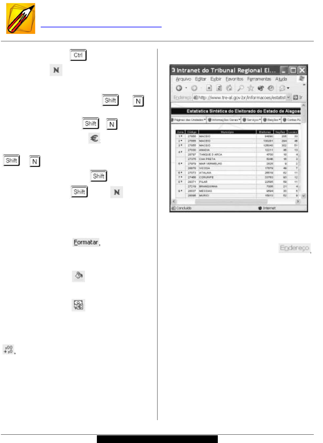 <p>221</p><p>www.1001questoesdeconcurso.com.br</p><p>Quer entrar para lista preferencial para receber mais 1001 QUESTÕES DE CONCURSO</p><p>de outras bancas ou matérias? Sim?! Então, cadastre o seu email no meu site</p><p>www.1001questoesdeconcurso.com.br para receber mais questões e outras surpresas.</p><p>pressionada a tecla , clicando então a</p><p>célula A5; clicar .</p><p>c) Aplicar um duplo clique na célula B1 e outro</p><p>duplo clique na célula C1; pressionar</p><p>simultaneamente as teclas e ;</p><p>selecionar as células A4 e A5; pressionar</p><p>simultaneamente as teclas e .</p><p>d) Clicar a célula B1; clicar ; clicar a célula</p><p>C1; pressionar simultaneamente as células</p><p>e ; clicar a célula A4; pressionar e</p><p>manter pressionada a tecla e clicar A5,</p><p>liberando então a tecla ; clicar .</p><p>955 - CESPE - 2007 - TSE - ANALISTA</p><p>JUDICIÁRIO</p><p>Com relação à figura e ao Excel 2002, assinale</p><p>a opção correta.</p><p>a) Ao se clicar o menu , é exibida uma</p><p>lista de opções, sendo que algumas permitem</p><p>alterar a largura da coluna ou a altura da linha em</p><p>que está contida a célula selecionada.</p><p>b) Ao se clicar o botão , todas as células da</p><p>planilha assumirão a cor atualmente associada a</p><p>esse botão.</p><p>c) Ao se clicar o botão , é aberta a caixa de</p><p>diálogo Assistente de gráfico, que auxilia o</p><p>usuário na elaboração de gráficos com os dados</p><p>da planilha.</p><p>d) Ao se clicar a célula B2 e se clicar o botão</p><p>, o conteúdo da célula B2 será exibido como</p><p>63,00%.</p><p>956 - CESPE - 2004 - TRE-AL - ANALISTA</p><p>JUDICIÁRIO</p><p>Com base na janela do Internet Explorer 6</p><p>(IE6) ilustrada na figura acima, que mostra</p><p>uma página web cujo URL (uniform resource</p><p>locator) está indicado no campo ,</p><p>julgue os itens seguintes, considerando que</p><p>uma seção de uso do IE6 está sendo</p><p>realizada. Dependendo da forma como a</p><p>tabela contida na página web ilustrada tenha</p><p>sido inserida nessa página, é possível enviar</p><p>as informações dessa tabela a uma planilha</p><p>Excel com o emprego de recursos do IE6</p><p>disponibilizados ao se clicar o botão direito</p><p>do mouse sobre a referida tabela.</p><p>( ) Certo ( ) Errado</p><p>222</p><p>www.1001questoesdeconcurso.com.br</p><p>Quer entrar para lista preferencial para receber mais 1001 QUESTÕES DE CONCURSO</p><p>de outras bancas ou matérias? Sim?! Então, cadastre o seu email no meu site</p><p>www.1001questoesdeconcurso.com.br para receber mais questões e outras surpresas.</p><p>957 - CESPE - 2004 - TRE-AL - TÉCNICO</p><p>JUDICIÁRIO</p><p>A figura acima mostra uma janela do Excel</p><p>2000 com dados relativos aos eleitores de um</p><p>município nos anos de 2000 e 2002.</p><p>Considerando essa figura, julgue os itens</p><p>subseqüentes.</p><p>Na situação em que se encontra a planilha</p><p>mostrada, ao se digitar a expressão =C2/B2 e, a</p><p>seguir, teclar , na célula A5 aparecerá um</p><p>número superior a 1 e inferior a 2, caso essa</p><p>célula esteja formatada para número.</p><p>( ) Certo ( ) Errado</p><p>958 - CESPE - 2004 - TRE-AL - TÉCNICO</p><p>JUDICIÁRIO</p><p>Com base nas informações contidas na</p><p>planilha mostrada, é correto afirmar que todas</p><p>as células da coluna A estão formatadas para</p><p>texto e, caso se insira um número real na</p><p>célula A5, ocorrerá erro.</p><p>( ) Certo ( ) Errado</p><p>MICROSOFT POWER POINT</p><p>959 - CESPE - 2012 - TRE-RJ - CARGOS DE</p><p>NÍVEL SUPERIOR</p><p>Acerca de edição de textos, planilhas e</p><p>apresentações nos ambientes Microsoft</p><p>Office 2010 e BrOffice 3.0, julgue os itens a</p><p>seguir.</p><p>Por intermédio do Microsoft PowerPoint 2010, é</p><p>possível salvar uma apresentação como vídeo,</p><p>sendo possível, ainda, visualizar a apresentação</p><p>mesmo por meio de computador sem o</p><p>PowerPoint instalado em seu sistema, e</p><p>configurar a resolução e o tamanho desses</p><p>arquivos de vídeo tanto para dispositivos móveis</p><p>como para monitores de computadores de alta</p><p>resolução HD.</p><p>( ) Certo ( ) Errado</p><p>960 - CESPE - 2012 - CÂMARA DOS</p><p>DEPUTADOS - ANALISTA</p><p>A respeito de aplicativos do Microsoft Office</p><p>2010 e do BrOffice, julgue os itens seguintes.</p><p>Com o objetivo de criar trilhas sonoras em</p><p>eslaides, o PowerPoint permite a inclusão de</p><p>áudio em apresentações e, a partir da versão</p><p>2010, podem ser utilizados arquivos de áudio no</p><p>formato MP3. Porém, essas trilhas sonoras,</p><p>quando aplicadas, deverão abranger toda a</p><p>apresentação, não sendo permitido restringir a</p><p>aplicação a apenas uma parte dela.</p><p>( ) Certo ( ) Errado</p><p>961 - CESPE - 2008 - TST - TÉCNICO</p><p>JUDICIÁRIO</p><p>Com relação ao PowerPoint 2007, julgue o</p><p>item a seguir.</p><p>O PowerPoint 2007 disponibiliza botões que, ao</p><p>serem clicados, permitem aumentar ou diminuir o</p><p>tamanho da fonte de um texto que esteja</p><p>selecionado em um slide.</p><p>( ) Certo ( ) Errado</p>
