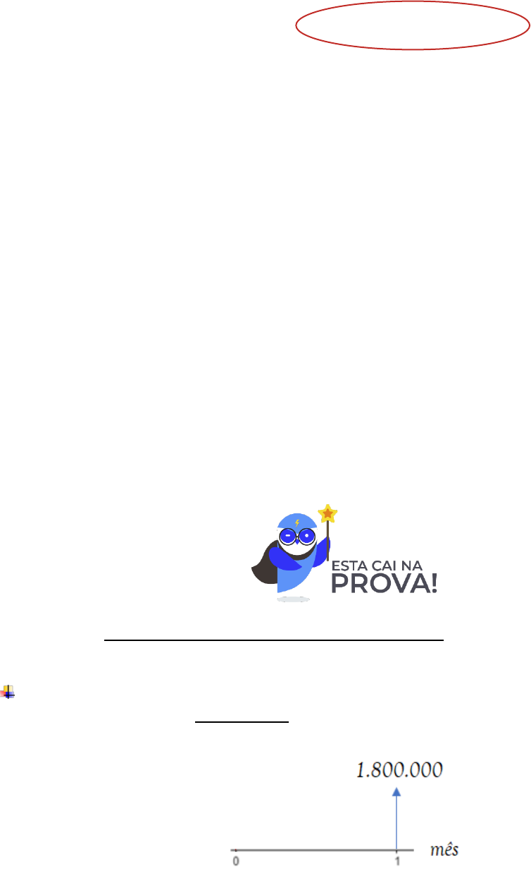 <p>51</p><p>(1 + 𝑖) = 𝑦</p><p>(1 + 𝑖) = 1,2</p><p>𝑖 = 1,2 − 1 → 𝒊 = 𝟎, 𝟐 𝒐𝒖 𝟐𝟎% 𝒂𝒐 𝒂𝒏𝒐</p><p>Gabarito: Alternativa D</p><p>29. (CESGRANRIO / TRANSPETRO - 2018) Uma empresa avalia a compra de uma máquina junto a</p><p>dois fornecedores, os quais, apesar de venderem com o mesmo preço inicial de 2 milhões de</p><p>reais, ofereceram planos de pagamento diferentes. O fornecedor A ofereceu um desconto de</p><p>10% e prazo para pagamento único exatamente após 1 mês da data da compra; o fornecedor B</p><p>ofereceu um desconto de 12% para pagamento à vista.</p><p>Considerando-se uma taxa de 5% ao mês para o custo do dinheiro que será usado nessa operação, a</p><p>economia, em milhares de reais, que pode ser feita se o comprador escolher a decisão mais econômica,</p><p>baseada na equivalência de capitais, pertence ao intervalo</p><p>a) [45; 46[</p><p>b) [46; 47[</p><p>c) [47; 48[</p><p>d) [48; 49[</p><p>e) [49; 50]</p><p>Comentários:</p><p>Vamos calcular o Valor Presente das duas opções de pagamento e constatar qual é mais vantajosa e,</p><p>posteriormente, analisar a economia feita pelo comprador.</p><p>O fornecedor A ofereceu um desconto de 10% e prazo para pagamento único exatamente após 1</p><p>mês da data da compra. Graficamente teremos:</p><p>52</p><p>Observe que é oferecido desconto de 10% em cima do valor de R$ 2.000.000,00. Logo, o valor a ser pago 1</p><p>mês após é igual a:</p><p>𝑉𝐹 = 2.000.000 −</p><p>10</p><p>100</p><p>× 2.000.000</p><p>𝑉𝐹 = 2.000.000 − 200.000 → 𝑽𝑭 = 𝟏. 𝟖𝟎𝟎. 𝟎𝟎𝟎</p><p>Iremos agora, calcular o Valor Presente (𝑡 = 0) para uma taxa de 5% ao mês:</p><p>𝑉𝑃 =</p><p>𝑉𝐹</p><p>(1 + 𝑖)𝑡</p><p>𝑉𝑃𝐴 =</p><p>1.800.000</p><p>(1 + 0,05)1</p><p>𝑉𝑃𝐴 =</p><p>1.800.000</p><p>1,05</p><p>→ 𝑽𝑷𝑨 = 𝟏. 𝟕𝟏𝟒. 𝟐𝟖𝟓</p><p>O fornecedor B ofereceu um desconto de 12% para pagamento à vista.</p><p>Ou seja, o Valor oferecido pelo fornecedor B já é o Valor Presente de B. Já está no tempo 𝑡 = 0.</p><p>𝑉𝑃𝐵 = 2.000.000 −</p><p>12</p><p>100</p><p>× 2.000.000</p><p>𝑉𝑃𝐵 = 2.000.000 − 240.000 → 𝑽𝑷𝑩 = 𝟏. 𝟕𝟔𝟎. 𝟎𝟎𝟎</p><p>Logo, a opção do fornecedor A é mais vantajosa e a economia será de:</p><p>𝑒 = 1.760.000 − 1.714.285 → 𝒆 = 𝟒𝟓. 𝟕𝟏𝟓</p><p>Esta economia está no intervalo, em milhares, [45; 46[.</p><p>Gabarito: Alternativa A</p><p>30. (CESGRANRIO / TRANSPETRO - 2018) Um analista avalia a compra de um equipamento, cujo</p><p>preço inicial, em dois fornecedores diferentes, foi orçado em 10 milhões de reais. O fornecedor</p><p>I ofereceu um desconto de 12% e prazo para pagamento único exatamente após 1 mês. O</p><p>fornecedor II ofereceu um desconto de 13% para pagamento à vista.</p><p>Considerando-se uma taxa de 3% ao mês para o custo do dinheiro que será usado na operação, a economia,</p><p>em milhares de reais, que pode ser feita se o comprador escolher a decisão mais econômica, baseada na</p><p>equivalência de capitais, pertence ao intervalo:</p>