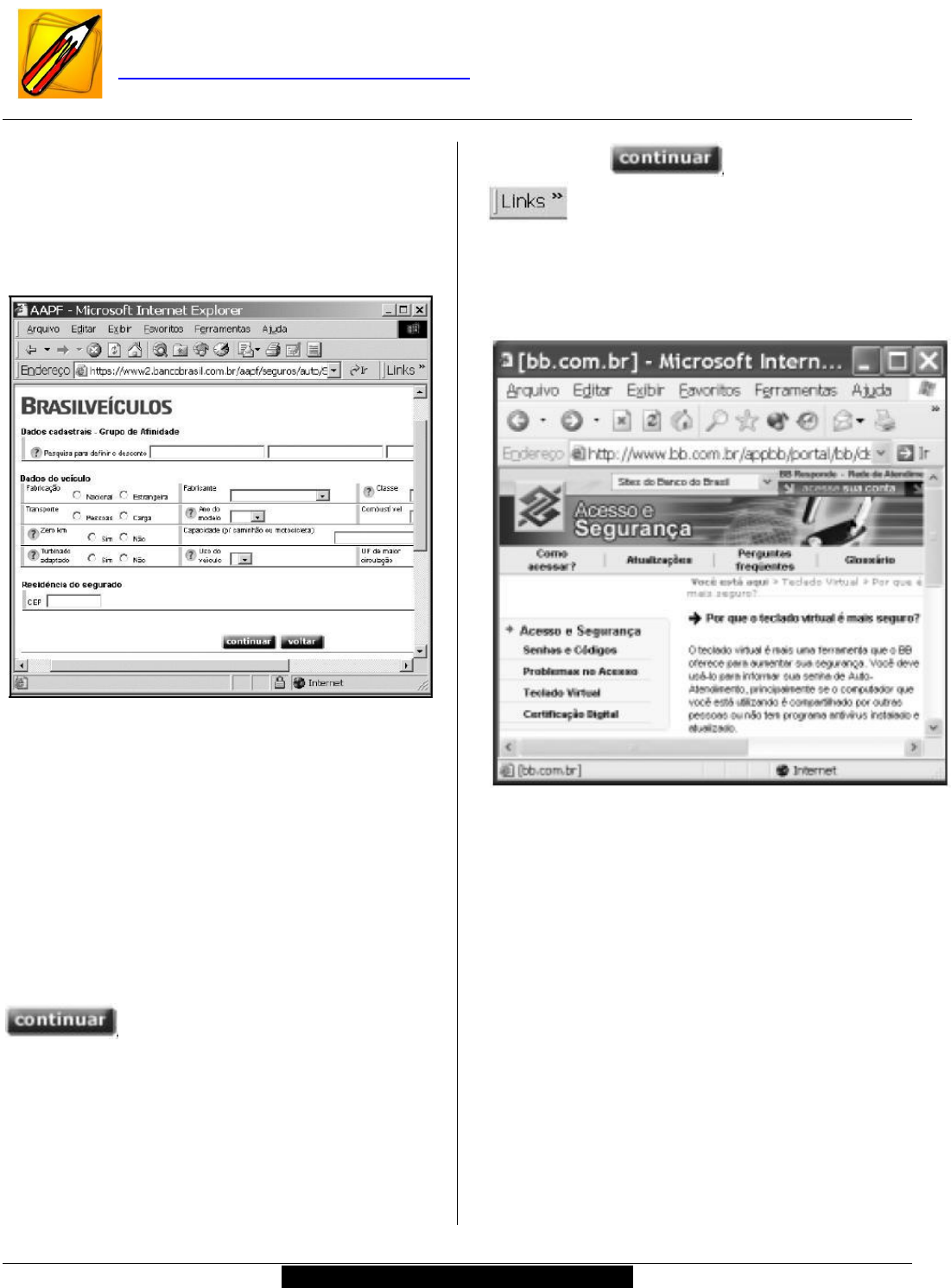 <p>111</p><p>www.1001questoesdeconcurso.com.br</p><p>Quer entrar para lista preferencial para receber mais 1001 QUESTÕES DE CONCURSO</p><p>de outras bancas ou matérias? Sim?! Então, cadastre o seu email no meu site</p><p>www.1001questoesdeconcurso.com.br para receber mais questões e outras surpresas.</p><p>enquanto sistemas firewall são utilizados para</p><p>diminuir riscos de ataques a bancos de dados e a</p><p>sistemas computacionais de uma forma geral.</p><p>( ) Certo ( ) Errado</p><p>558 - CESPE - 2003 - BANCO DO BRASIL -</p><p>ESCRITURÁRIO</p><p>Um usuário da Internet acessou o sítio do BB,</p><p>cujo URL é http://www.bb.com.br, para, por meio</p><p>das funcionalidades implementadas nesse sítio,</p><p>realizar consulta acerca dos planos de seguro</p><p>para automóveis disponibilizados pelo BB. Após</p><p>algumas operações de navegação nesse sítio,</p><p>ele obteve a página Web mostrada na janela do</p><p>Internet Explorer 6 ilustrada acima. Para obter as</p><p>informações desejadas, o usuário deve,</p><p>inicialmente, preencher os campos mostrados na</p><p>página com dados relativos ao plano de seguro,</p><p>além de dados pessoais e do veículo a ser</p><p>segurado. Em seguida, ele deve clicar o botão</p><p>, que, dando início a um processo</p><p>de upload, levará informações do usuário ao sítio</p><p>do BB. Considerando essa situação hipotética,</p><p>julgue os itens subseqüentes.</p><p>Para que o envio das informações ao sítio do BB</p><p>pelo processo de upload mencionado acima seja</p><p>realizado com segurança, impedindo-se que</p><p>parte dessas informações seja obtida de forma</p><p>não-autorizada, é necessário que, antes de se</p><p>clicar o botão , seja clicado o botão</p><p>e, na lista de opções que aparece em</p><p>decorrência dessa ação, seja clicado Link seguro.</p><p>( ) Certo ( ) Errado</p><p>559 - CESPE - 2003 - BANCO DO BRASIL -</p><p>ESCRITURÁRIO</p><p>Um usuário da Internet e cliente do BB acessou</p><p>por meio do Internet Explorer 6 o sítio cujo URL é</p><p>http://www.bb.com.br para obter informações</p><p>acerca dos mecanismos de segurança</p><p>implementados nesse sítio. Após algumas</p><p>operações nas páginas do sítio, o usuário obteve</p><p>a página ilustrada na figura acima, contendo</p><p>informações acerca do teclado virtual, uma</p><p>ferramenta disponibilizada aos clientes do BB no</p><p>acesso a funcionalidades referentes a transações</p><p>bancárias. A partir da figura mostrada, julgue os</p><p>itens seguintes, relativos à Internet, à segurança</p><p>no acesso à Internet, às informações contidas na</p><p>página ilustrada e ao Internet Explorer 6.</p><p>Considere a seguinte situação hipotética.</p><p>Na navegação descrita acima, enquanto o</p><p>usuário manipulava as páginas do sítio do BB,</p><p>ele observou em determinados momentos que</p><p>recursos de hardware e de software de seu</p><p>112</p><p>www.1001questoesdeconcurso.com.br</p><p>Quer entrar para lista preferencial para receber mais 1001 QUESTÕES DE CONCURSO</p><p>de outras bancas ou matérias? Sim?! Então, cadastre o seu email no meu site</p><p>www.1001questoesdeconcurso.com.br para receber mais questões e outras surpresas.</p><p>computador estavam sendo utilizados sem a sua</p><p>requisição. Em determinados momentos,</p><p>verificou que arquivos estavam sendo deletados,</p><p>outros criados, o drive do CD-ROM abria e</p><p>fechava sem ser solicitado. O usuário chegou,</p><p>enfim, à conclusão de que seu computador</p><p>estava sendo controlado via Internet por uma</p><p>pessoa por meio de uma porta de comunicação</p><p>estabelecida sem sua autorização.</p><p>Nessa situação, é provável que o computador do</p><p>usuário estivesse sendo vítima de um vírus de</p><p>macro.</p><p>( ) Certo ( ) Errado</p><p>560 - CESPE - 2003 - BANCO DO BRASIL -</p><p>ESCRITURÁRIO</p><p>Considere a seguinte situação hipotética.</p><p>Antes de acessar o sítio do BB, o usuário</p><p>acessou páginas da Internet não muito confiáveis</p><p>e o computador por meio do qual o acesso à</p><p>Internet foi realizado contraiu um vírus de script.</p><p>Nessa situação, é possível que um trojan seja</p><p>instalado no computador do usuário sem que</p><p>este saiba o que está acontecendo.</p><p>( ) Certo ( ) Errado</p><p>561 - CESPE - 2003 - BANCO DO BRASIL -</p><p>ESCRITURÁRIO</p><p>Sabendo que o teclado virtual permite que o</p><p>cliente do BB insira a senha de acesso às</p><p>informações bancárias de sua conta por meio</p><p>do mouse e não por digitação no teclado,</p><p>conclui-se que essa ferramenta dificulta a</p><p>ação de um trojan, que é um aplicativo capaz</p><p>de registrar em um arquivo todas as teclas</p><p>digitadas e depois enviar este arquivo para</p><p>um outro endereço eletrônico.</p><p>( ) Certo ( ) Errado</p><p>562 - CESPE - 2007 - BANCO DO BRASIL -</p><p>ESCRITURÁRIO</p><p>Com relação à segurança e à privacidade de</p><p>usuários no processo de navegação na</p><p>Internet, julgue o item seguinte.</p><p>Para que um computador esteja efetivamente</p><p>protegido contra a ação de vírus de computador e</p><p>contra ataques de hackers, é suficiente que haja,</p><p>no computador, um programa antivírus que tenha</p><p>sido atualizado há, no máximo, três meses,</p><p>sendo desnecessário, atualmente, o uso de</p><p>firewall no combate a ataques de hackers.</p><p>( ) Certo ( ) Errado</p><p>563 - CESPE - 2007 - BANCO DO BRASIL -</p><p>ESCRITURÁRIO</p><p>Considere a seguinte propaganda.</p><p>A tecnologia VoIP (Voz sobre IP) permite a</p><p>transmissão de voz entre computadores e entre</p><p>estes e telefones fixos e celulares no Brasil e no</p><p>exterior. As conversações realizadas utilizando-</p><p>se o software que disponibiliza essa tecnologia</p><p>são, na maioria dos casos, totalmente gratuitas e</p><p>sem limite de tempo. As chamadas para</p><p>telefones f