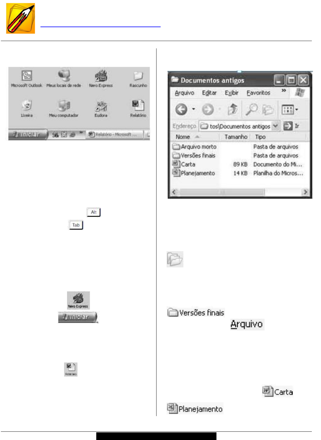 <p>117</p><p>www.1001questoesdeconcurso.com.br</p><p>Quer entrar para lista preferencial para receber mais 1001 QUESTÕES DE CONCURSO</p><p>de outras bancas ou matérias? Sim?! Então, cadastre o seu email no meu site</p><p>www.1001questoesdeconcurso.com.br para receber mais questões e outras surpresas.</p><p>586 - CESPE - 2008 - STJ - ANALISTA</p><p>JUDICIÁRIO</p><p>A figura acima mostra parte da área de trabalho</p><p>de um</p><p>computador que tem como sistema operacional o</p><p>Windows XP.</p><p>Com relação a essa figura e ao Windows XP,</p><p>julgue os itens seguintes.</p><p>Ao se pressionar a tecla e, mantendo-a</p><p>pressionada, se teclar , será aberta a janela</p><p>denominada Gerenciador de tarefas do Windows,</p><p>que permite, entre outras coisas, visualizar uma</p><p>lista dos aplicativos que estão sendo executados</p><p>no computador.</p><p>( ) Certo ( ) Errado</p><p>587 - CESPE - 2008 - STJ - ANALISTA</p><p>JUDICIÁRIO</p><p>Ao se clicar o ícone e, em seguida, se</p><p>clicar o botão , o aplicativo</p><p>associado a esse ícone será iniciado.</p><p>( ) Certo ( ) Errado</p><p>578 - CESPE - 2008 - STJ - ANALISTA</p><p>JUDICIÁRIO</p><p>Ao se clicar o ícone com o botão direito do</p><p>mouse, o arquivo associado a esse ícone será</p><p>aberto.</p><p>( ) Certo ( ) Errado</p><p>588 - CESPE - 2008 - STF - TÉCNICO</p><p>JUDICIÁRIO</p><p>Considerando a figura acima, que mostra uma</p><p>janela do Windows XP, julgue os itens a</p><p>seguir.</p><p>Para se criar uma nova pasta, vazia e</p><p>provisoriamente sem nome, é suficiente clicar</p><p>.</p><p>( ) Certo ( ) Errado</p><p>589 - CESPE - 2008 - STF - TÉCNICO</p><p>JUDICIÁRIO</p><p>Para abrir a pasta associada ao ícone</p><p>, é suficiente clicar esse</p><p>ícone; clicar o menu ; na lista que</p><p>surge em decorrência dessa ação, clicar Abrir.</p><p>( ) Certo ( ) Errado</p><p>590 - CESPE - 2008 - STF - TÉCNICO</p><p>JUDICIÁRIO</p><p>Para iniciar um processo de verificação de</p><p>infecção por vírus de computador dos arquivos</p><p>associados aos ícones e ,</p><p>é suficiente realizar a</p><p>118</p><p>www.1001questoesdeconcurso.com.br</p><p>Quer entrar para lista preferencial para receber mais 1001 QUESTÕES DE CONCURSO</p><p>de outras bancas ou matérias? Sim?! Então, cadastre o seu email no meu site</p><p>www.1001questoesdeconcurso.com.br para receber mais questões e outras surpresas.</p><p>seguinte seqüência de ações: clicar ;</p><p>pressionar e manter pressionada a tecla ;</p><p>clicar ; liberar a tecla ;</p><p>clicar .</p><p>( ) Certo ( ) Errado</p><p>29 - CESPE - 2008 - STF - TÉCNICO</p><p>JUDICIÁRIO</p><p>Para mover o arquivo associado ao ícone</p><p>para a pasta referente ao</p><p>ícone , é suficiente aplicar um clique duplo sobre</p><p>e, em seguida, clicar</p><p>.</p><p>( ) Certo ( ) Errado</p><p>591 - CESPE - 2008 - STF - TÉCNICO</p><p>JUDICIÁRIO</p><p>A tecnologia atualmente disponível permite que o</p><p>arquivo associado ao ícone seja</p><p>armazenado em disquete de 3½".</p><p>( ) Certo ( ) Errado</p><p>592 - CESPE - 2009 - PREFEITURA DE</p><p>IPOJUCA - PE - TODOS OS CARGOS</p><p>Com relação aos ambientes Windows, Internet</p><p>e intranet, julgue os itens a seguir.</p><p>O Windows Explorer é utilizado tanto para acesso</p><p>aos diretórios e arquivos armazenados na</p><p>máquina do usuário como para acesso a áreas</p><p>de armazenamento na rede, caso o computador</p><p>esteja conectado a um ambiente de rede ou à</p><p>Internet.</p><p>( ) Certo ( ) Errado</p><p>593 - CESPE - 2008 - STF - ANALISTA</p><p>JUDICIÁRIO</p><p>A figura acima ilustra uma janela do Windows</p><p>XP, denominada Atividades, que contém uma</p><p>pasta e dois arquivos. Com relação a essa</p><p>figura e ao Windows XP, julgue os itens a</p><p>seguir.</p><p>A seguinte seqüência de ações permite abrir o</p><p>arquivo associado ao ícone : clicar o</p><p>referido ícone; clicar o menu Arquivo; na lista de</p><p>opções disponibilizadas, clicar a opção Abrir.</p><p>( ) Certo ( ) Errado</p><p>594 - CESPE - 2008 - STF - ANALISTA</p><p>JUDICIÁRIO</p><p>Ao se clicar o ícone e, em seguida,</p><p>se clicar , o ícone será</p><p>reposicionado, passando a ser exibido entre os</p><p>ícones e .</p><p>( ) Certo ( ) Errado</p>