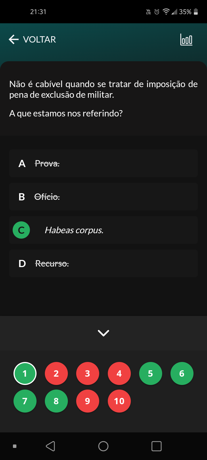 21:31 35% VOLTAR 000 Não é cabível quando se tratar de imposição de pena de exclusão de militar. A que estamos nos referindo? A Prova. Ofício. C Habeas corpus. D Recurso. 1 2 3 4 5 6 7 8 9 10