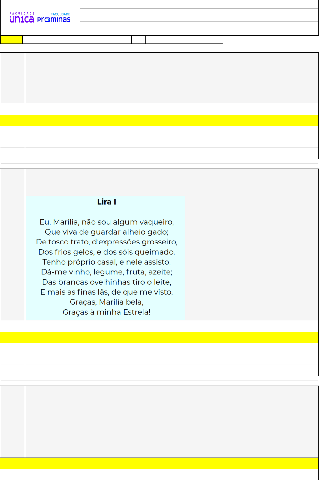 <p>30/09/2024 09:04:26 1/3</p><p>REVISÃO DE SIMULADO</p><p>Nome:</p><p>DÉBORA OLIVEIRA ARAÚJO</p><p>Disciplina:</p><p>Literatura Brasileira</p><p>Respostas corretas são marcadas em amarelo X Respostas marcardas por você.</p><p>Questão</p><p>001 (MS CONCURSOS - 2020 - Professor II/adaptada)</p><p>“Visão antropocêntrica, Busca pelo equilíbrio, Pastoralismo, Bucolismo, Influência da</p><p>cultura grecolatina, Convencionalismo amoroso, Influência das ideias iluministas,</p><p>Contraste entre o ambiente urbano e o campestre”.</p><p>Estas são algumas características do</p><p>A) Romantismo.</p><p>X B) Arcadismo.</p><p>C) Modernismo.</p><p>D) Barroco.</p><p>E) Pré-modernismo.</p><p>Questão</p><p>002 (UFRR) Leia o poema de Tomás Antônio Gonzaga, transcrito a seguir, e marque a</p><p>alternativa que aponta três características do Arcadismo brasileiro que nele podem ser</p><p>observadas.</p><p>A) Denúncia social; exaltação da vida no campo; temas urbanos.</p><p>X B) Exaltação da vida no campo; linguagem simples; pastoralismo.</p><p>C) Vulgarização da figura da mulher; medievalismo; egocentrismo.</p><p>D) Temas urbanos; linguagem simples; medievalismo.</p><p>E) Egocentrismo; pastoralismo; denúncia social.</p><p>Questão</p><p>003 (UFRS). Considere as seguintes afirmações sobre o Barroco brasileiro:</p><p>I. A arte barroca caracteriza-se por apresentar dualidades, conflitos, paradoxos e</p><p>contrastes, que convivem tensamente na unidade da obra.</p><p>II. O conceptismo e o cultismo, expressões da poesia barroca, apresentam um</p><p>imaginário bucólico, sempre povoado de pastoras e ninfas.</p><p>III. A oposição entre Reforma e Contrarreforma expressa, no plano religioso, os mesmos</p><p>dilemas de que o Barroco se ocupa.</p><p>Quais estão corretas:</p><p>X A) Apenas I e III.</p><p>B) Apenas I.</p><p>30/09/2024 09:04:26 2/3</p><p>C) Apenas II.</p><p>D) I, II e III.</p><p>E) Apenas III.</p><p>Questão</p><p>004 (UFSCar)</p><p>Embora muito distantes entre si na linha do tempo, os textos aproximam-se, pois o</p><p>ideal que defendem é:</p><p>A) o aproveitamento do dia presente – o carpe diem-, pois o tempo passa rapidamente.</p><p>B) o uso da emoção em detrimento da razão, pois esta retira do homem seus melhores</p><p>sentimentos.</p><p>C) a dedicação à produção poética junto à natureza, fonte de inspiração dos poetas.</p><p>D) o desejo de enriquecer no campo, aproveitando as riquezas naturais.</p><p>X E) o sonho de uma vida mais simples e natural, distante dos centros urbanos.</p><p>Questão</p><p>005 (MS CONCURSOS - 2020 - Prefeitura de Corumbiara /adaptada)</p><p>O Arcadismo, que difere do Barroco em várias características, sendo a central a</p><p>concepção de uma razão que legitima o status de verdade.</p><p>São representantes do Arcadismo:</p><p>A) Alvarenga Peixoto e Gregório de Matos Guerra.</p><p>X B) Tomás Antônio Gonzaga e Cláudio Manoel da Costa.</p><p>C) Castro Alves e Silva Alvarenga.</p><p>D) Tomás Antônio Gonzaga e Álvares de Azevedo.</p><p>E) Álvares de Azevedo e Cláudio Manoel da Costa.</p><p>Questão</p><p>006 (UFRN) A obra de Gregório de Matos – autor que se destaca na literatura barroca</p><p>brasileira – compreende:</p><p>A) poesia lírica e teatro de costumes.</p><p>B) poesia satírica e contos burlescos.</p><p>30/09/2024 09:04:26 3/3</p><p>C) poesia épico-amorosa e obras dramáticas.</p><p>X D) poesia lírica, de caráter religioso e amoroso, e poesia satírica.</p><p>E) poesia confessional e autos religiosos.</p><p>Questão</p><p>007 (FEI-SP)</p><p>O soneto abaixo transcrito pertence à obra de Gregório de Matos Guerra. Leia-o com</p><p>atenção:</p><p>Ofendi-vos, Meu Deus, bem é verdade,</p><p>É verdade, meu Deus, que hei delinquido,</p><p>Delinquido vos tenho e ofendido,</p><p>Ofendido vos tem minha maldade.</p><p>Maldade, que encaminha a vaidade,</p><p>Vaidade, que todo me há vencido;</p><p>Vencido quero ver-me e arrependido,</p><p>Arrependido a tanta enormidade.</p><p>Arrependido estou de coração,</p><p>De coração vos busco, dai-me os braços,</p><p>Abraços, que me rendem vossa luz.</p><p>Luz, que claro me mostra a salvação,</p><p>A salvação, pretendo em tais abraços,</p><p>Misericórdia, amor, Jesus, Jesus.</p><p>Agora, responda: Gregório de Matos Guerra escreveu:</p><p>A) apenas poesia satírica.</p><p>B) poesia lírica e satírica.</p><p>X C) poesia lírica, religiosa e amorosa, e sátiras.</p><p>D) apenas poesia sacra.</p><p>E) apenas poesia lírica.</p><p>Questão</p><p>008 (UFV) Leia o texto:</p><p>Goza, goza da flor da mocidade, Que o tempo trota a toda ligeireza,</p><p>E imprime em toda flor sua pisada.</p><p>Oh, não aguardes, que a madura idade</p><p>Te converta essa flor, essa beleza,</p><p>Em terra, em cinza, em pó, em sombra, em nada.</p><p>(Gregório de Matos)</p><p>Os tercetos acima ilustram:</p><p>A) caráter de jogo verbal próprio da poesia lírica do séc. XVI, sustentando uma crítica à</p><p>preocupação feminina com a beleza.</p><p>B) as características de um romântico, porque fala de flores, terra, sombras.</p><p>C) estilo pedagógico da poesia neoclássica, ratificando as reflexões do poeta sobre as</p><p>mulheres maduras.</p><p>D) uma poesia que fala de uma existência mais materialista do que espiritual, própria da</p><p>visão de mundo nostálgico-cultista.</p><p>X E) jogo metafórico do Barroco, a respeito da fugacidade da vida, exaltando gozo do</p><p>momento.</p>
